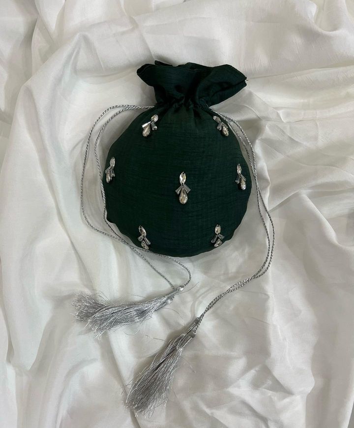 Luxury designer attire with heavy rhinestone handwork in black 9000 velvet paired with beautiful velvet bottom & musoori/tissue dupatta & the most attractive potli bag free.