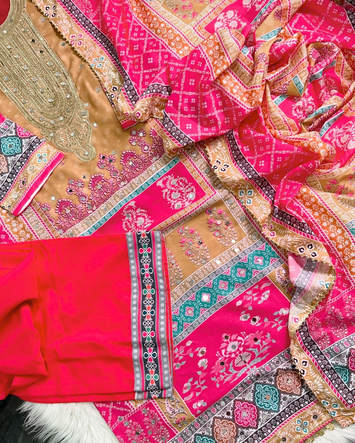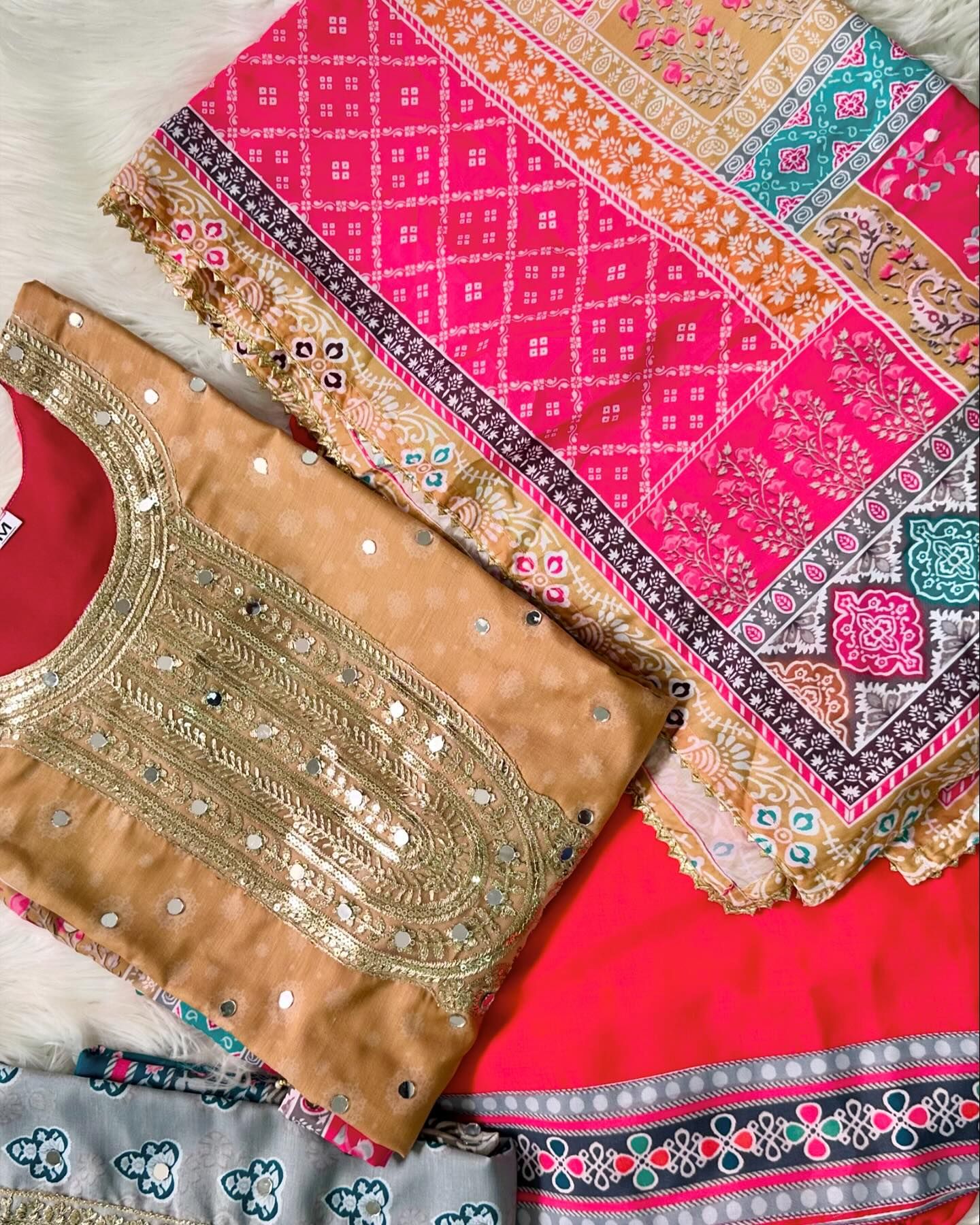 DUPATTA DETAILS: MASLIN WITH PRINT AND SAMOSA LACE WOTK ON DUPATTA (2.2 mtr)