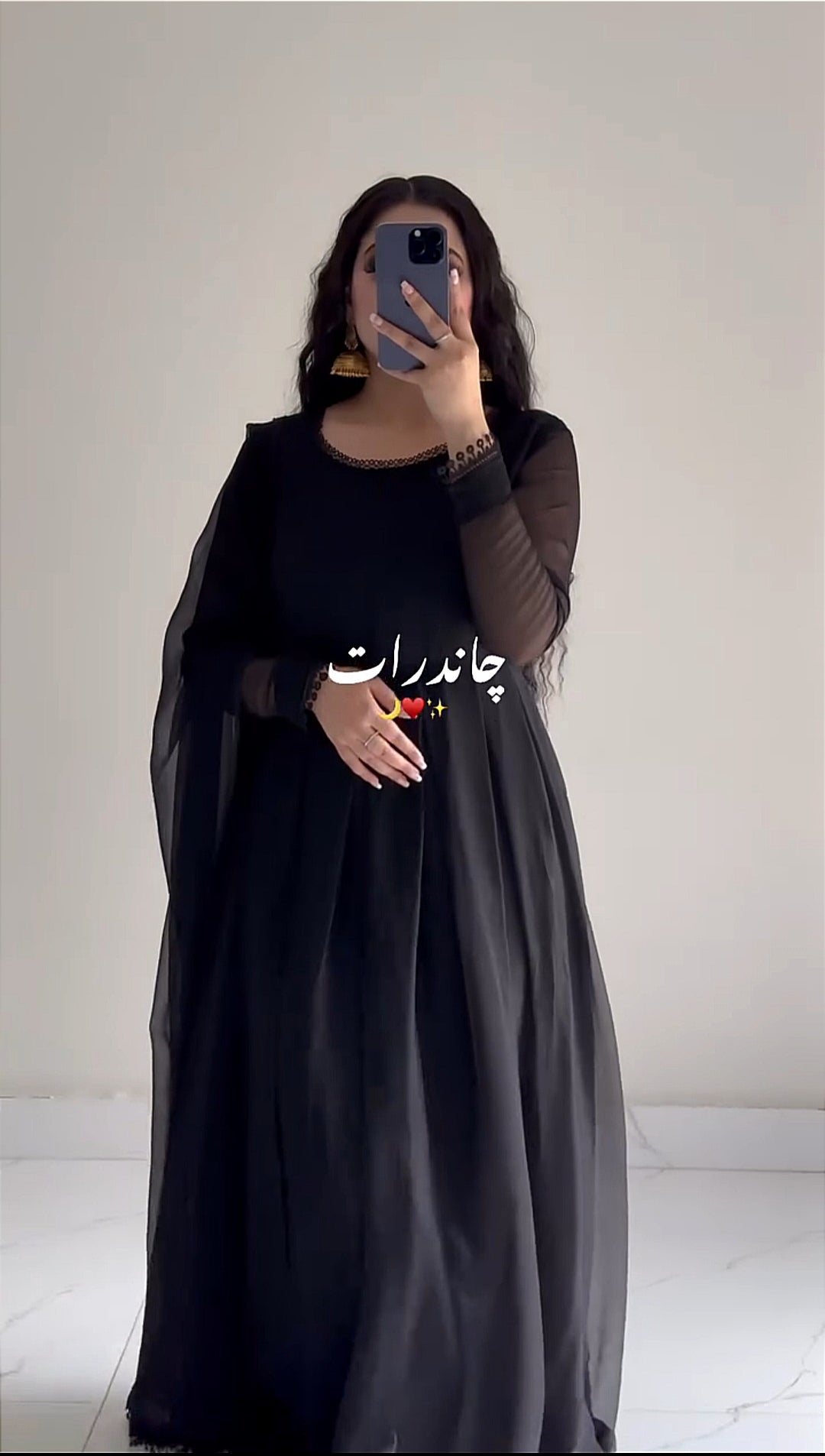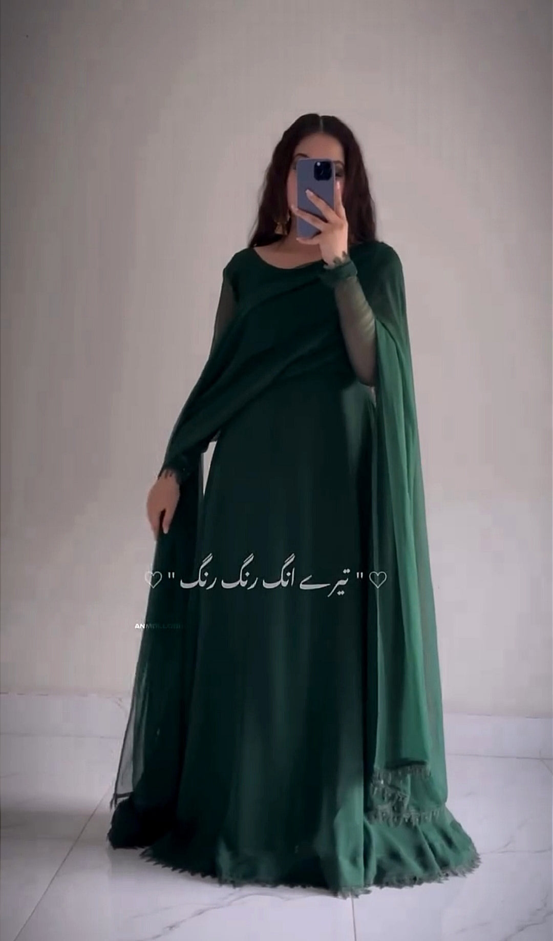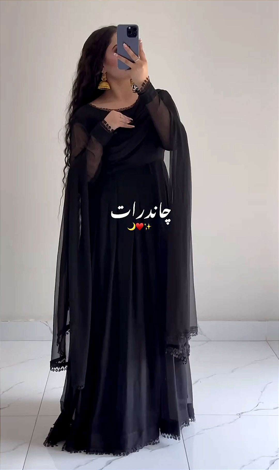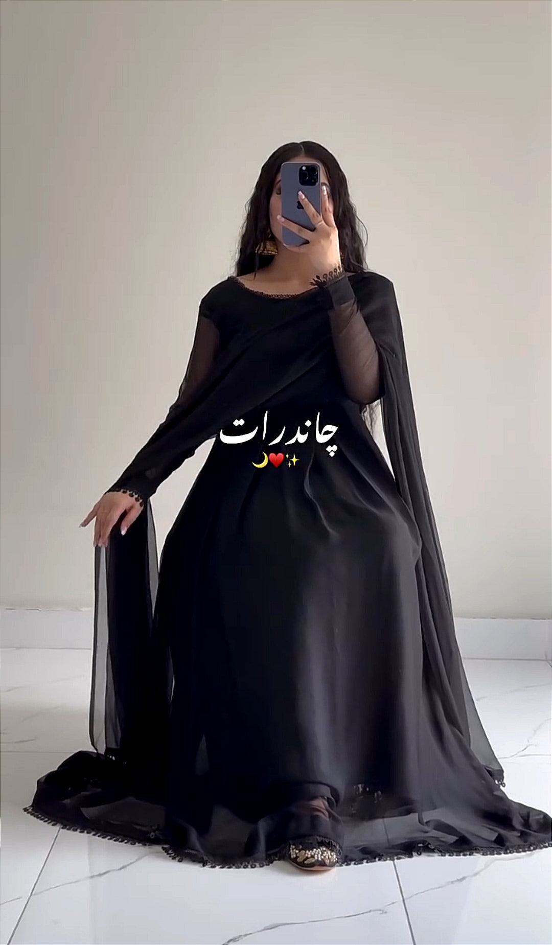 Luxurious heavy georgette anarkali set wih beautiful latkans on back paired with bottom & dupatta with heavy embroidered lace work on sleeves, flair, neck & dupatta.