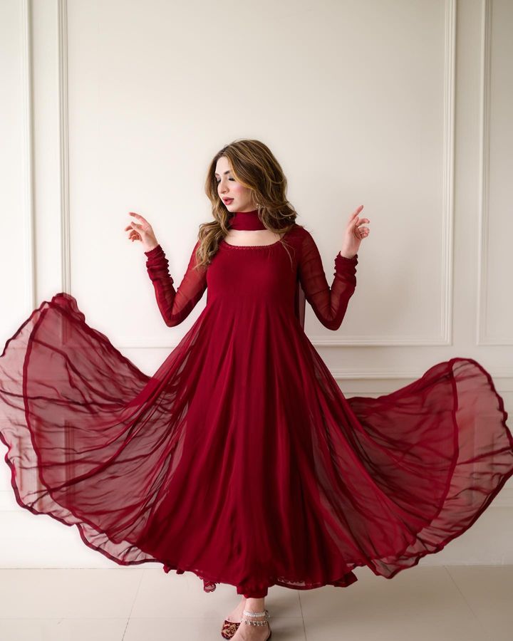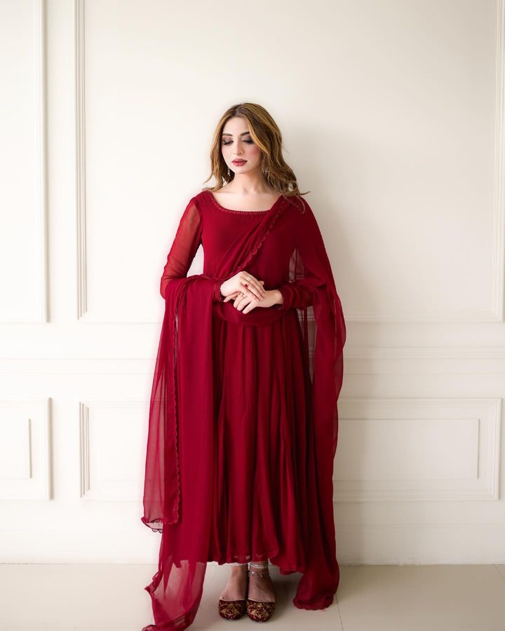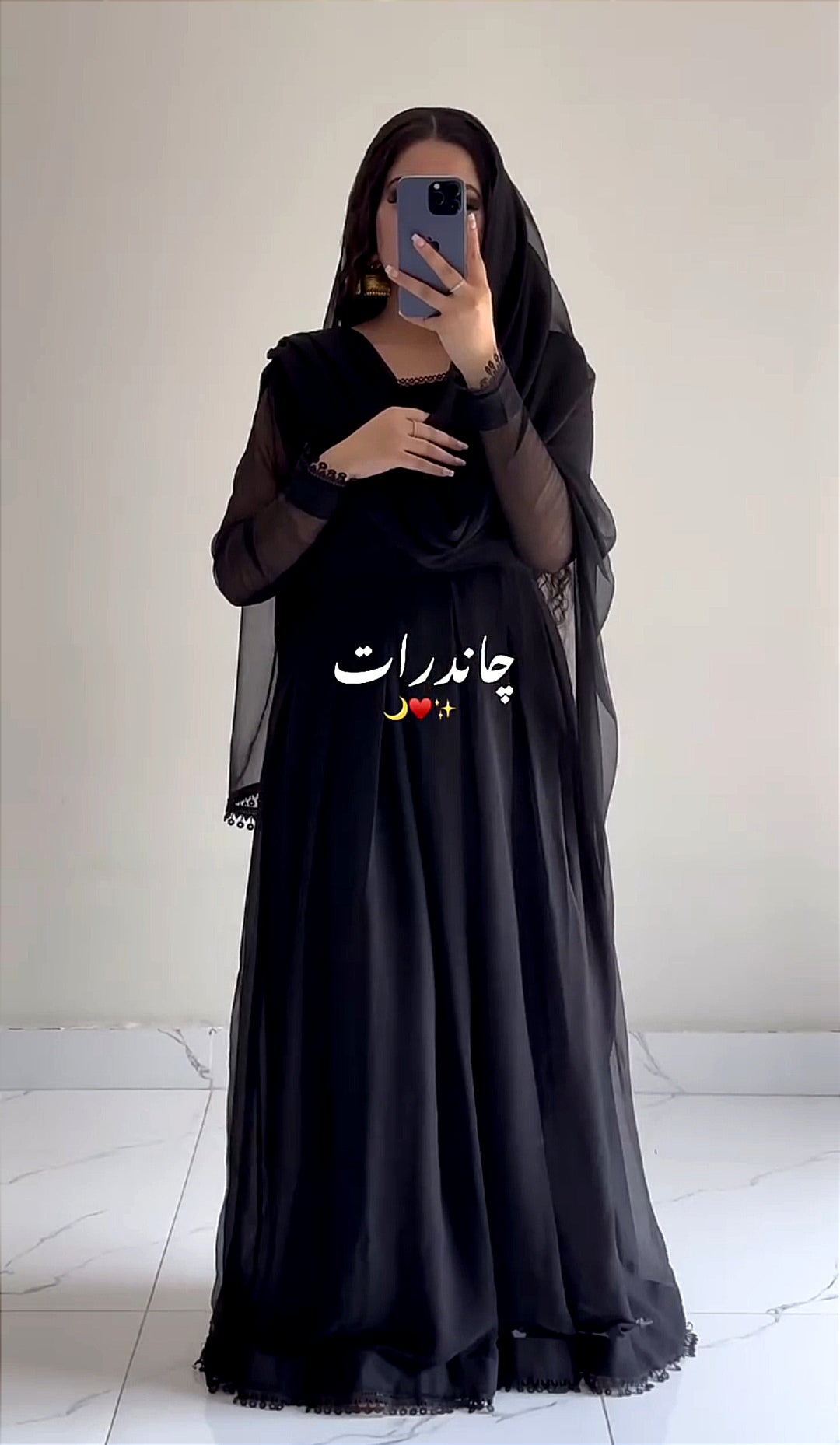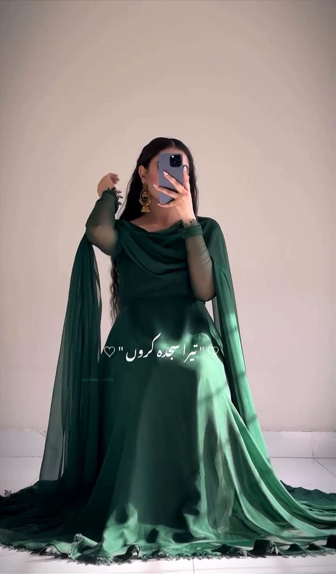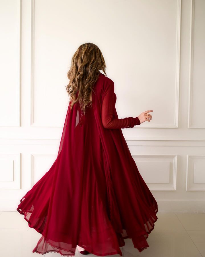 Luxurious heavy georgette anarkali set wih beautiful latkans on back paired with bottom & dupatta with heavy embroidered lace work on sleeves, flair, neck & dupatta.
