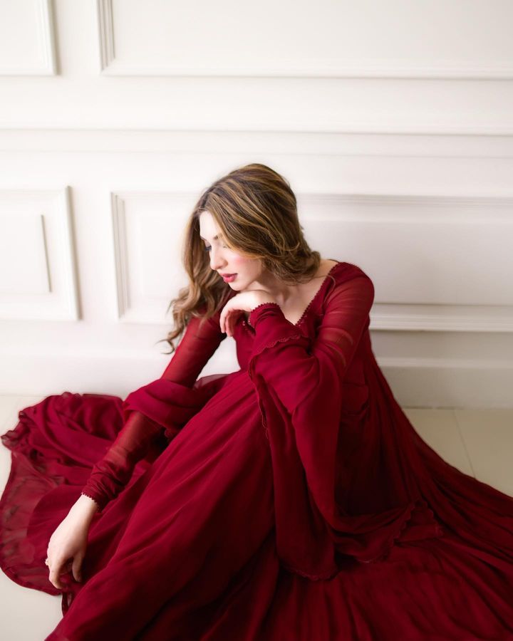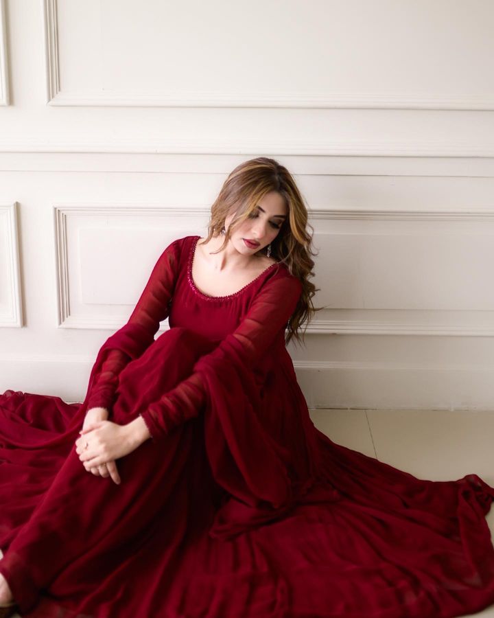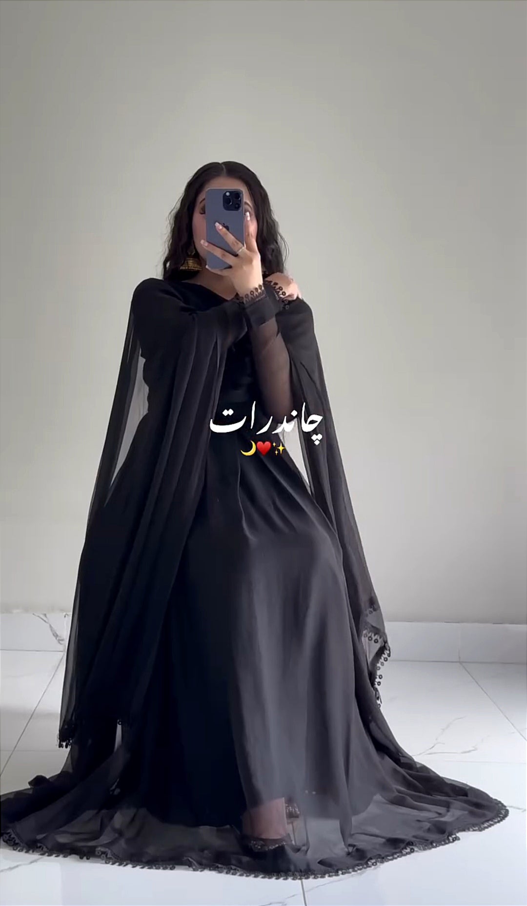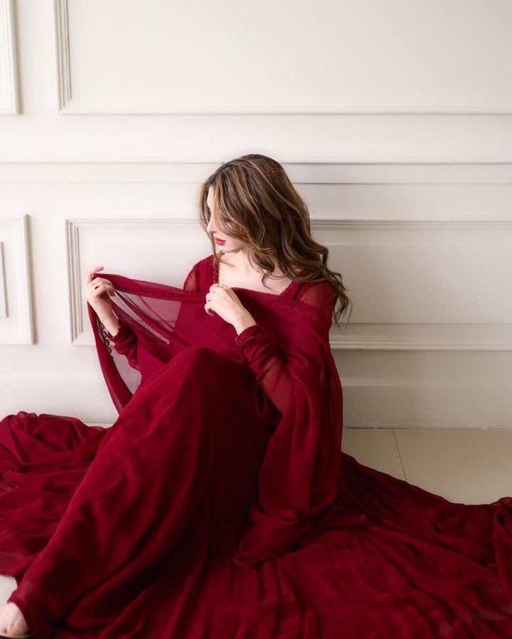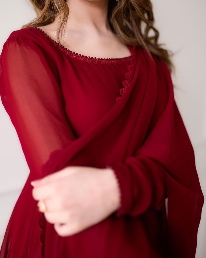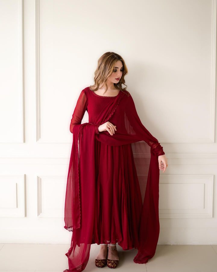 Luxurious heavy georgette anarkali set wih beautiful latkans on back paired with bottom & dupatta with heavy embroidered lace work on sleeves, flair, neck & dupatta.