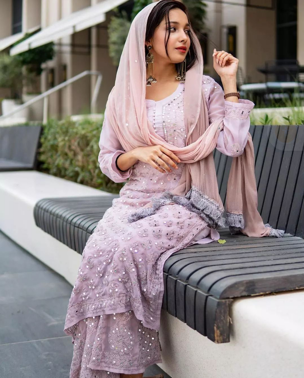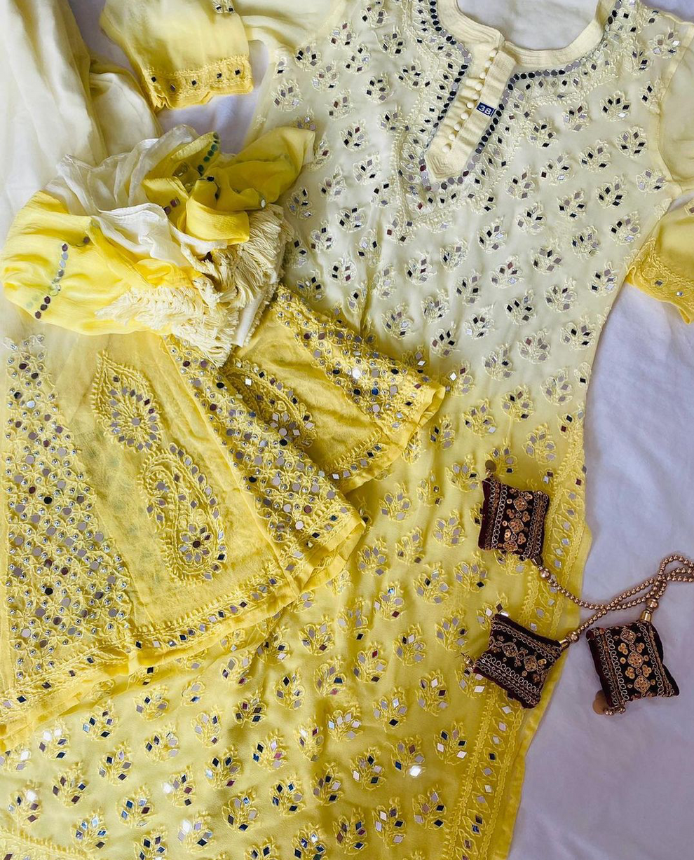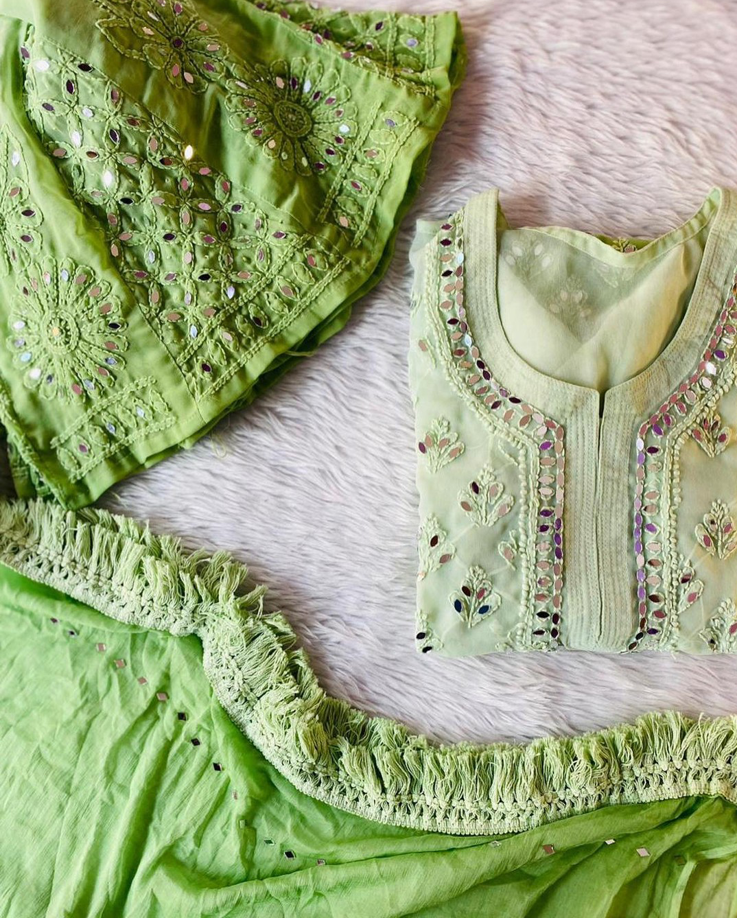 Ombre shaded heavy embroidery with real mirror work top with slip and attached with beautiful plazo & dupatta with mirror and lace work.