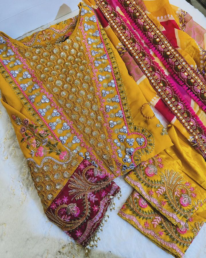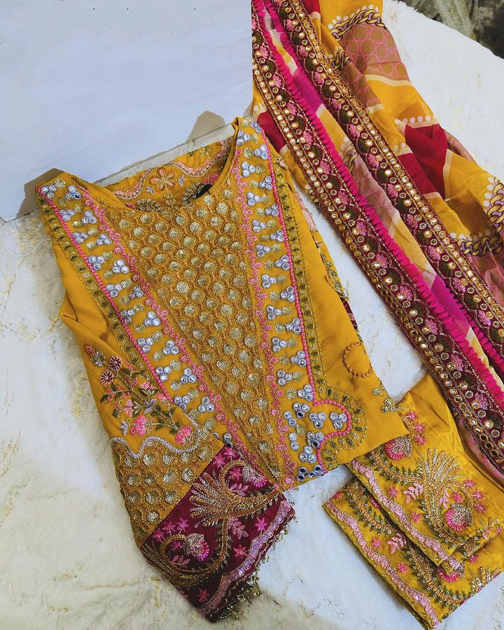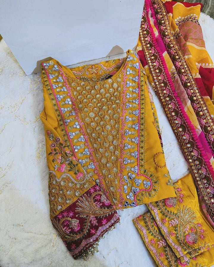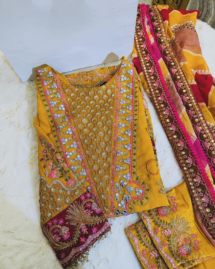 Georgette Embroidered very beautiful mustard top with panni work and lace for daaman border