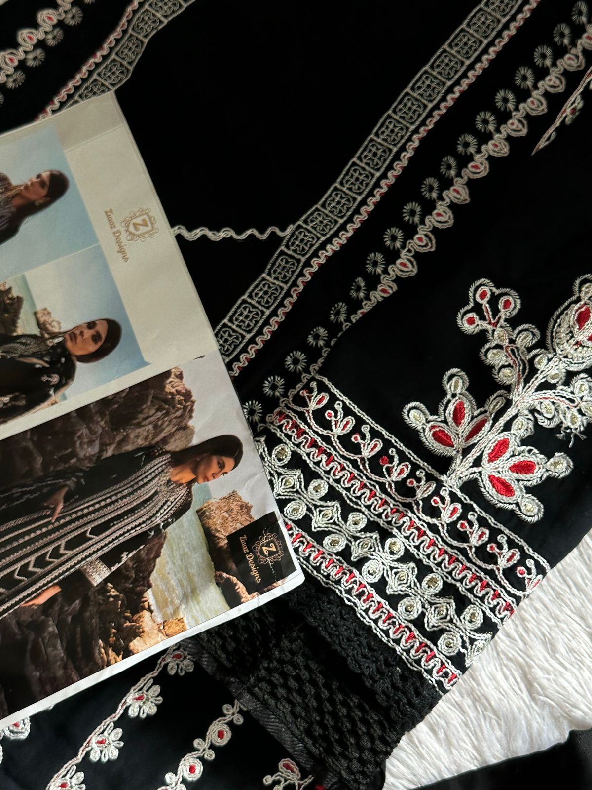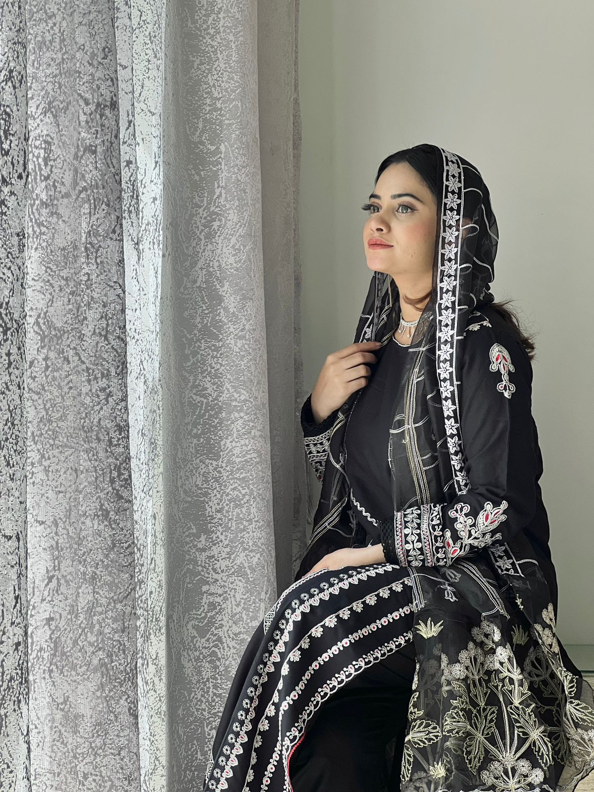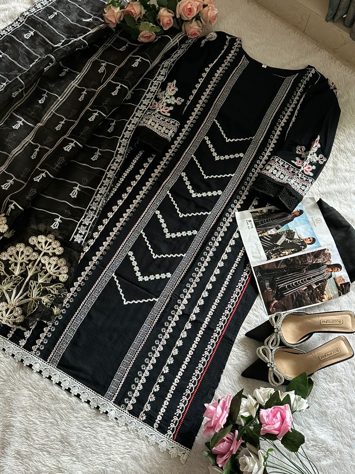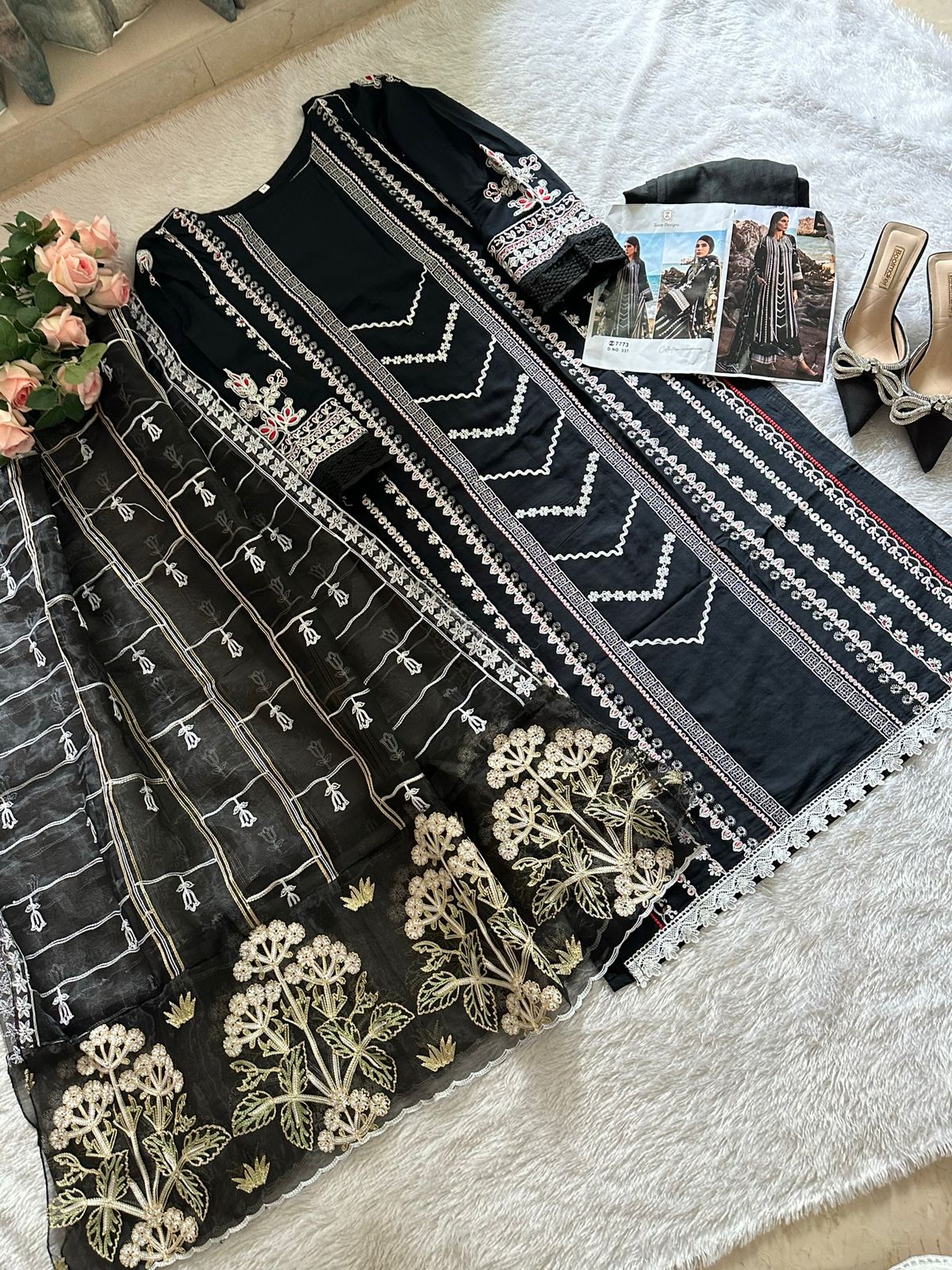 Rayon Self embroidered very beautiful black shade outfit, unstitched rayon bottoms and Heavy embrdroidered Organza dupatta.