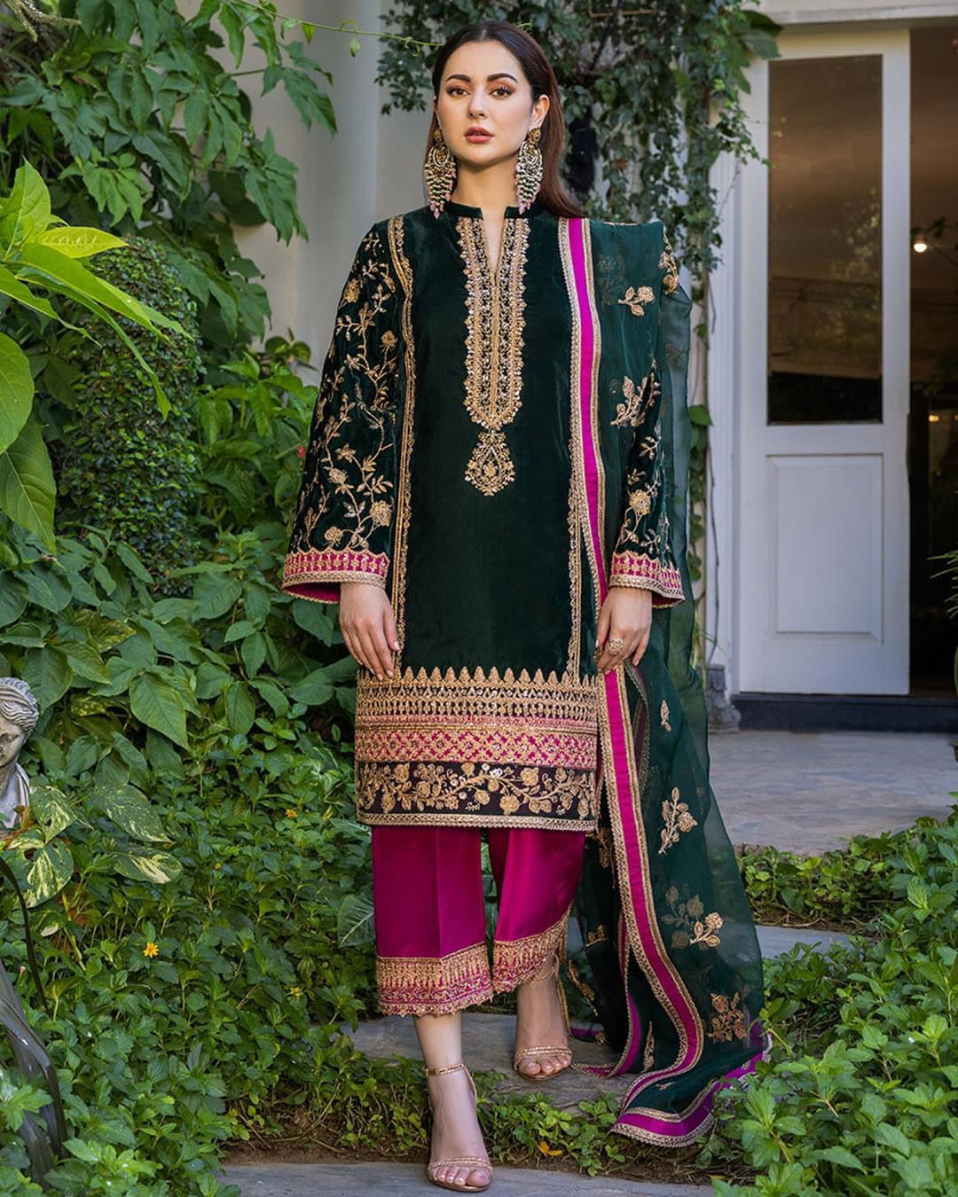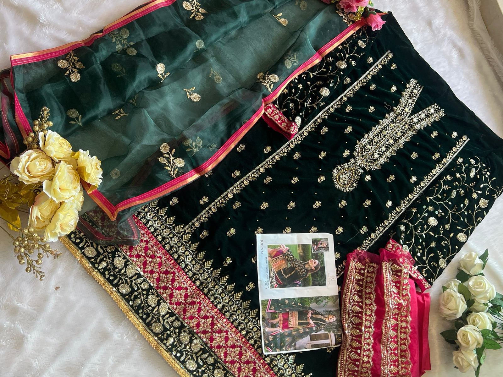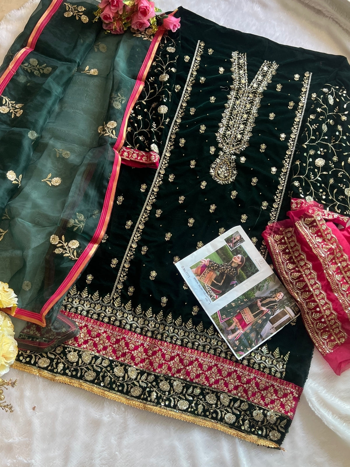 Velvet embroidered mirror work semi stitched kameez with unstitched santoon bottoms with embroidery patch Organza heavy work embroidered dupatta with lace.