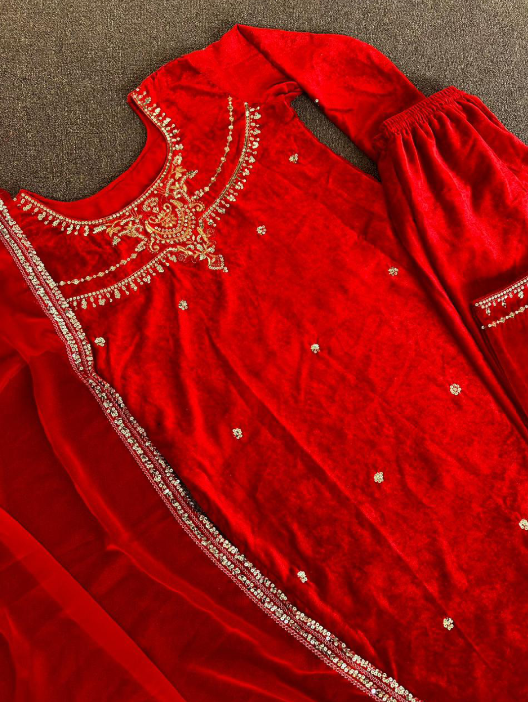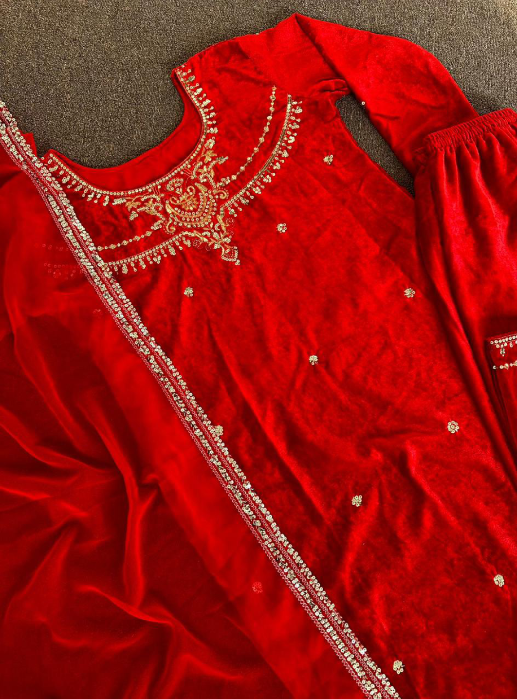 PRESERNTING NEW WINTER COLLECTION VELVET SUIT IN EMBROIDERY 5mm SEQUENCE TOP BOTTOM WITH DUPATTA