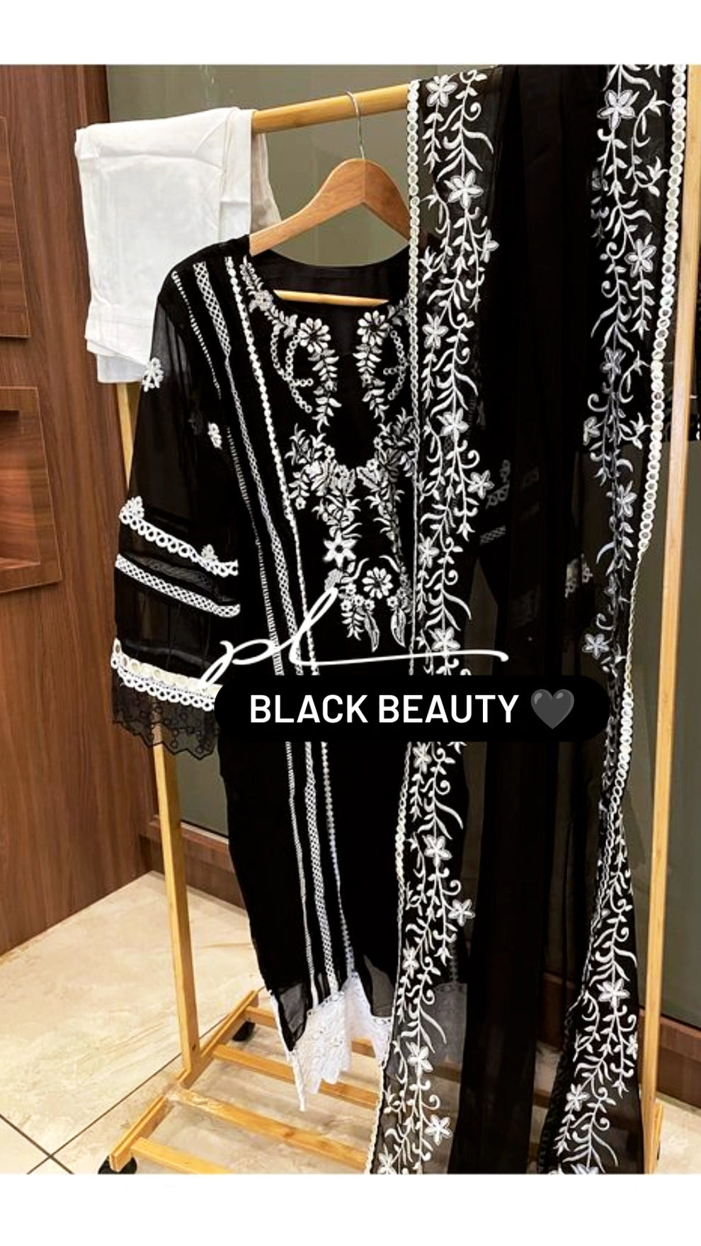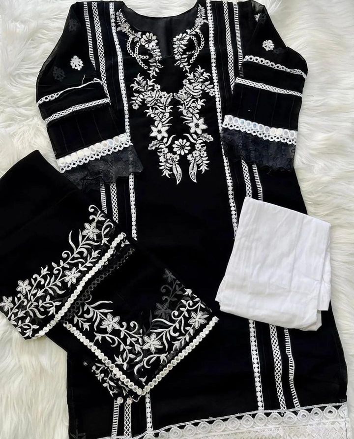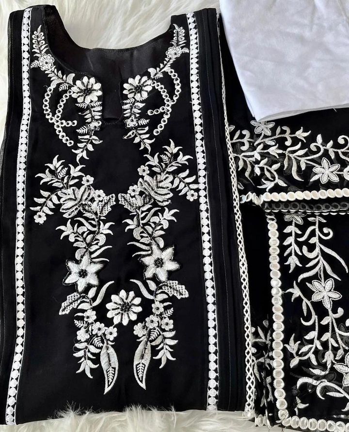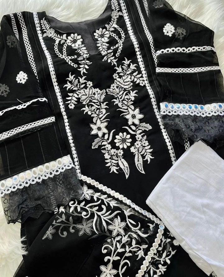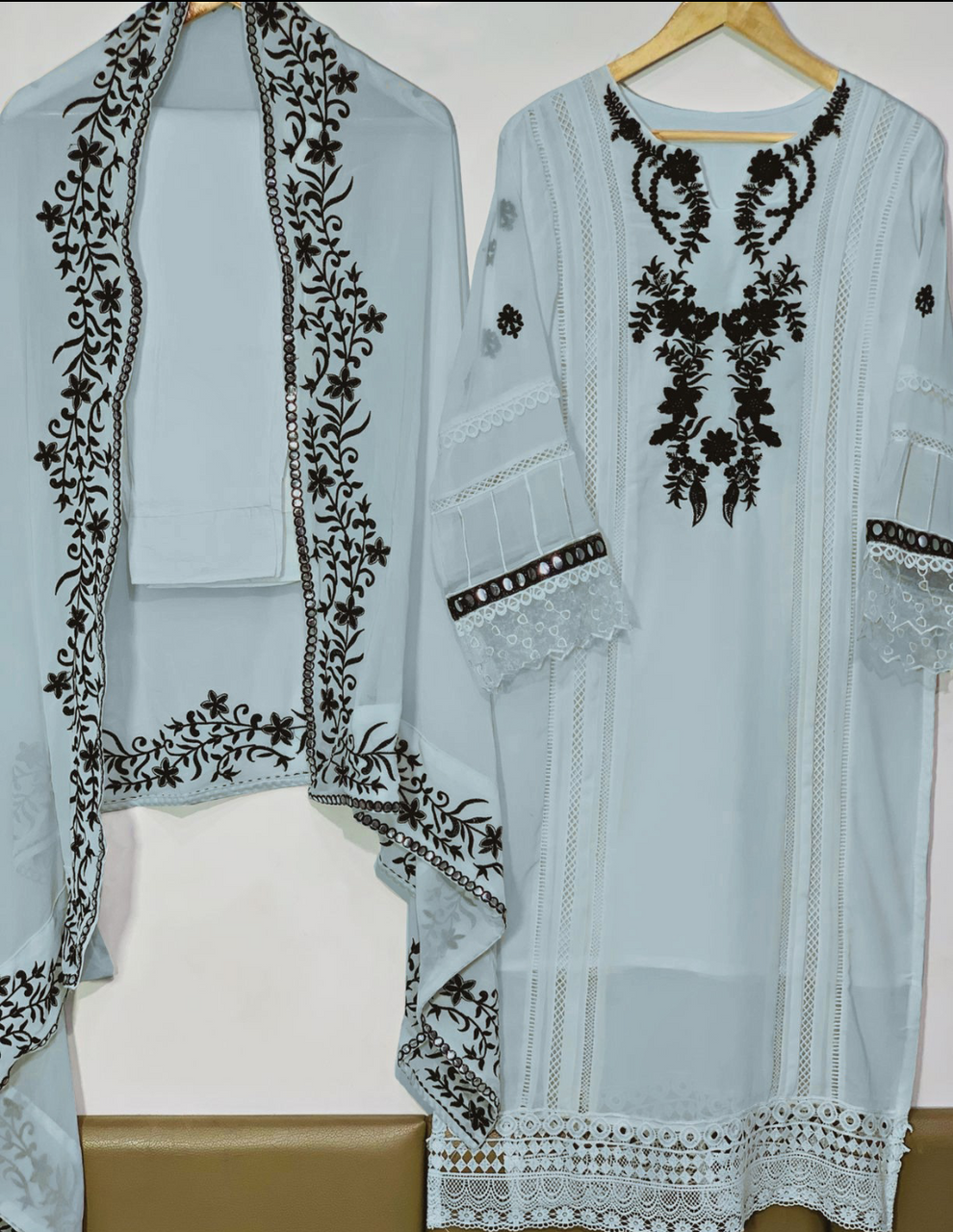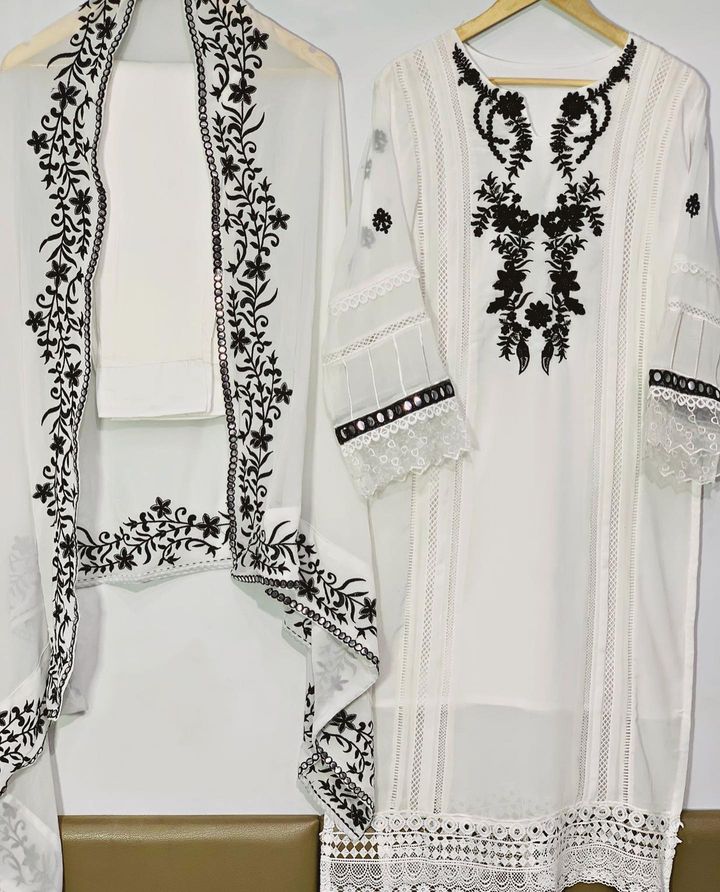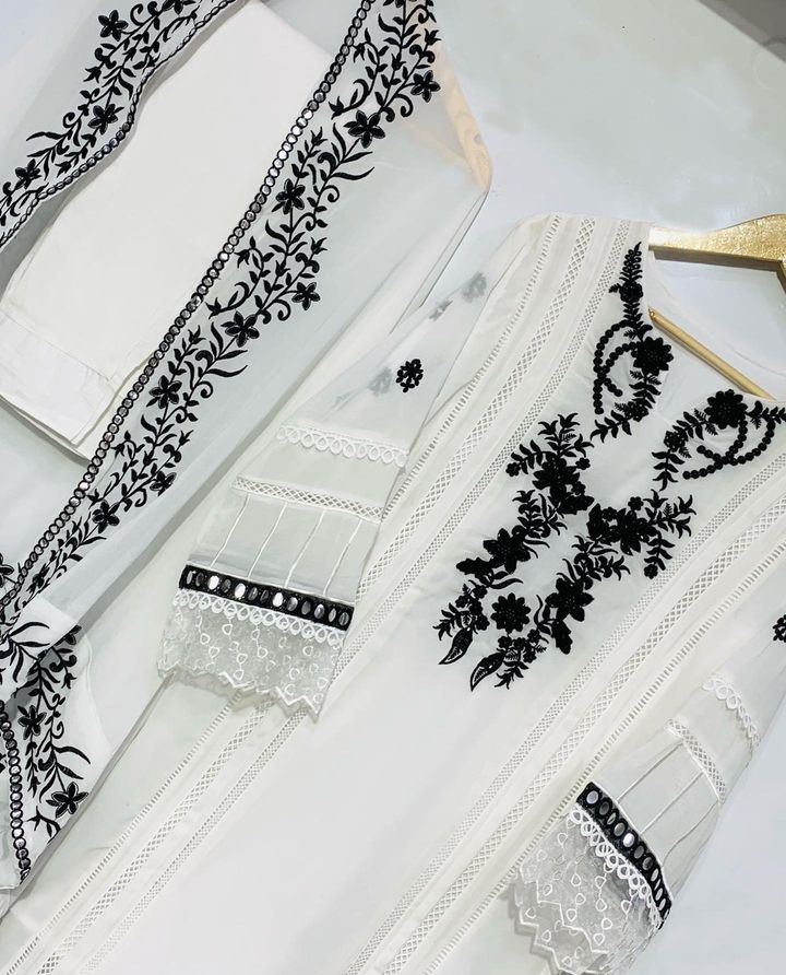 Solid White & Black combination embroidery with mirrior work and handwork on it with beautiful laces looks a like a perfect pakistani pair paired with Duppata with border mirror embroidery