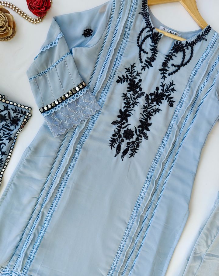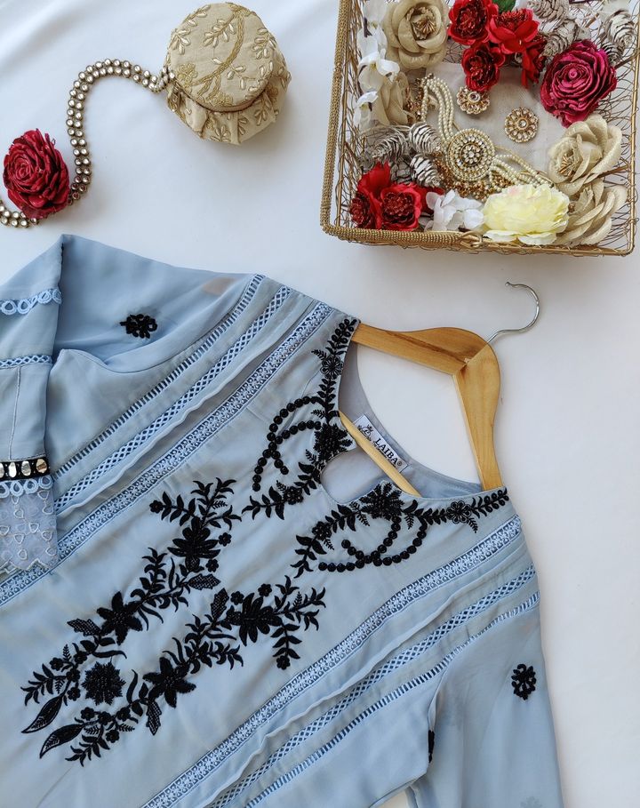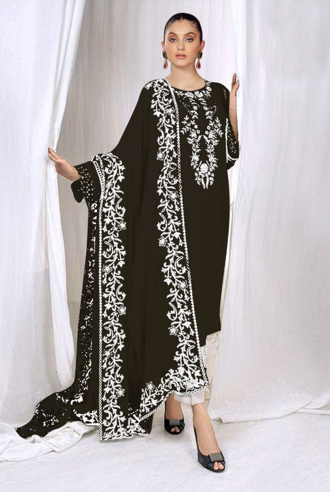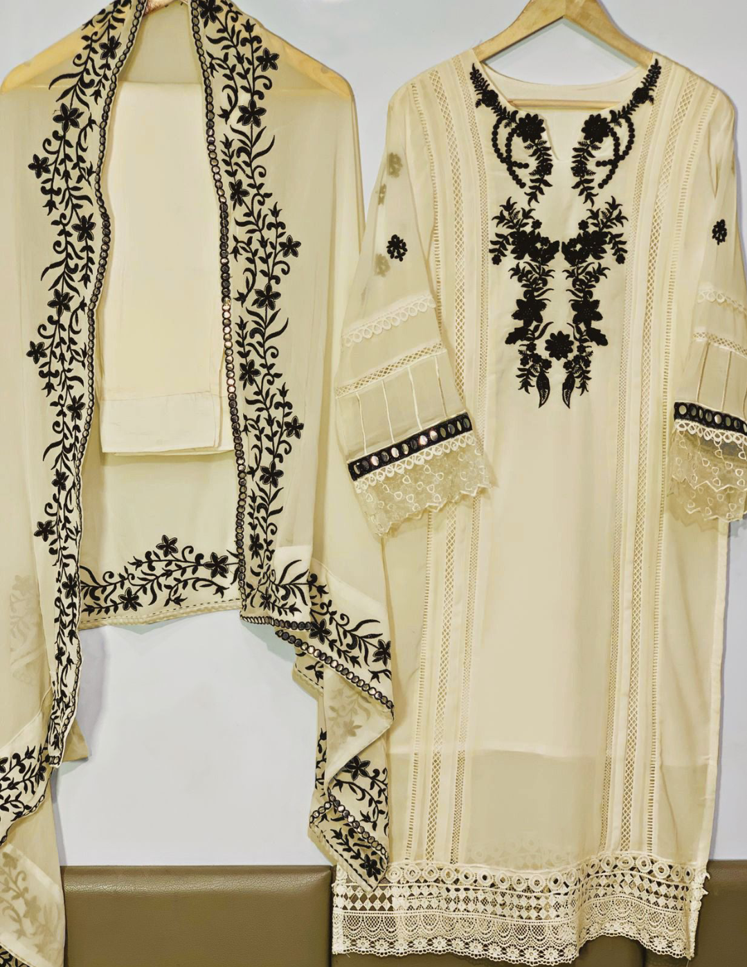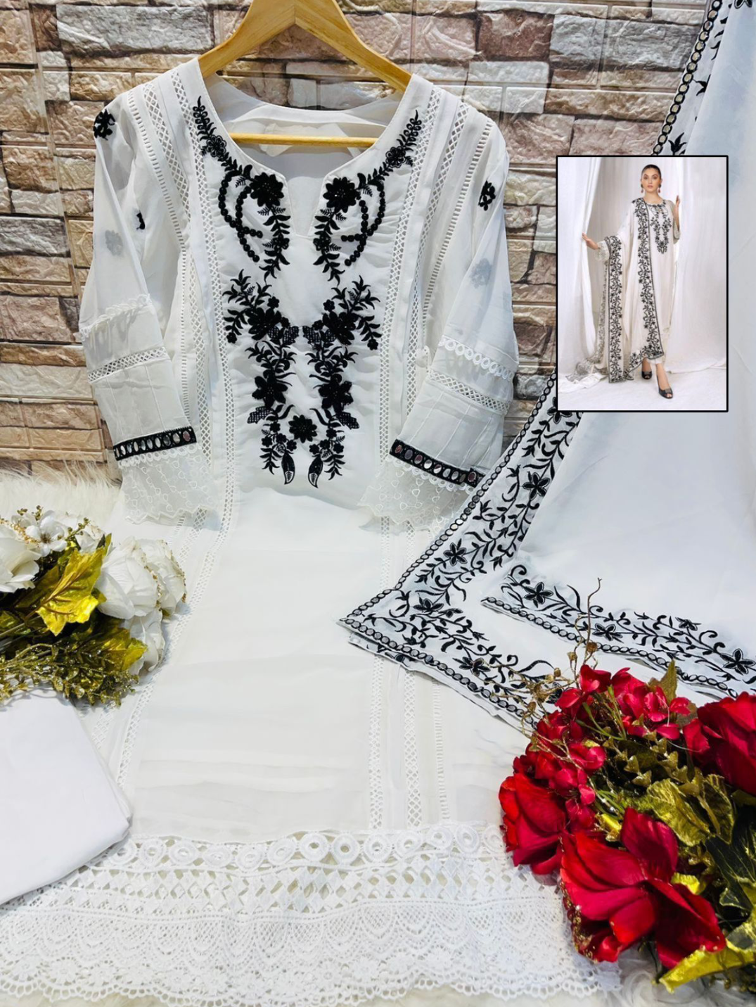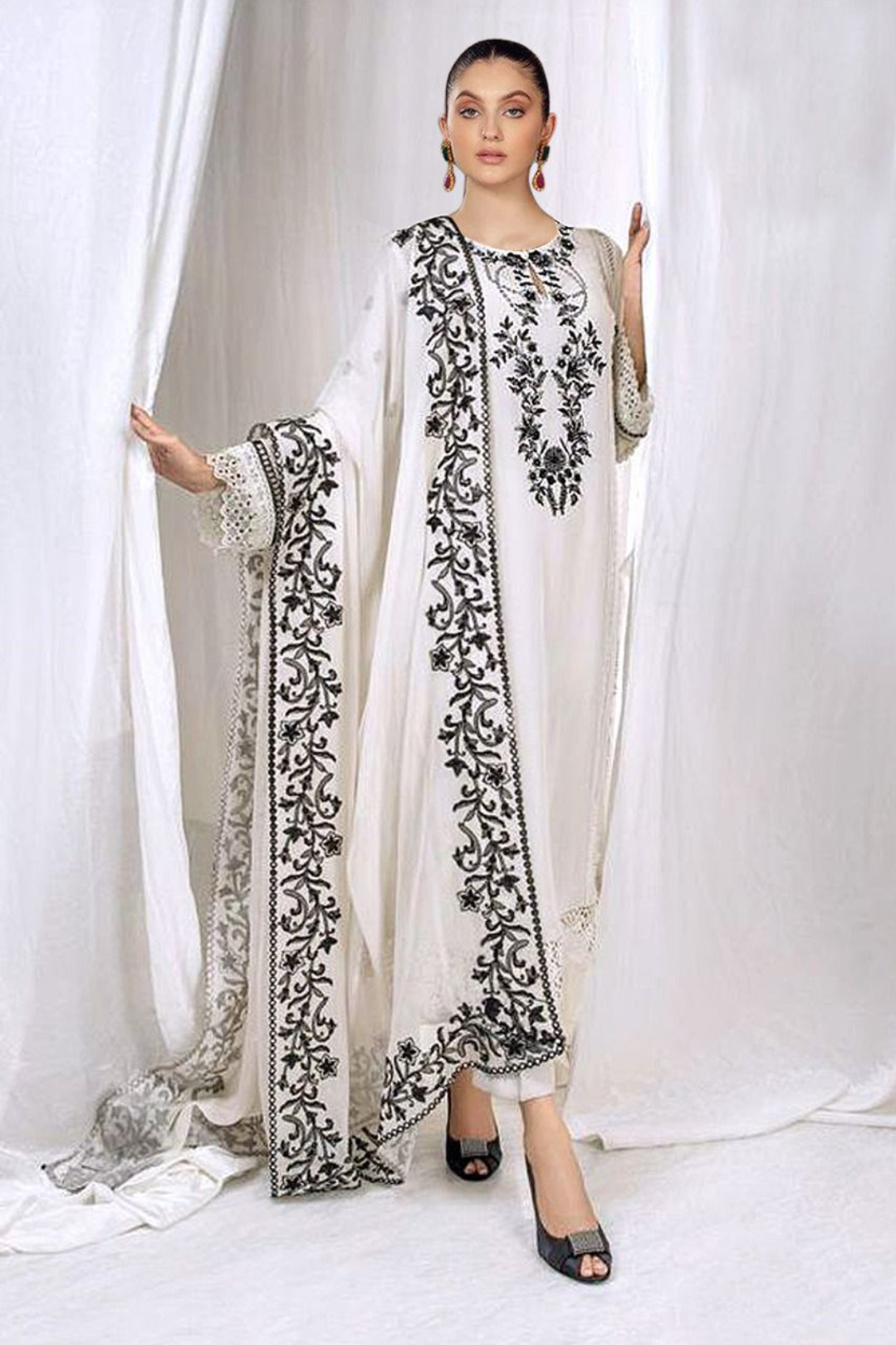 Solid White & Black combination embroidery with mirrior work and handwork on it with beautiful laces looks a like a perfect pakistani pair paired with Duppata with border mirror embroidery