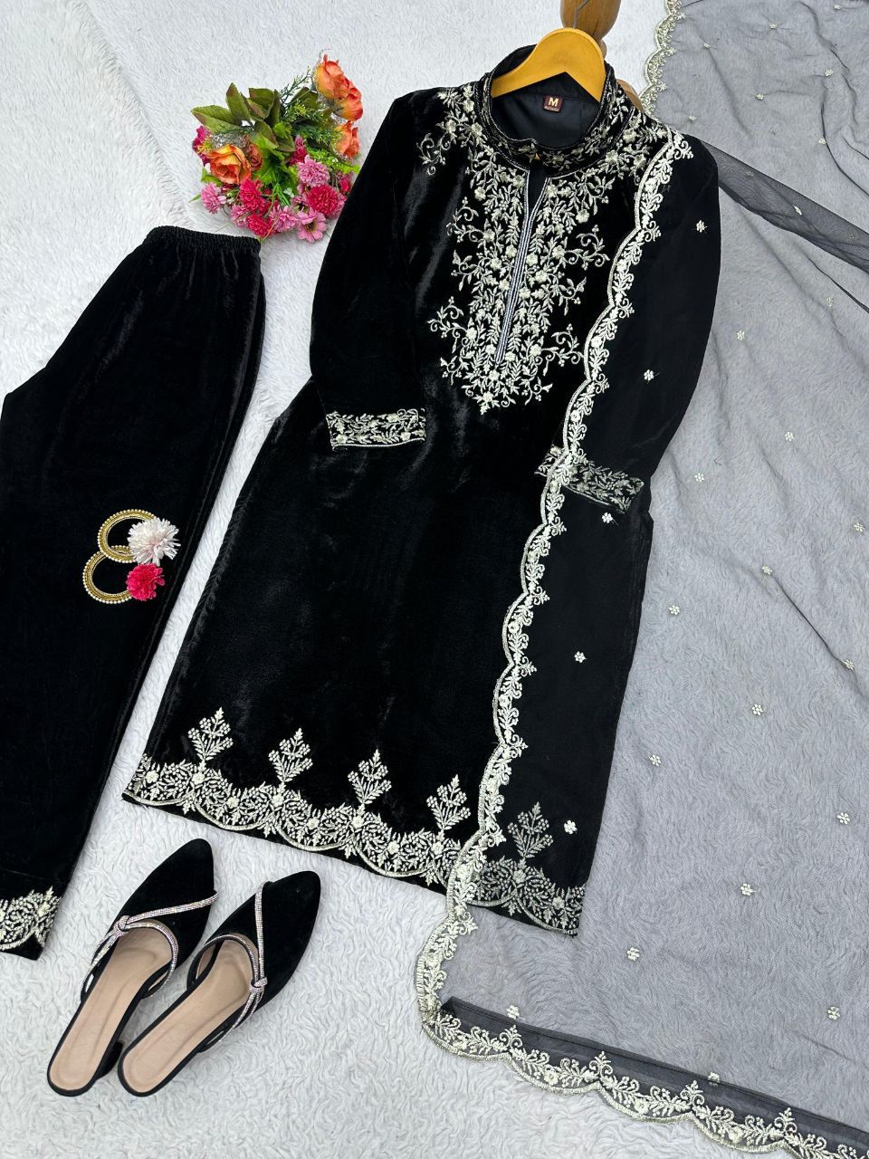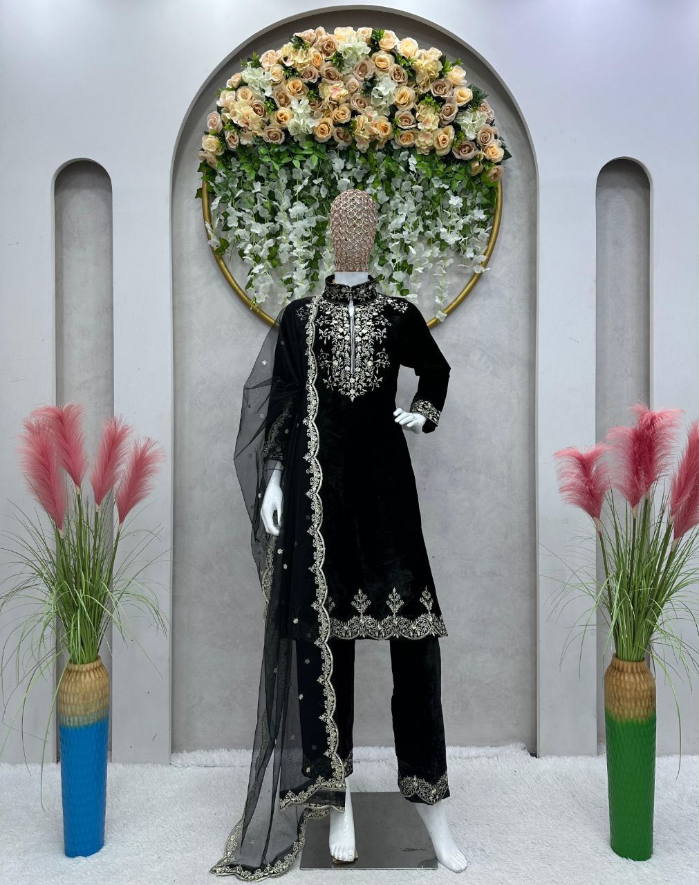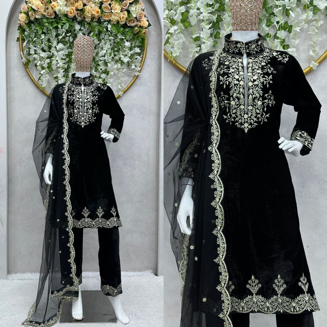 Looking for this same colour beautiful Designer Suit On havy Velvet febric with inner and Thred work and prnt on also Velvet febric with Thred Febric and Dupatta on Soft Net Febric With Thred Work.