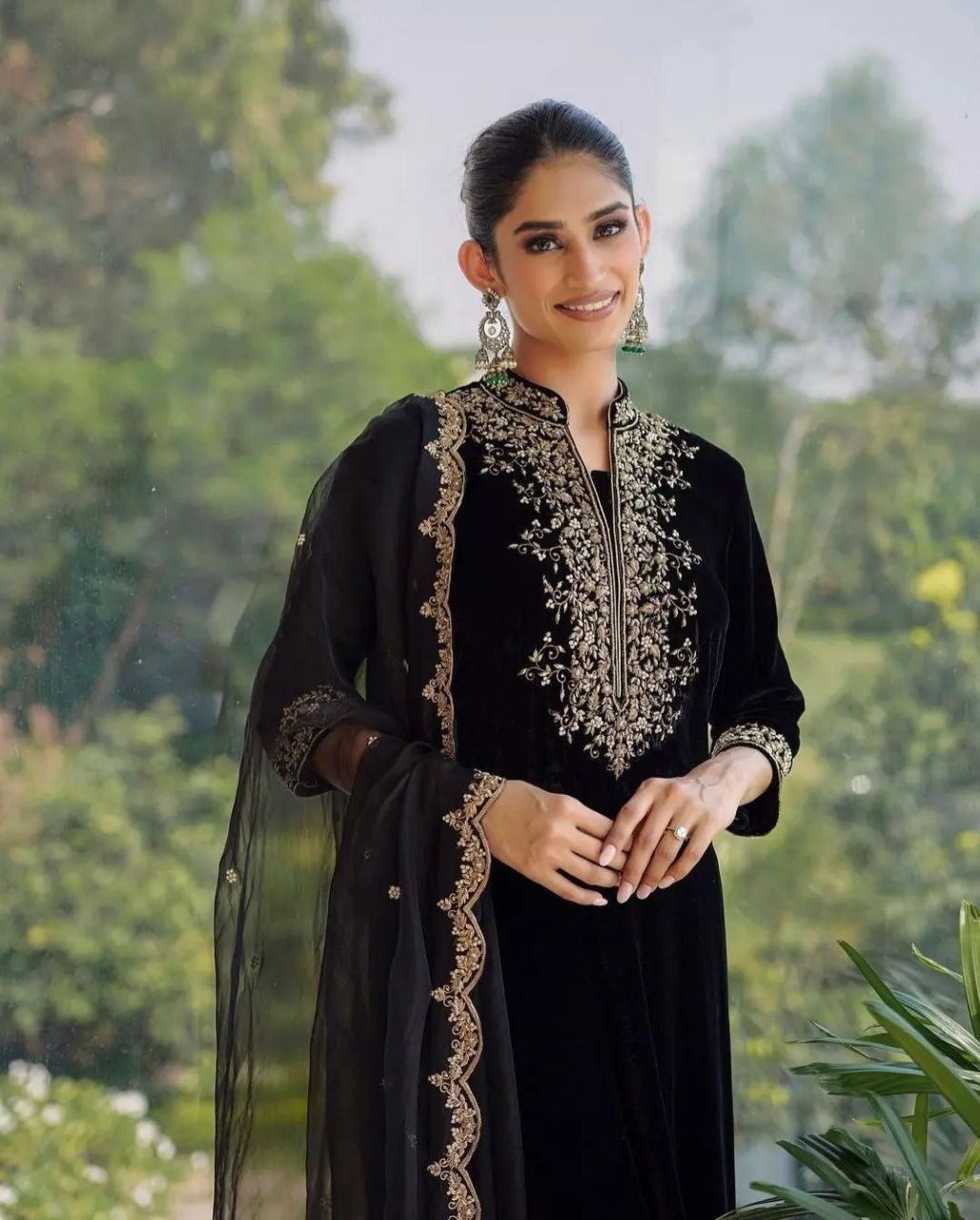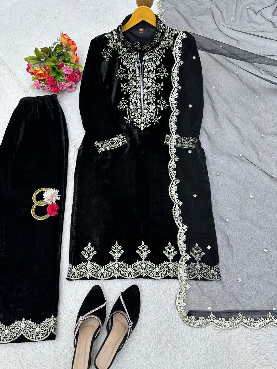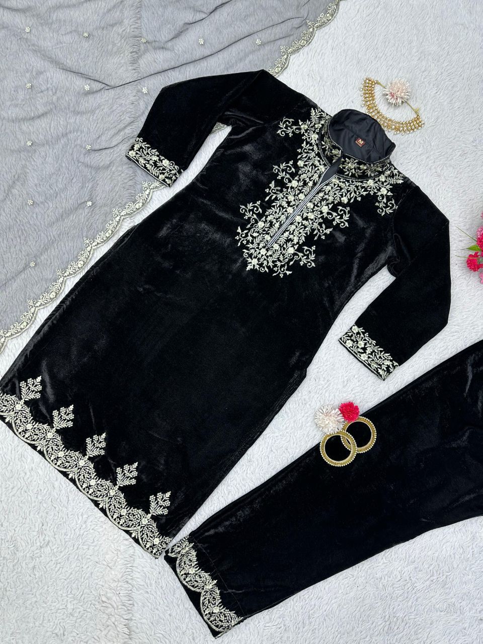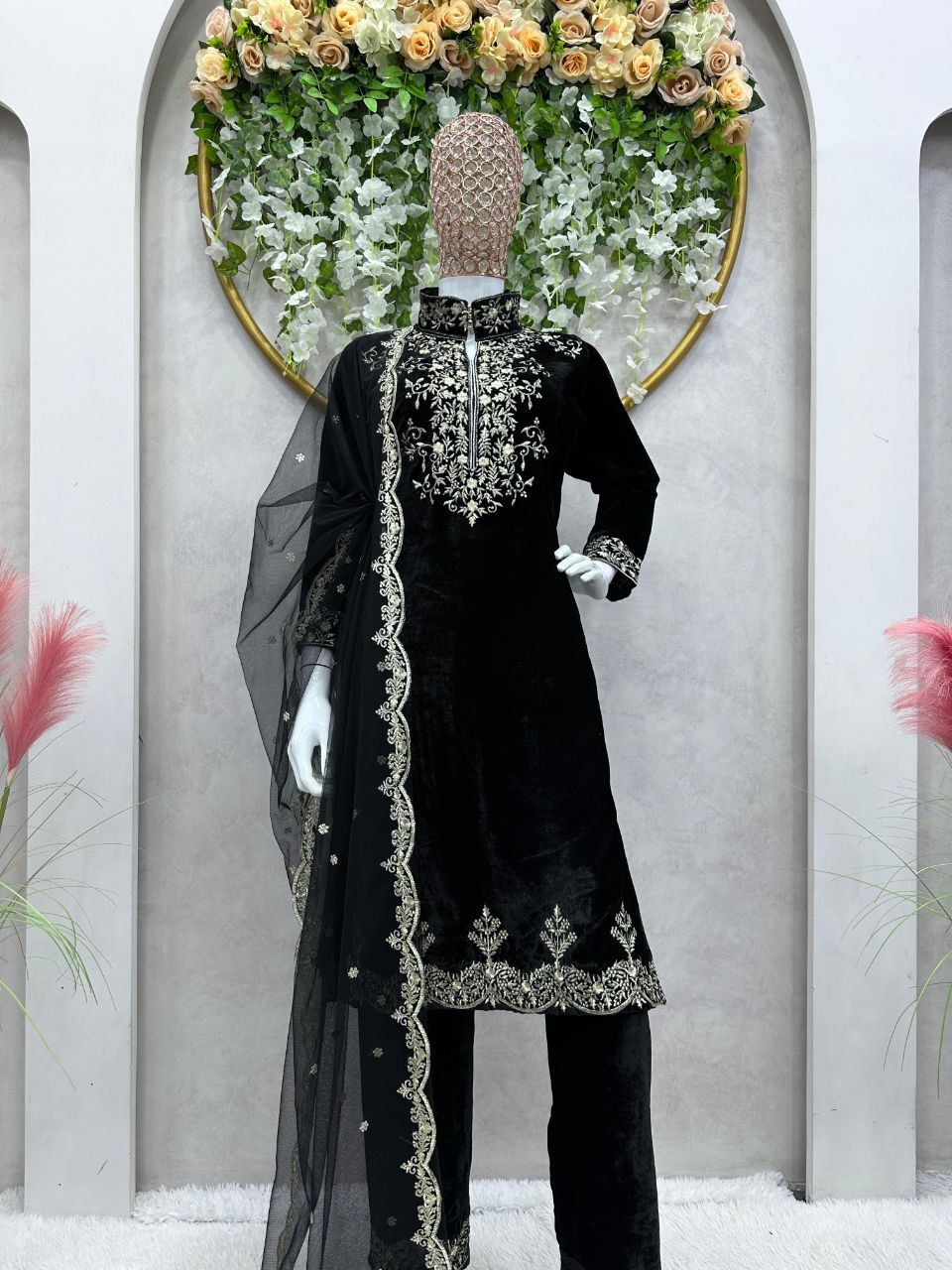 Looking for this same colour beautiful Designer Suit On havy Velvet febric with inner and Thred work and prnt on also Velvet febric with Thred Febric and Dupatta on Soft Net Febric With Thred Work.