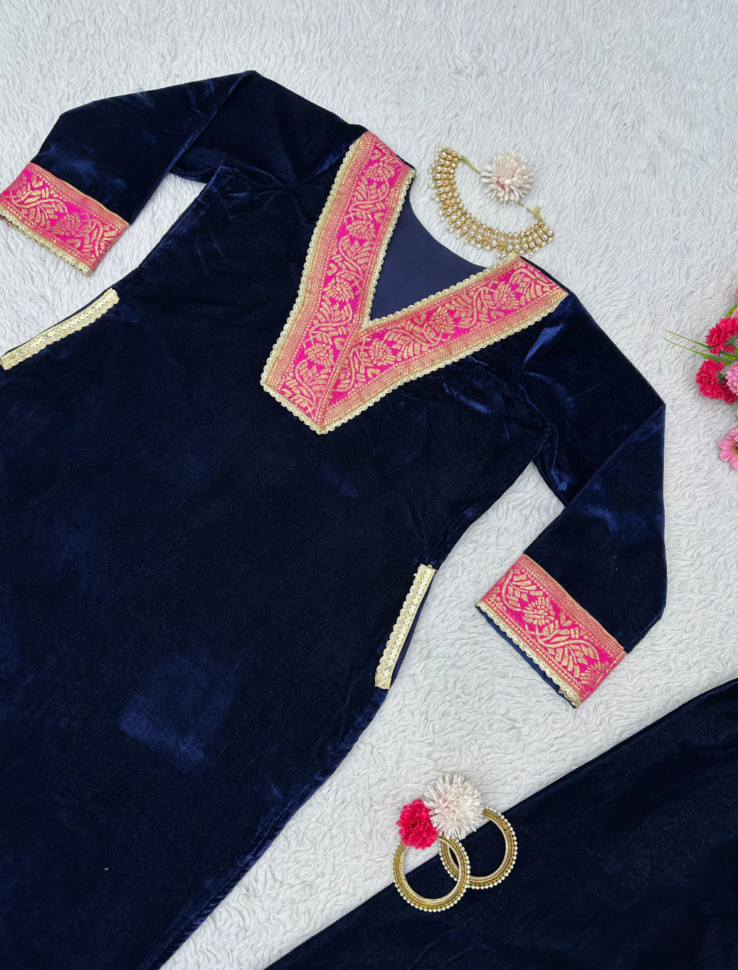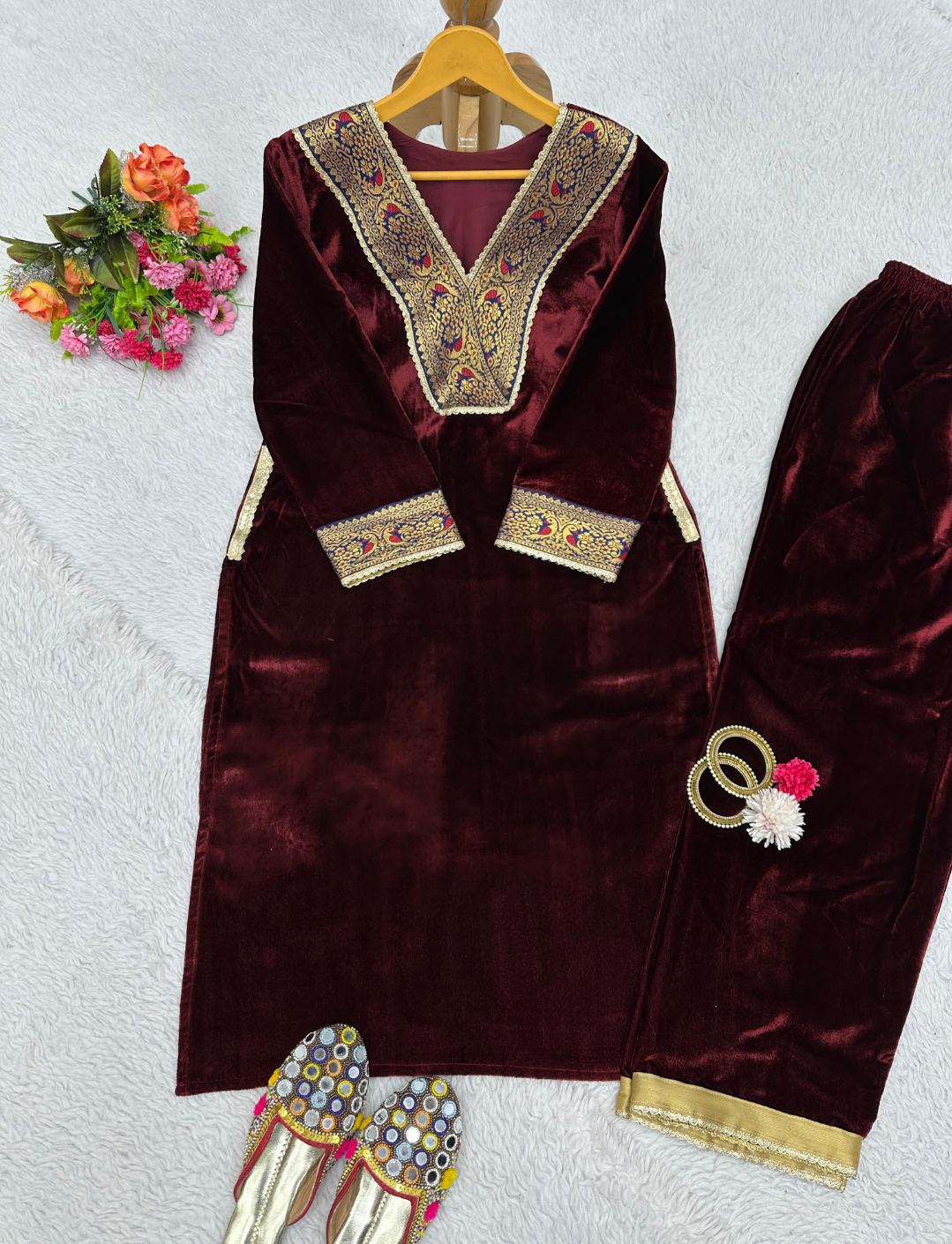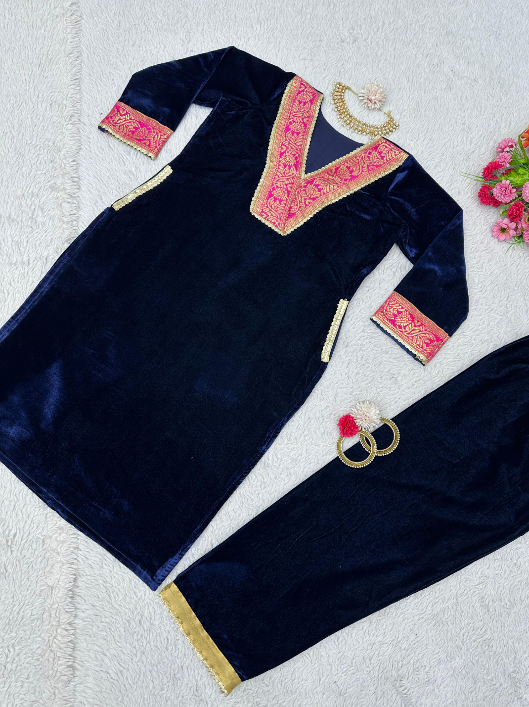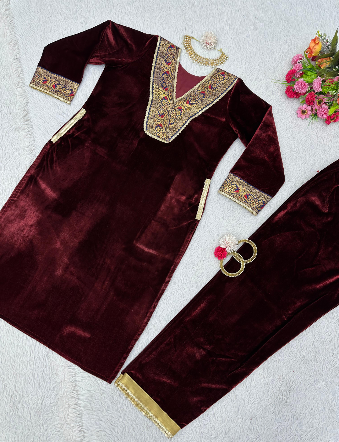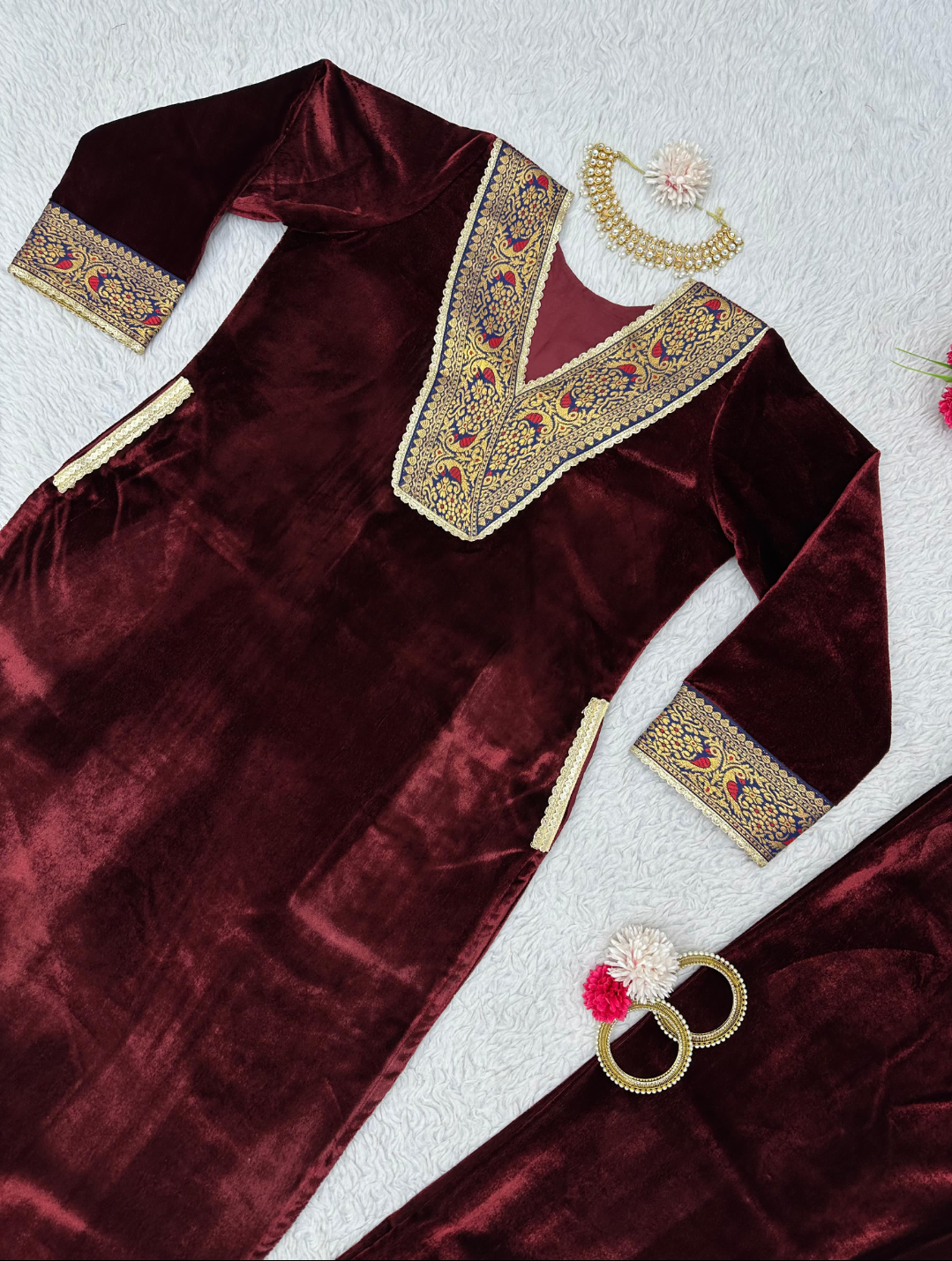 Looking for this same colour beautiful Designer Suit On heavy Velvet fabric with inner and Jacquard Lace work and Pent on also Velvet fabric with Fancy Lace.