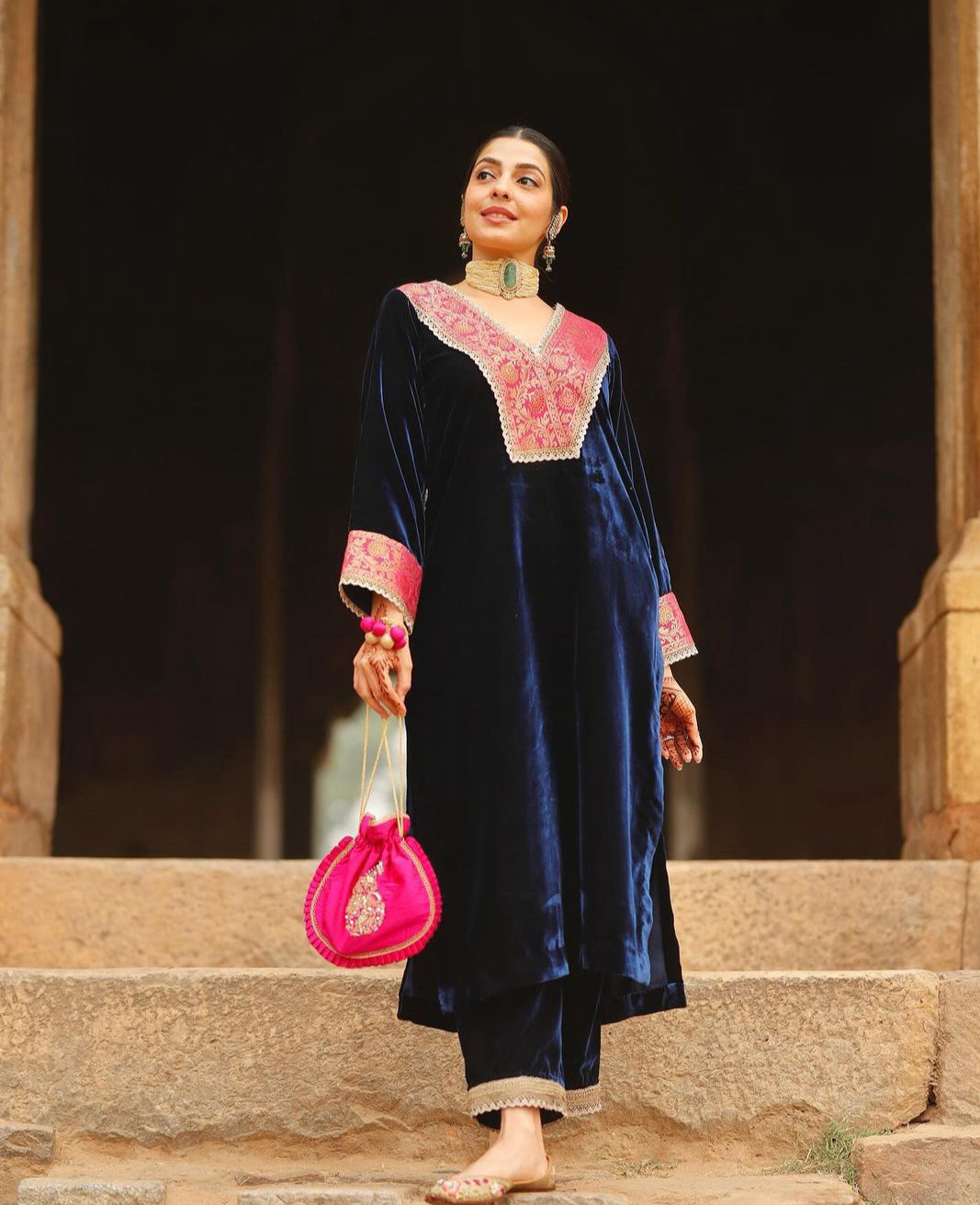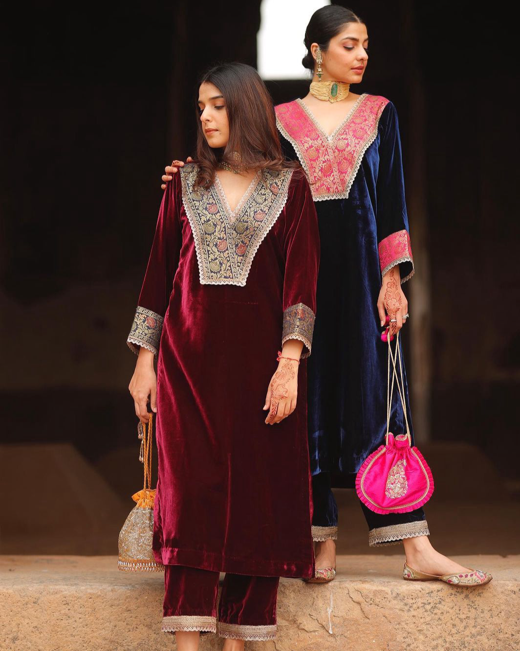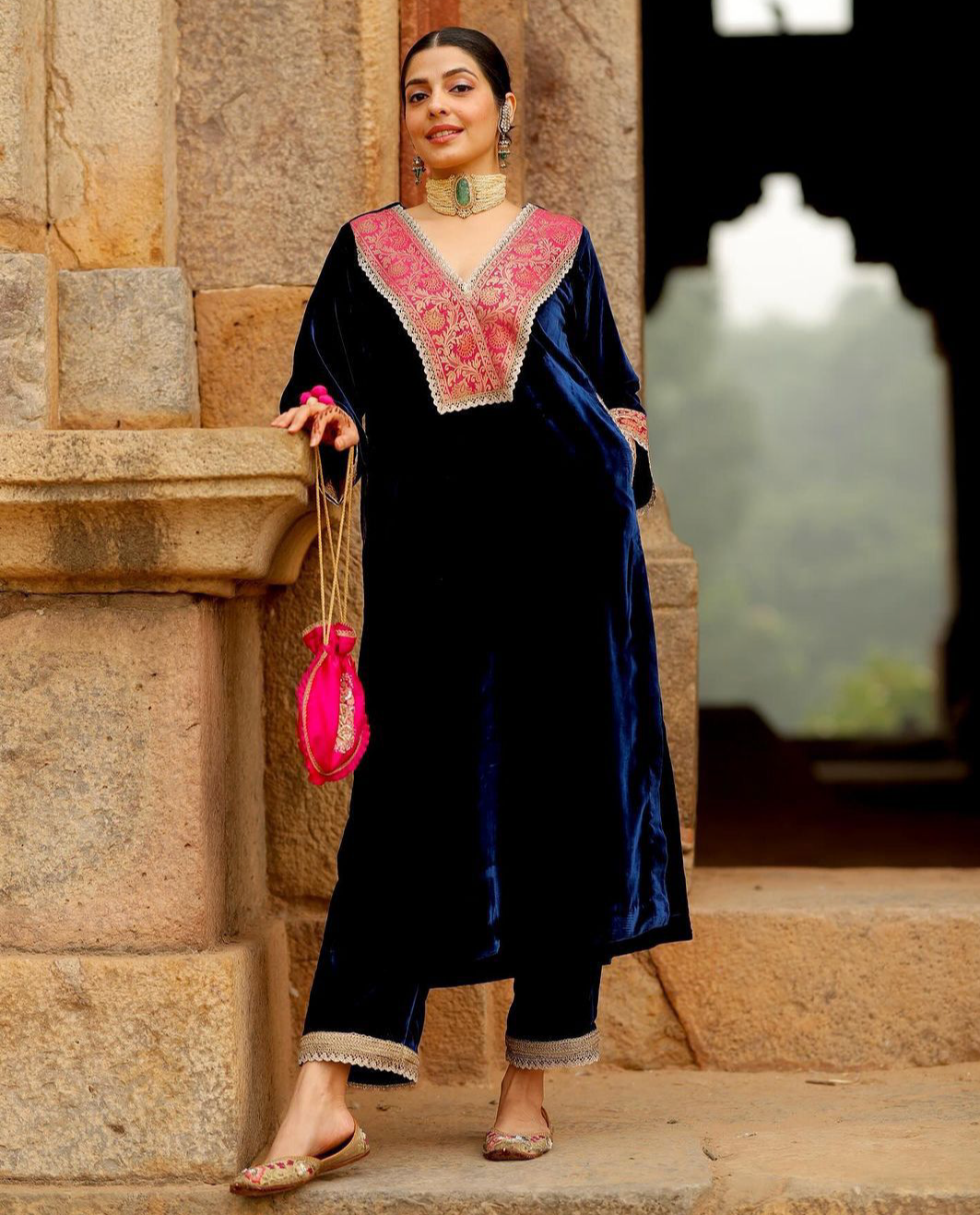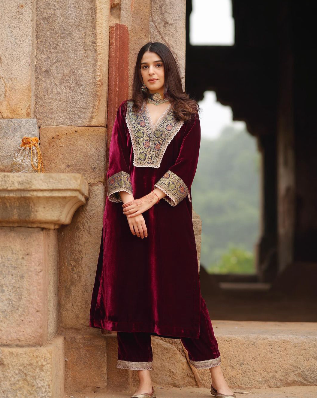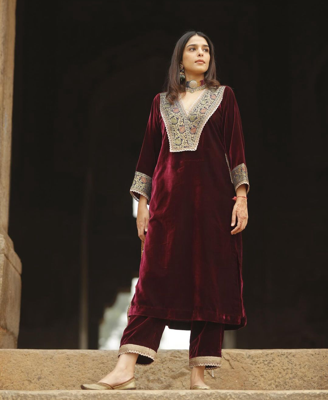 Looking for this same colour beautiful Designer Suit On heavy Velvet fabric with inner and Jacquard Lace work and Pent on also Velvet fabric with Fancy Lace.