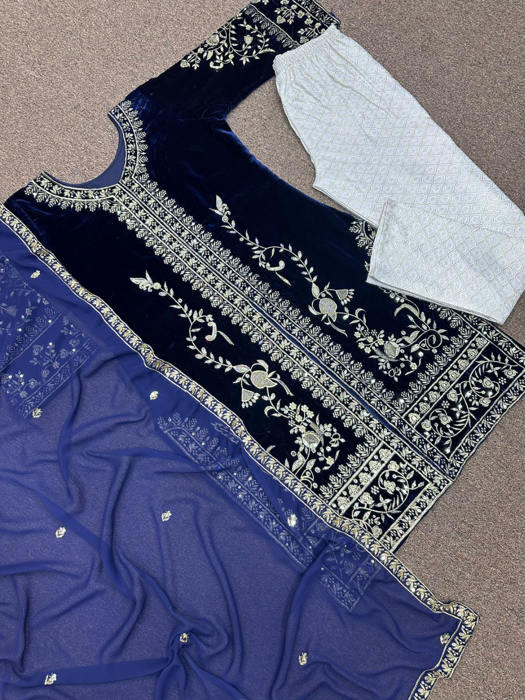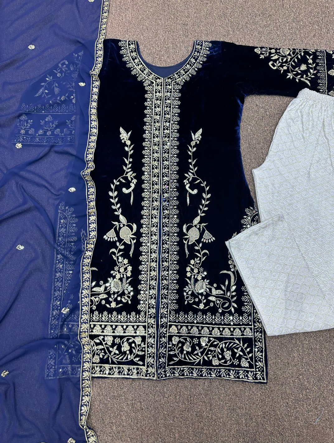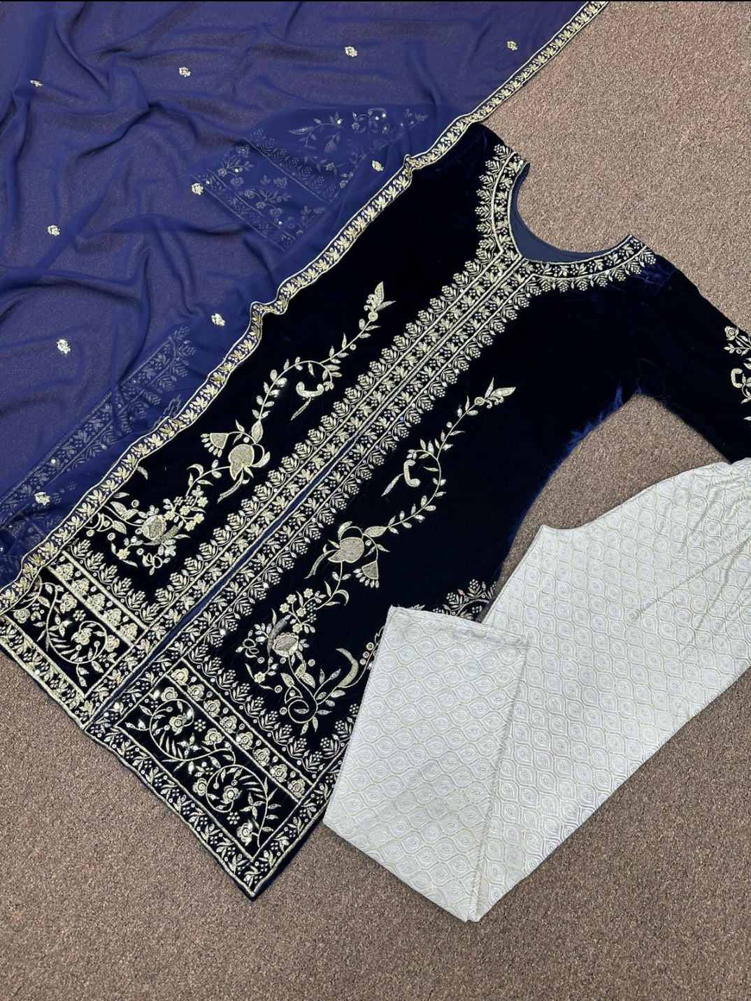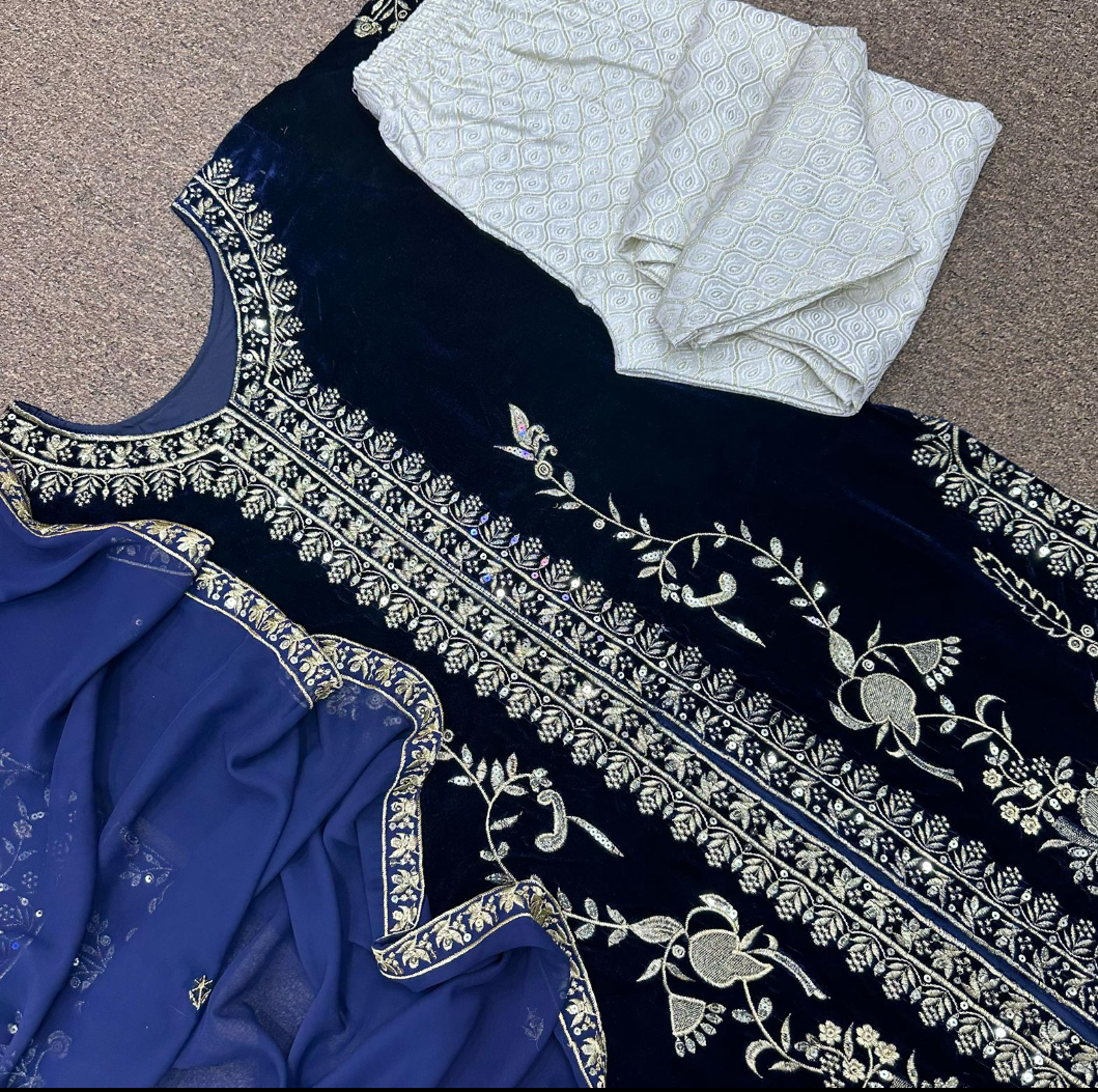 Presenting New Velvet Designe Collection With Fancy Embroidery Sequins Work Top - Bottom With Dupatta