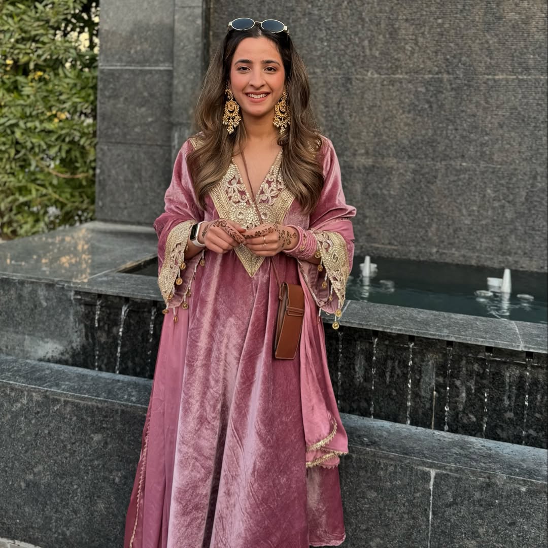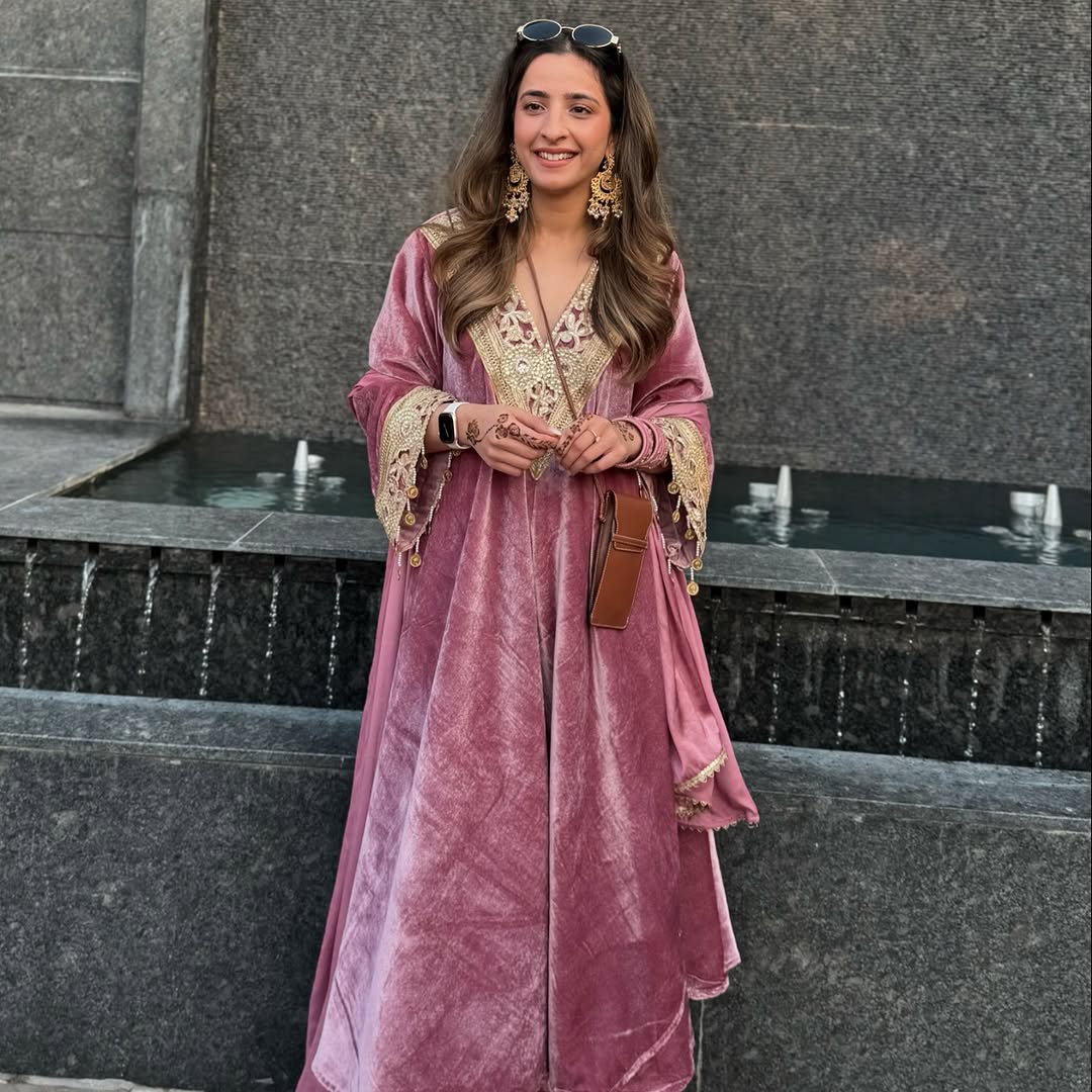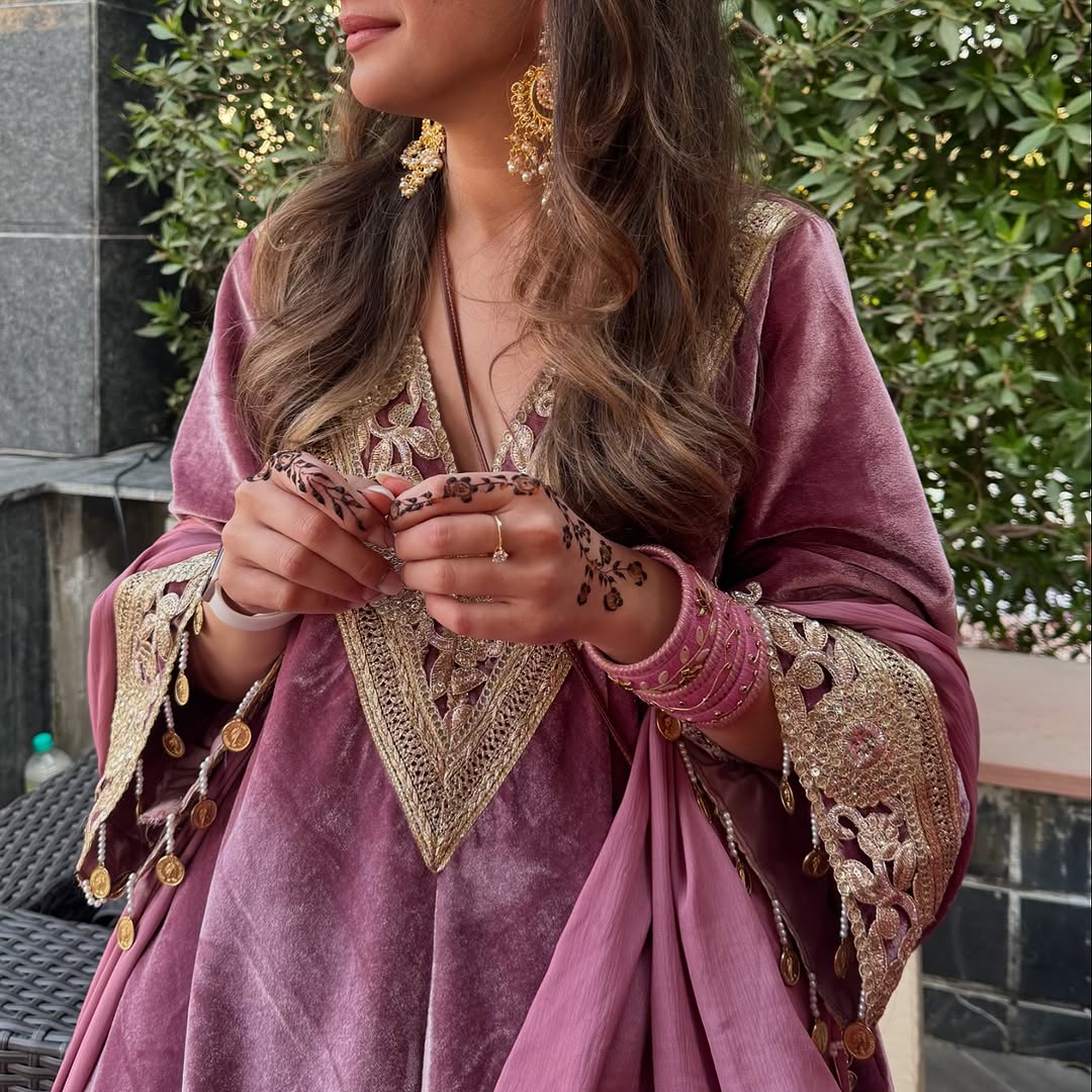 Experience the luxurious comfort and style of our Velvet Anarkali suit. Designed with intricate neck work and a stunning dupatta border lace, this piece exudes elegance. Paired with a velvet bottom, it is the perfect choice for any special occasion. Elevate your wardrobe with this timeless and fashionable ensemble.