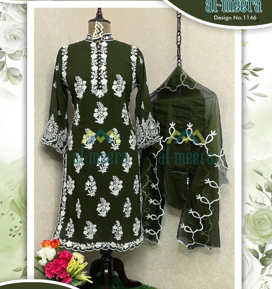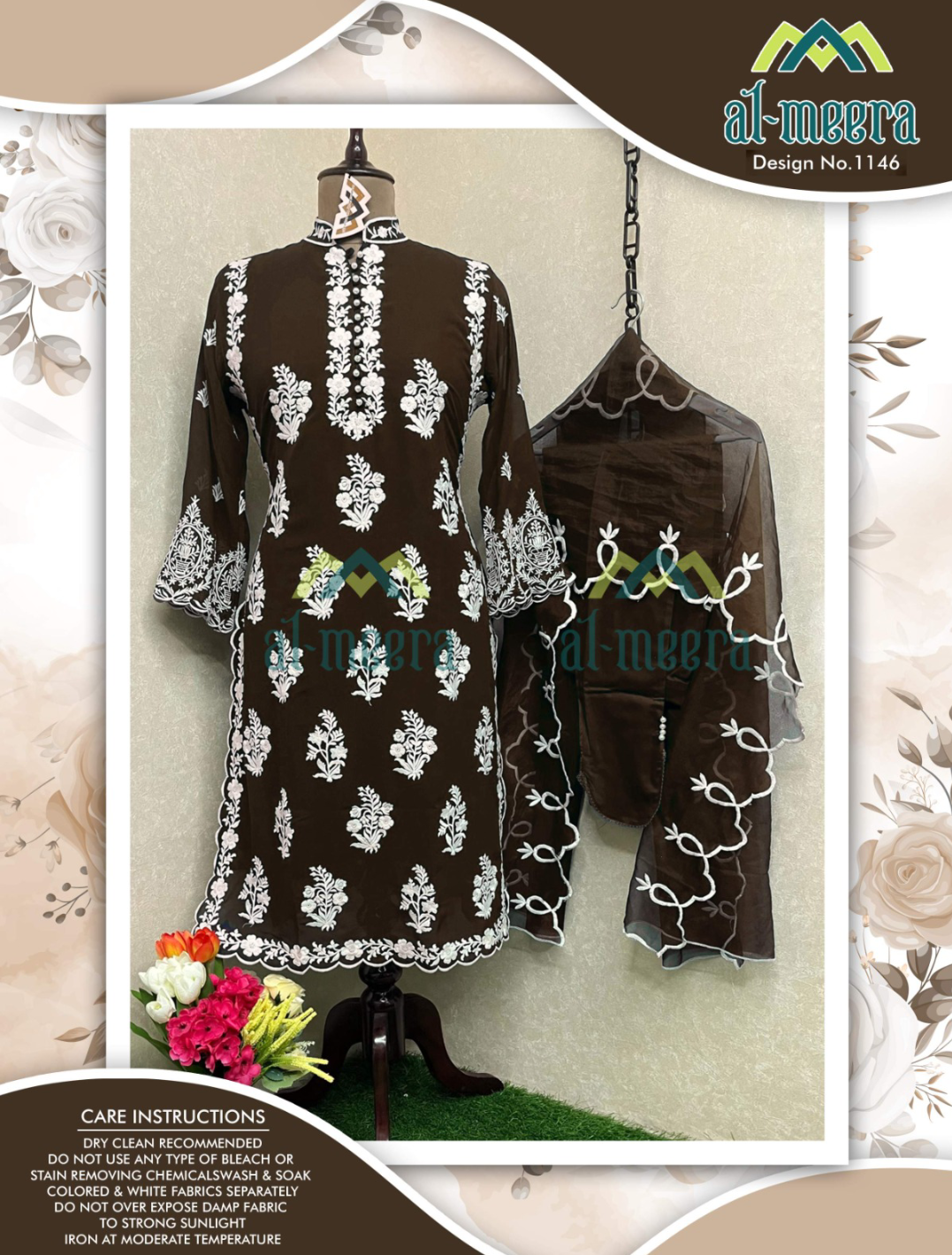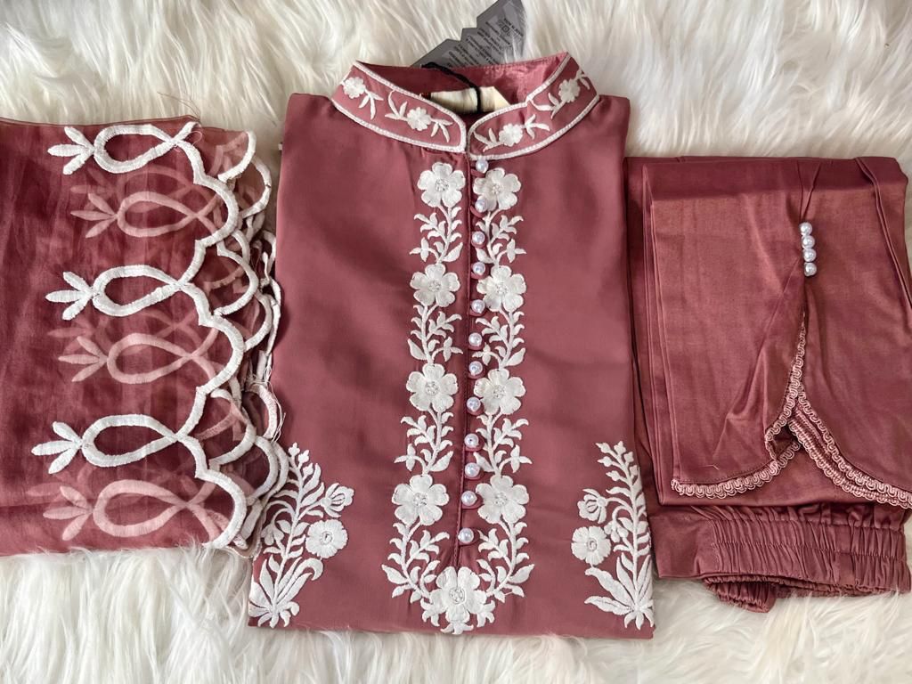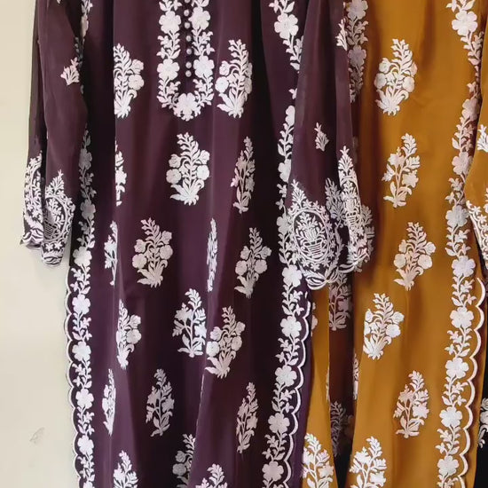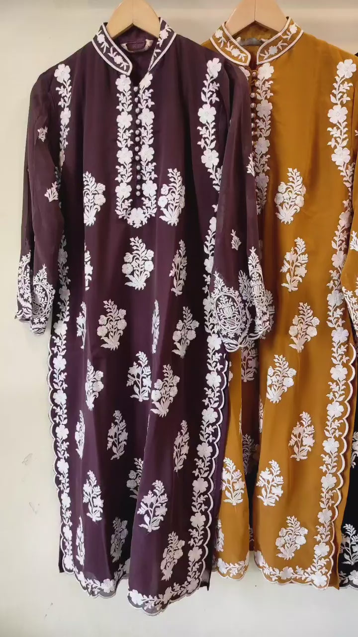 A Dark colors corduroy kurta with Aari embroidery is perfect for the festive season. It is paired with stretchable cotten pants with lace detailing and an organza dupatta with scalloped edges