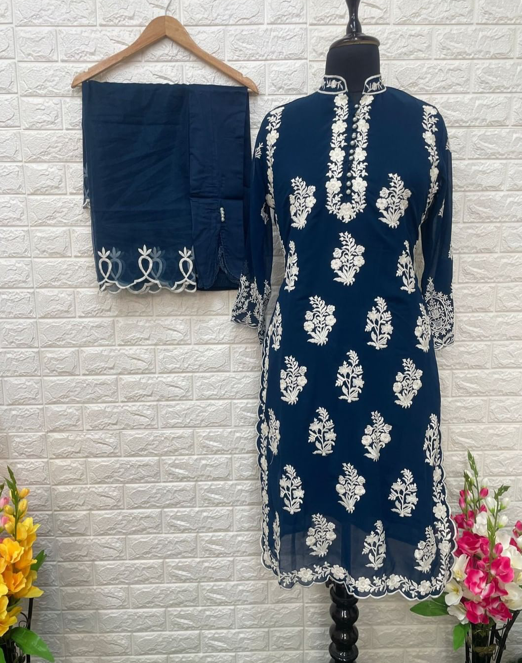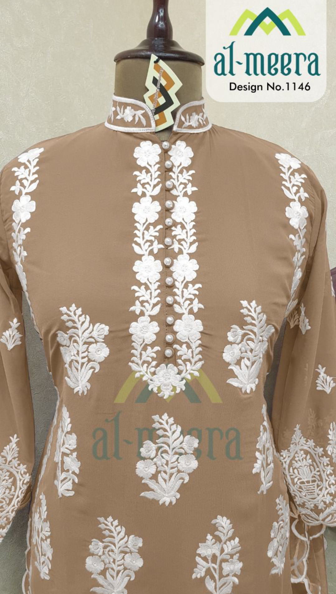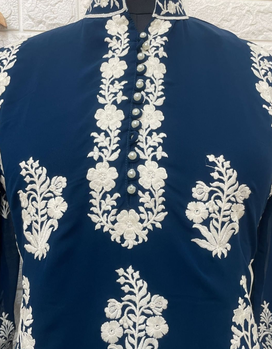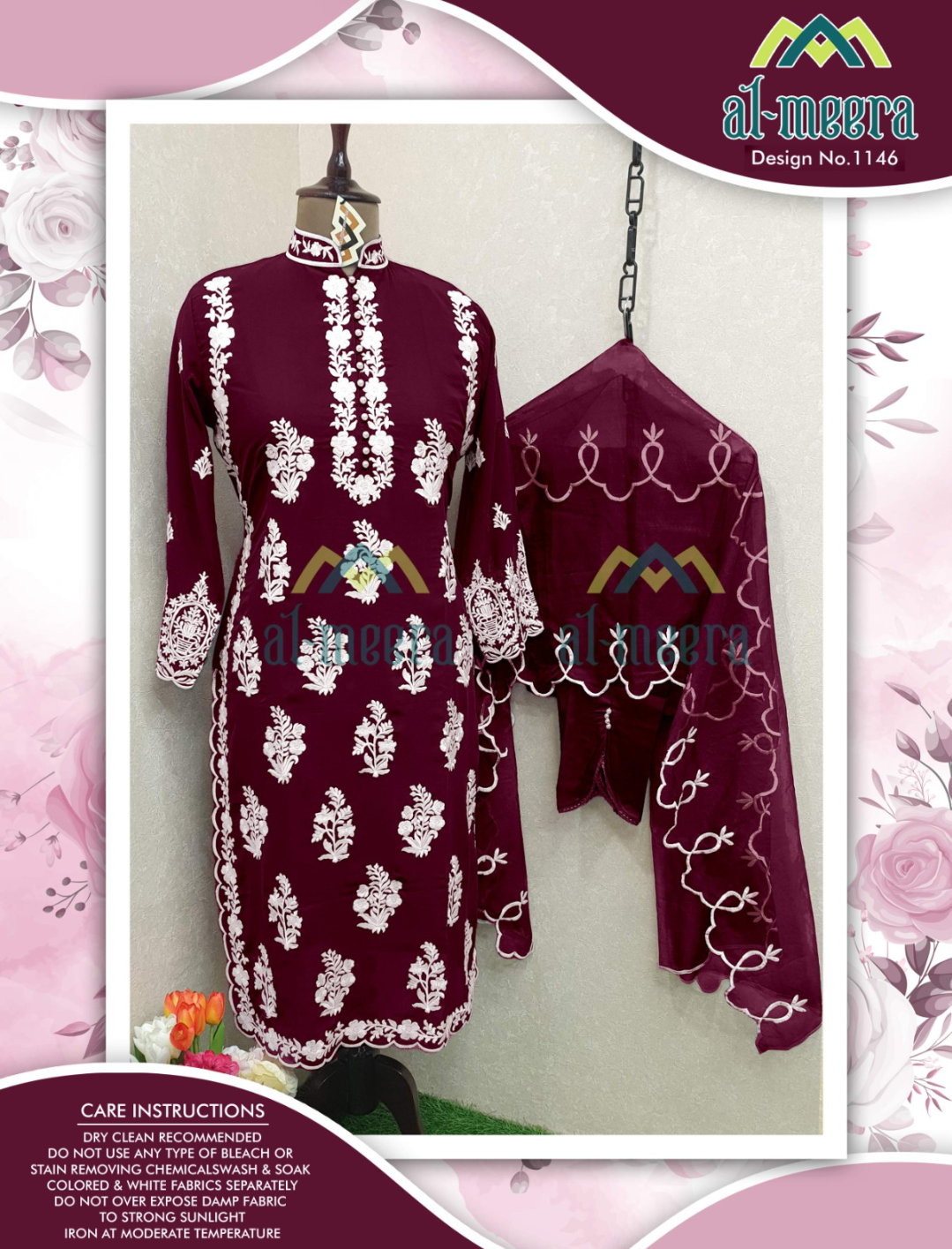 A Dark colors corduroy kurta with Aari embroidery is perfect for the festive season. It is paired with stretchable cotten pants with lace detailing and an organza dupatta with scalloped edges