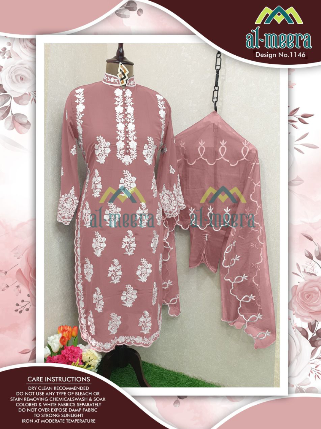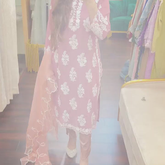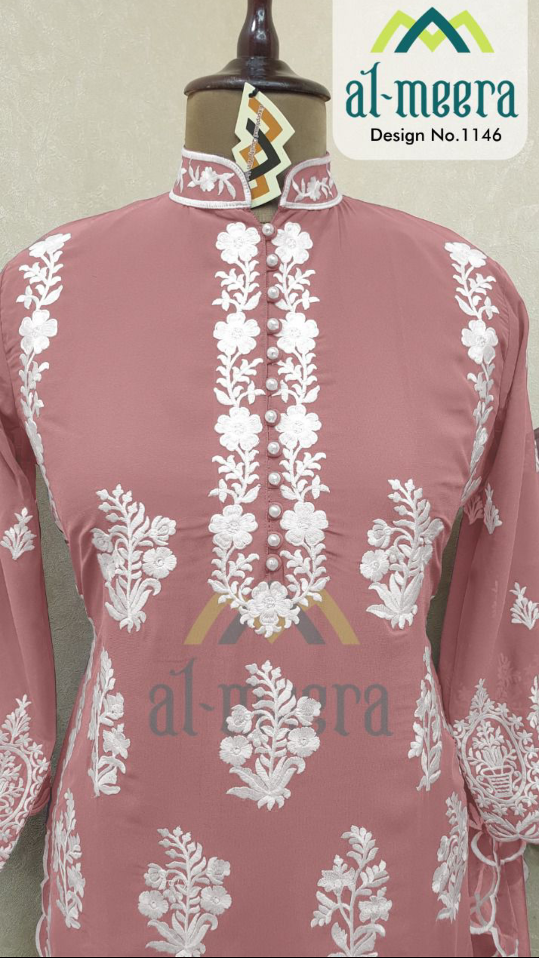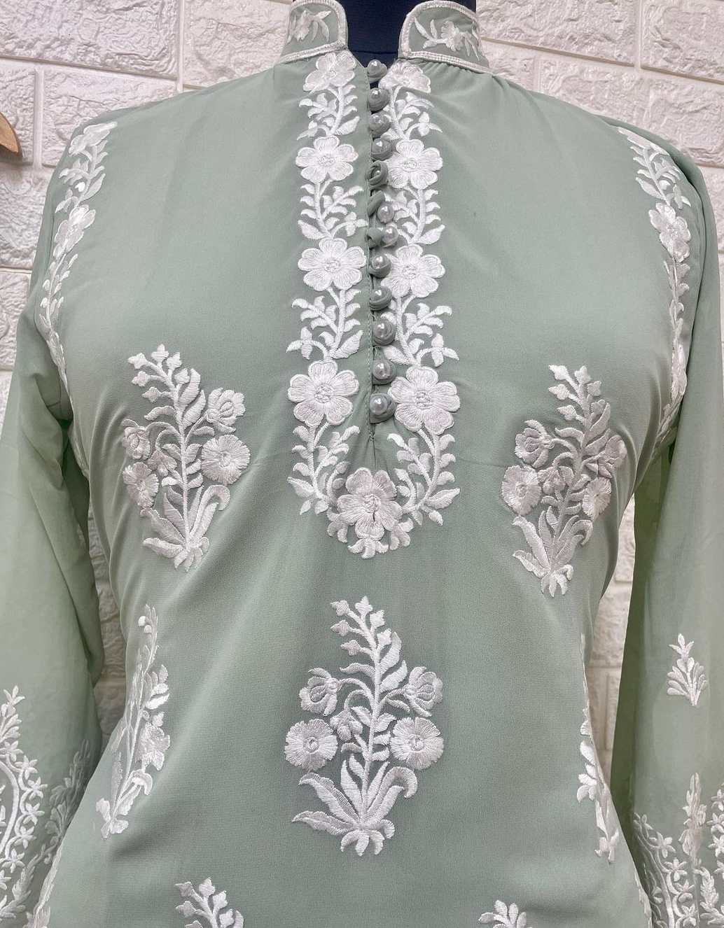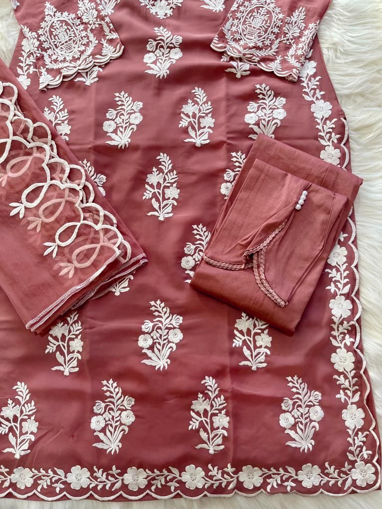 A Dark colors corduroy kurta with Aari embroidery is perfect for the festive season. It is paired with stretchable cotten pants with lace detailing and an organza dupatta with scalloped edges