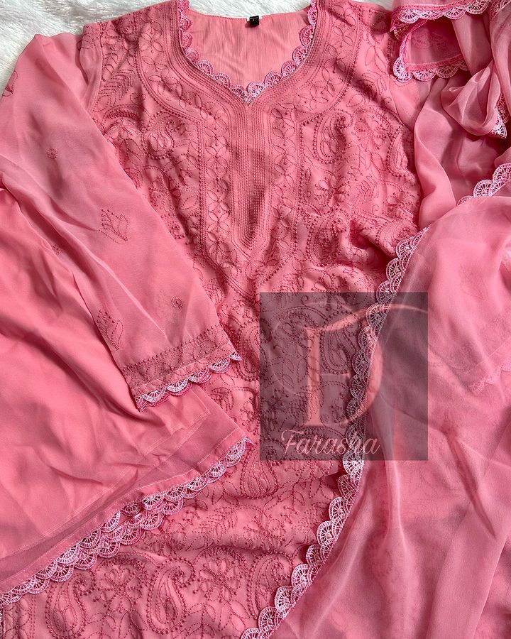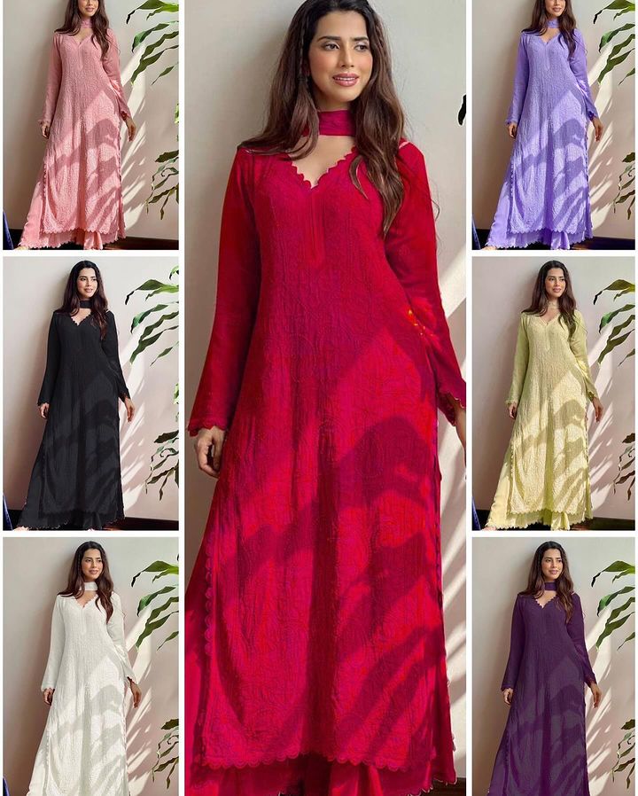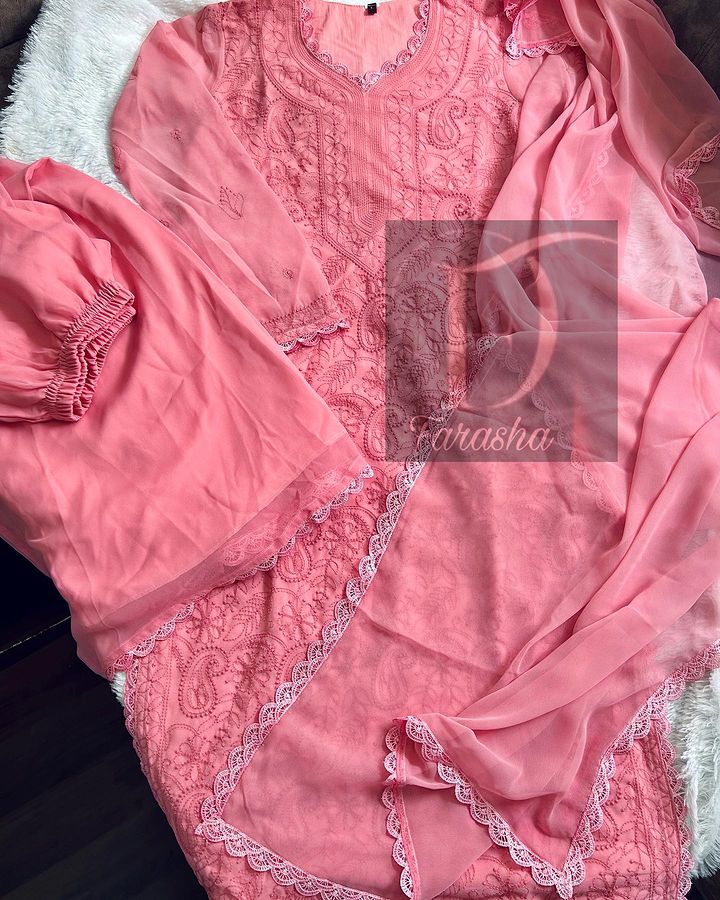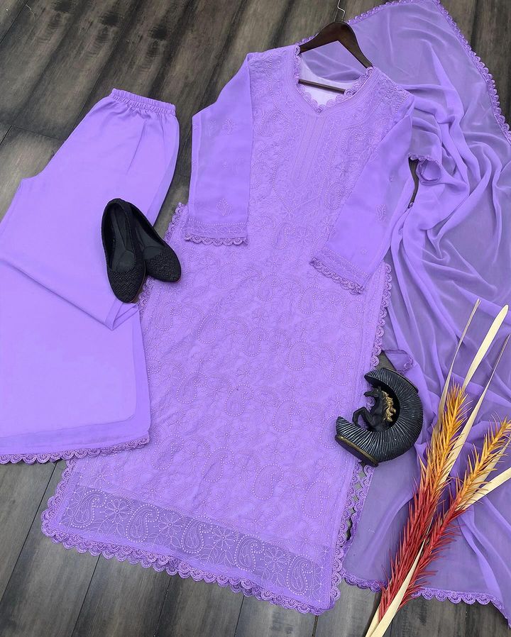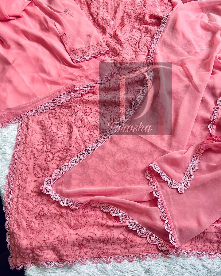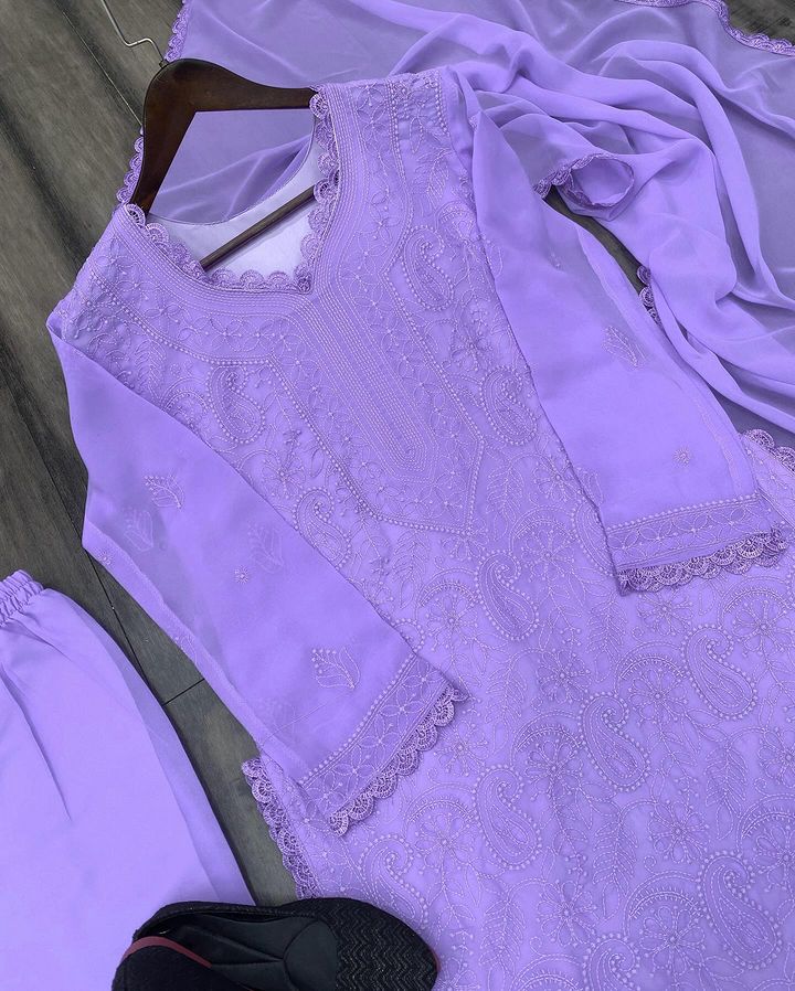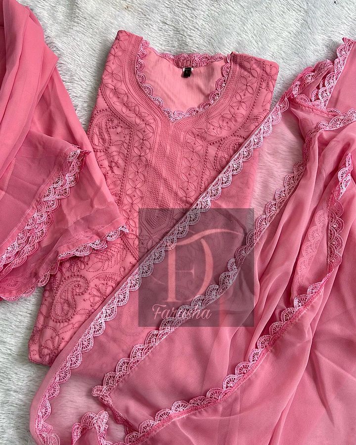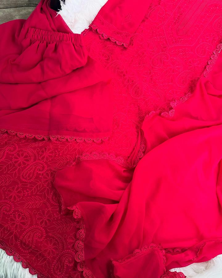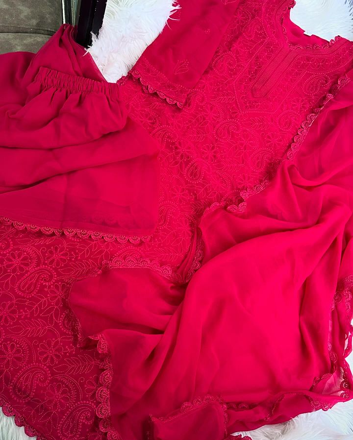 RUNNING WEAR TRENDING GEORGETTE TOP COTTON THREAD EMBROIDERED WORK AND WORK PLAZO WITH DUPATTA