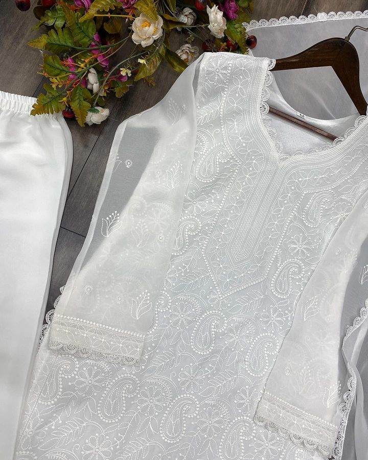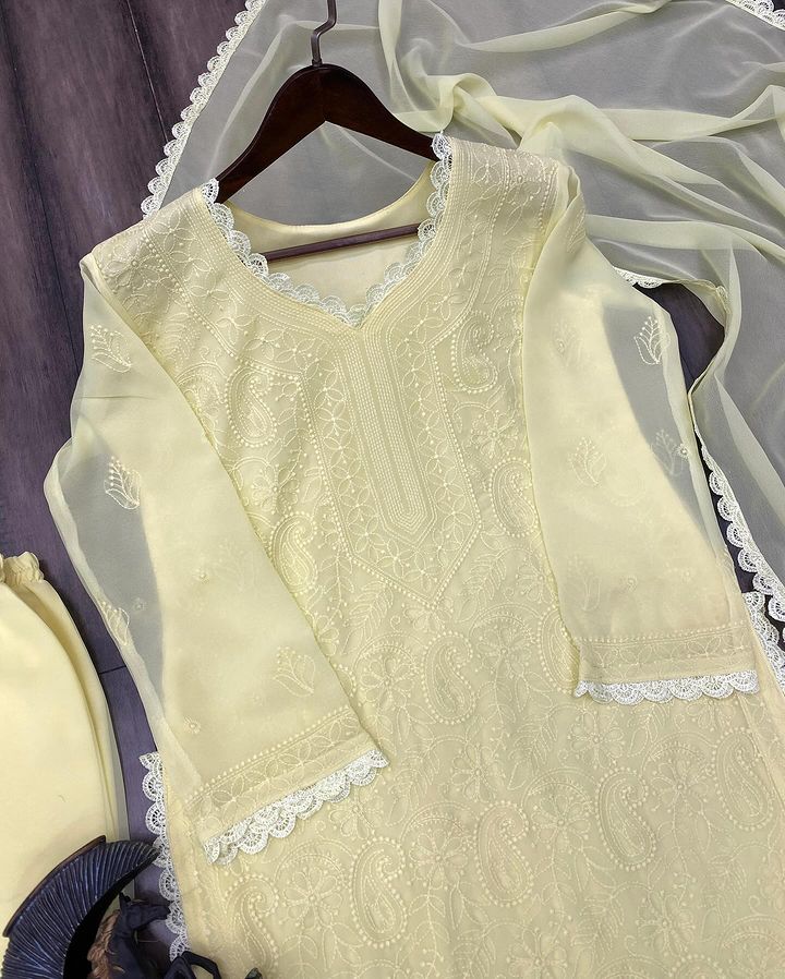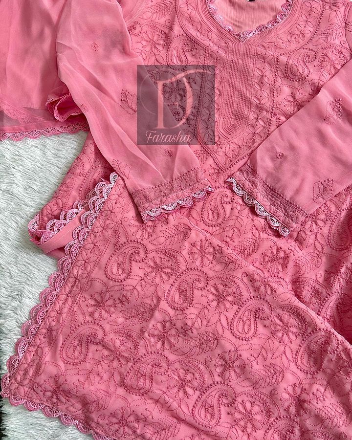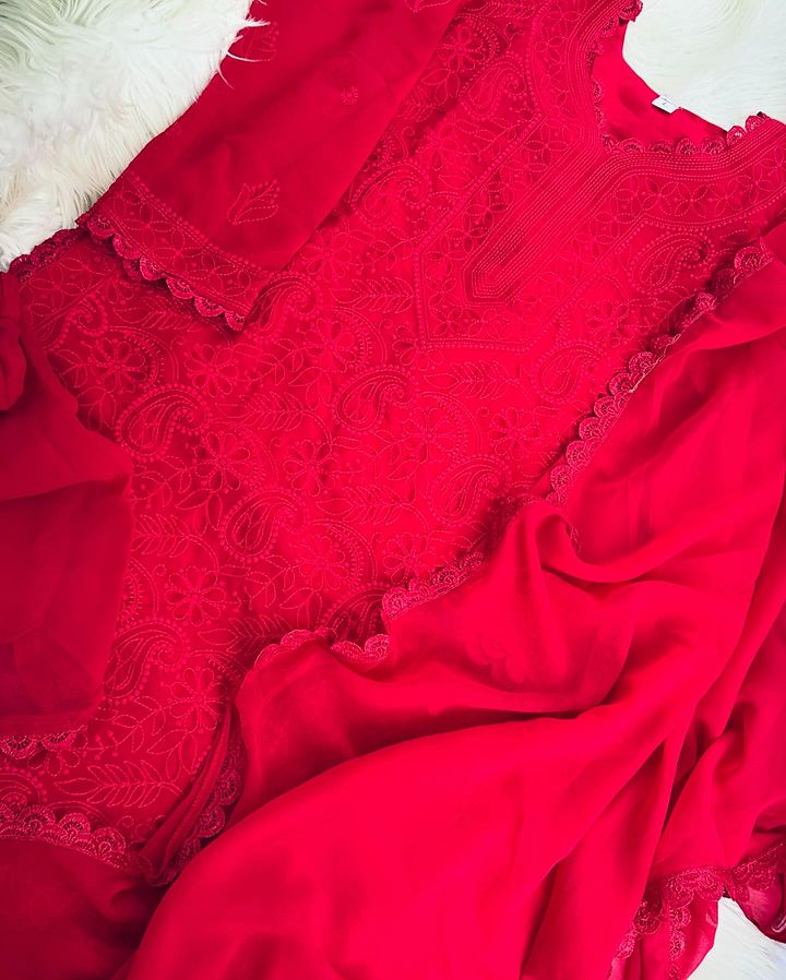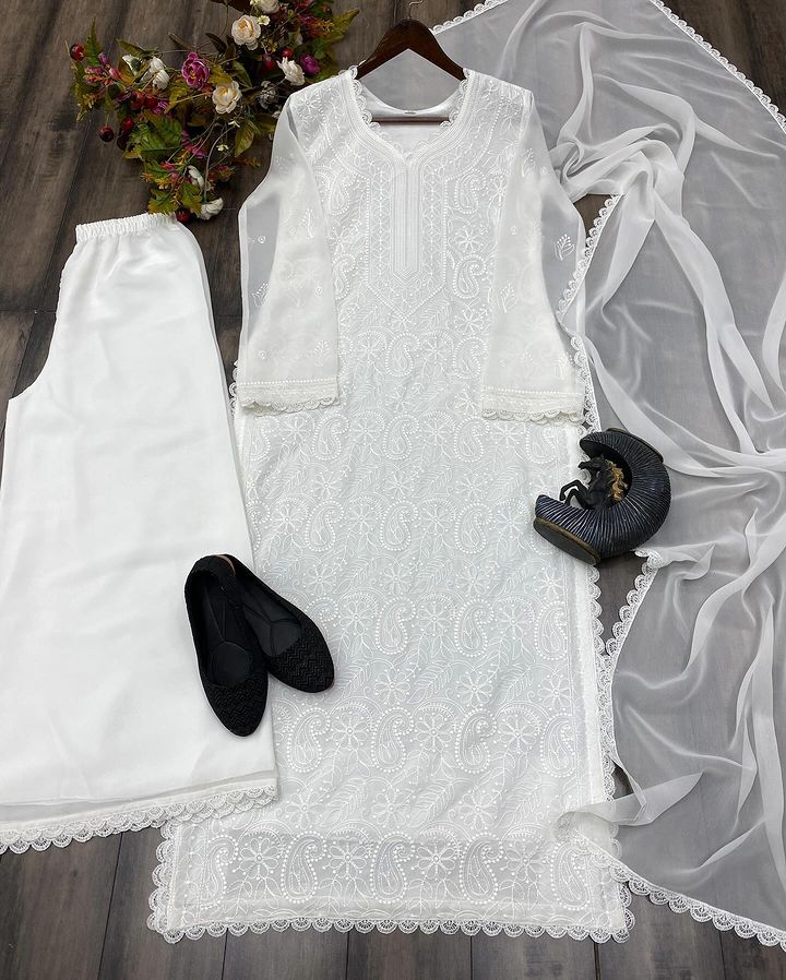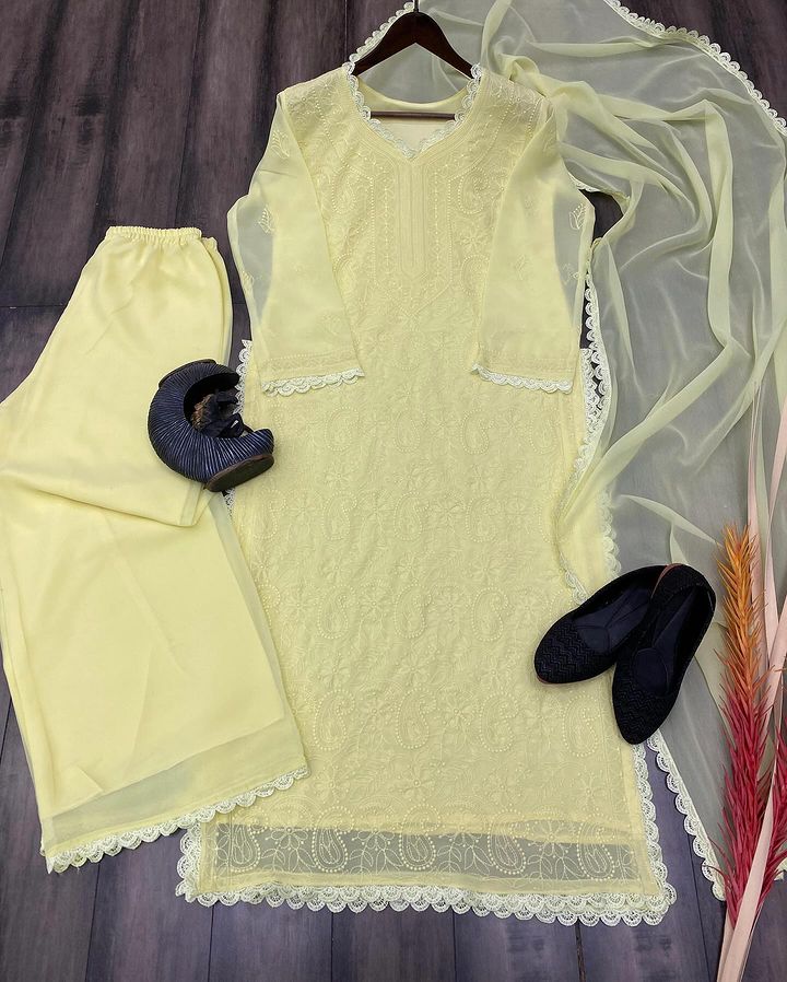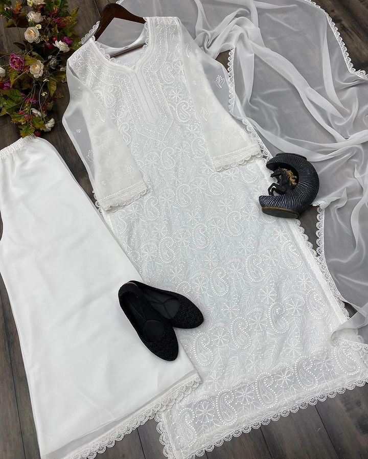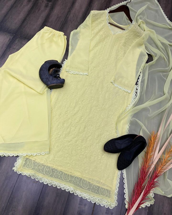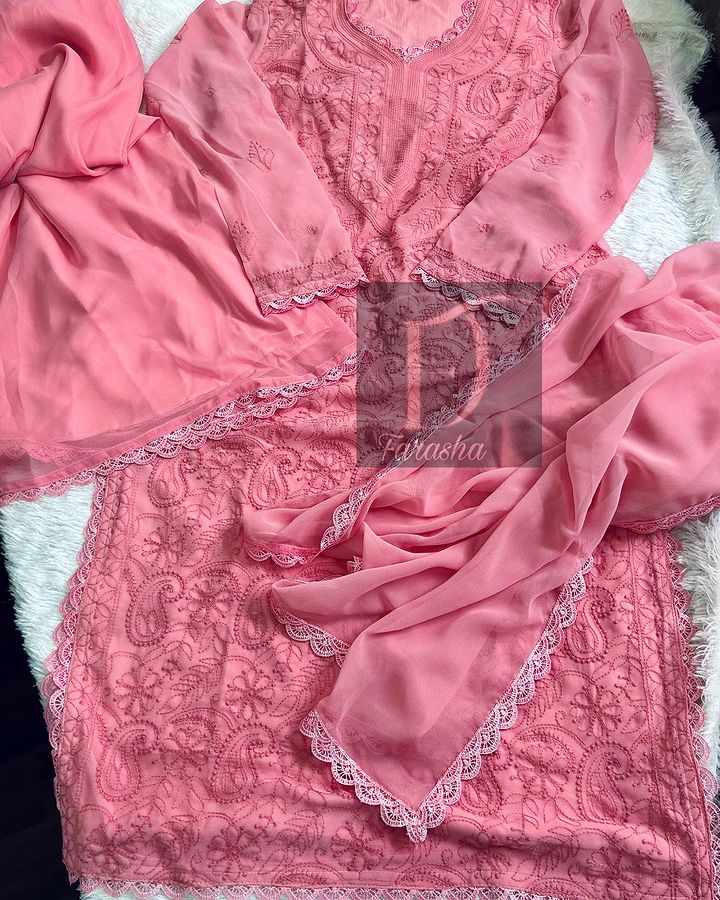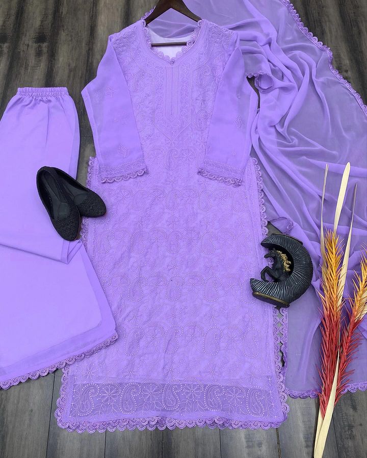 RUNNING WEAR TRENDING GEORGETTE TOP COTTON THREAD EMBROIDERED WORK AND WORK PLAZO WITH DUPATTA