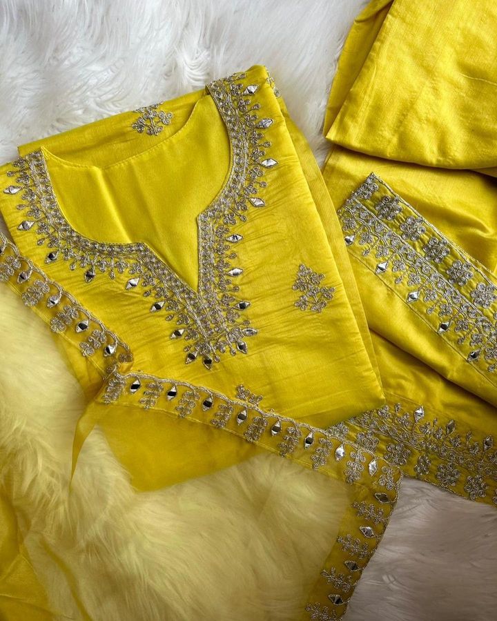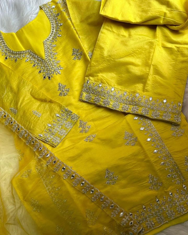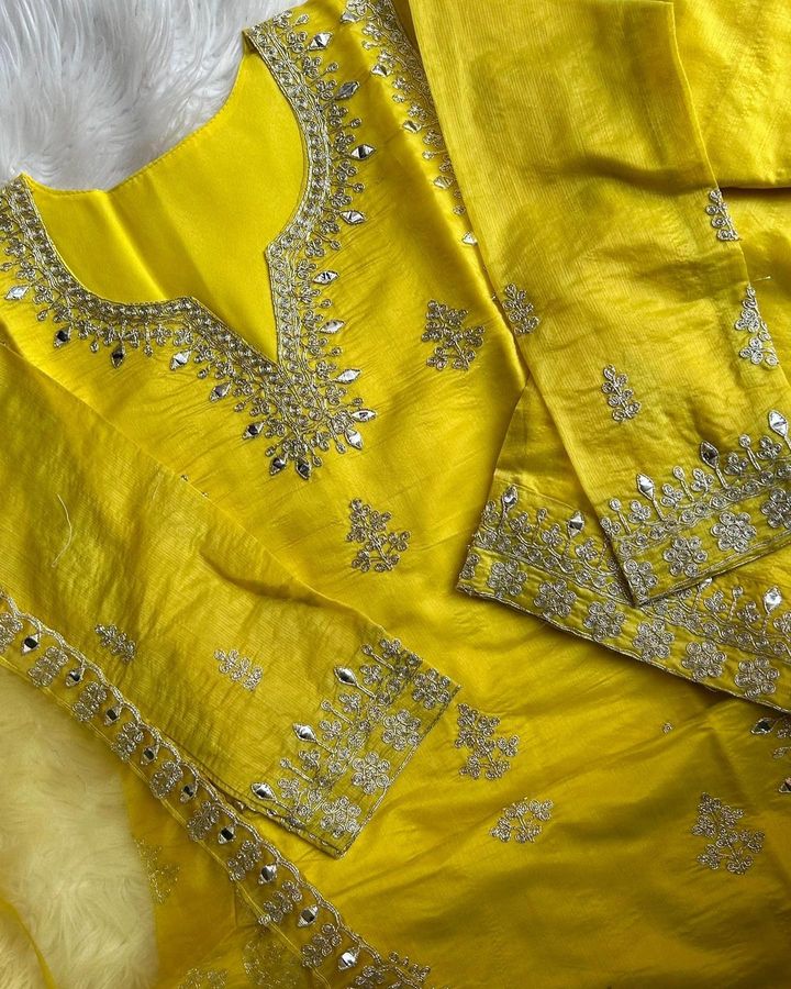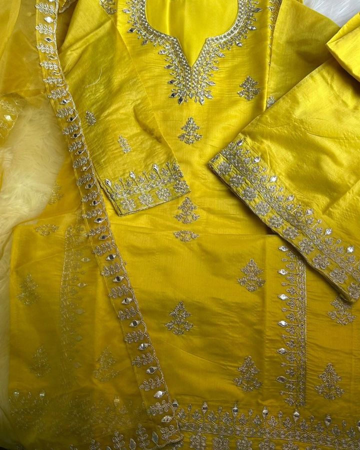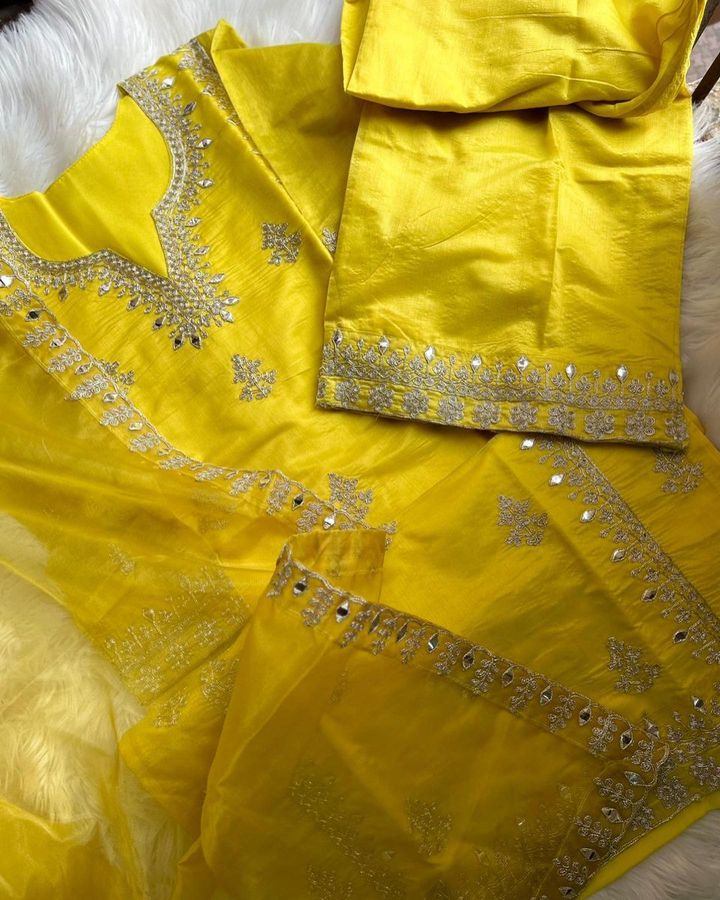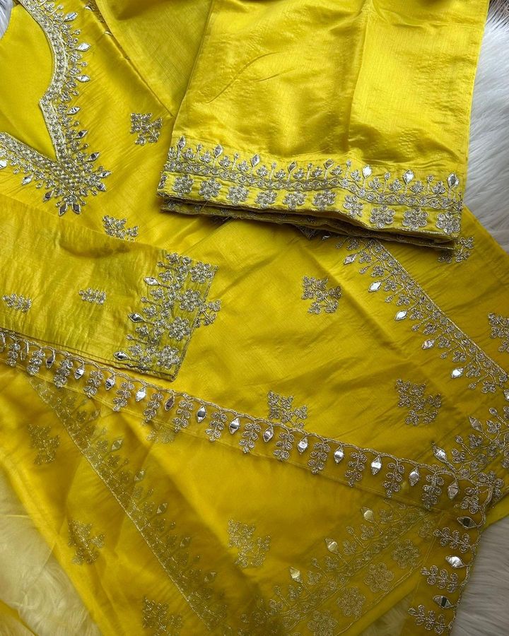 BOLLYWOOD STYLE KIARAA DESIGNER TOP RAJWADI SILK WITH CORDING AND PAPER MIRROR EMBROIDERY WORK WITH PANT AND DUPATTA