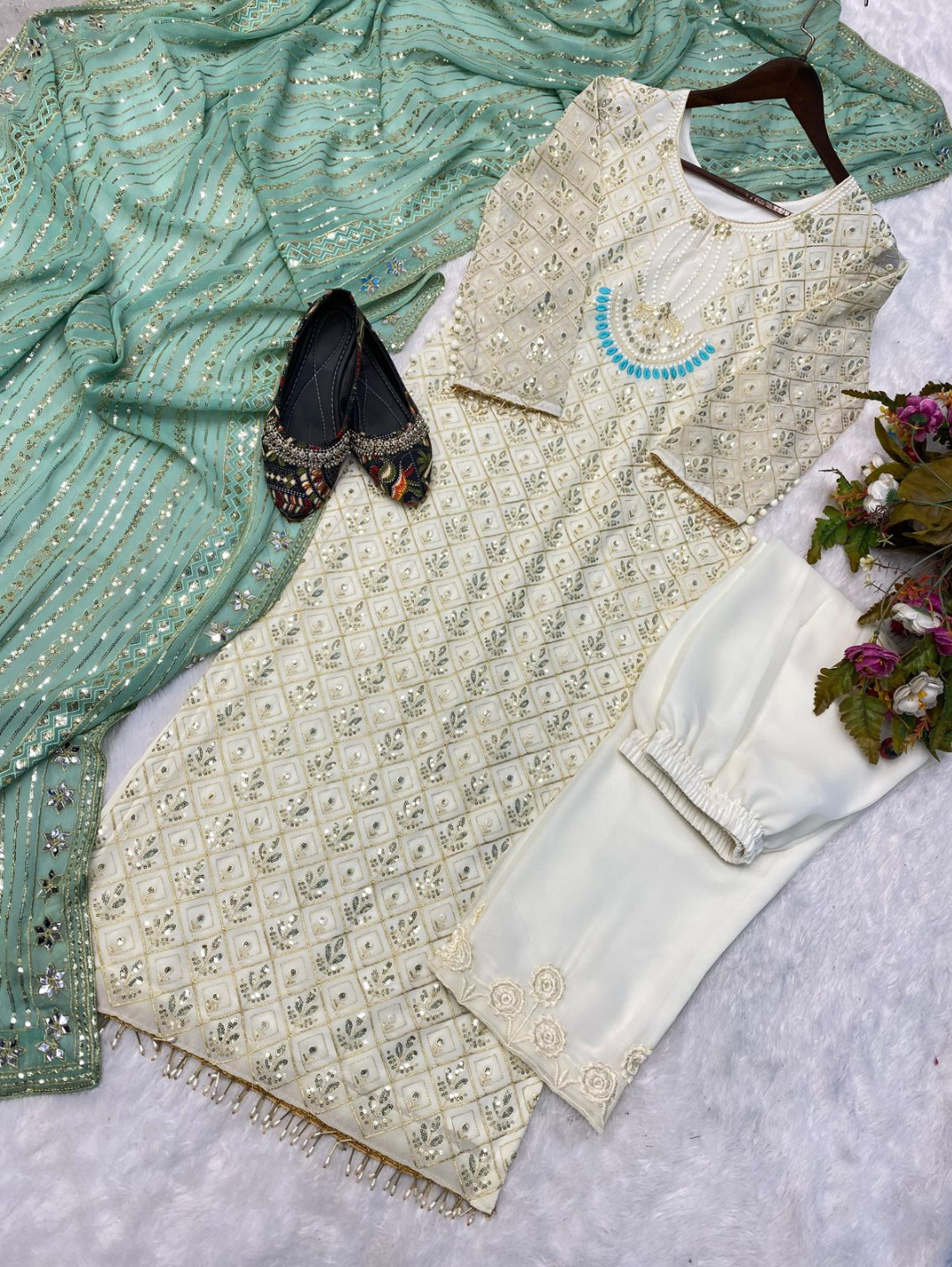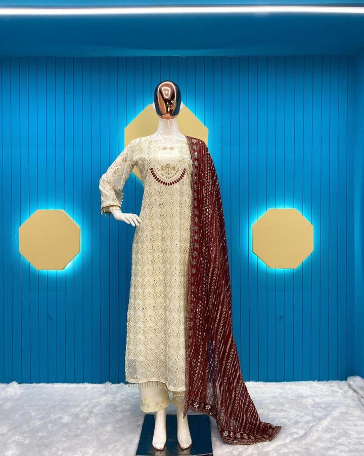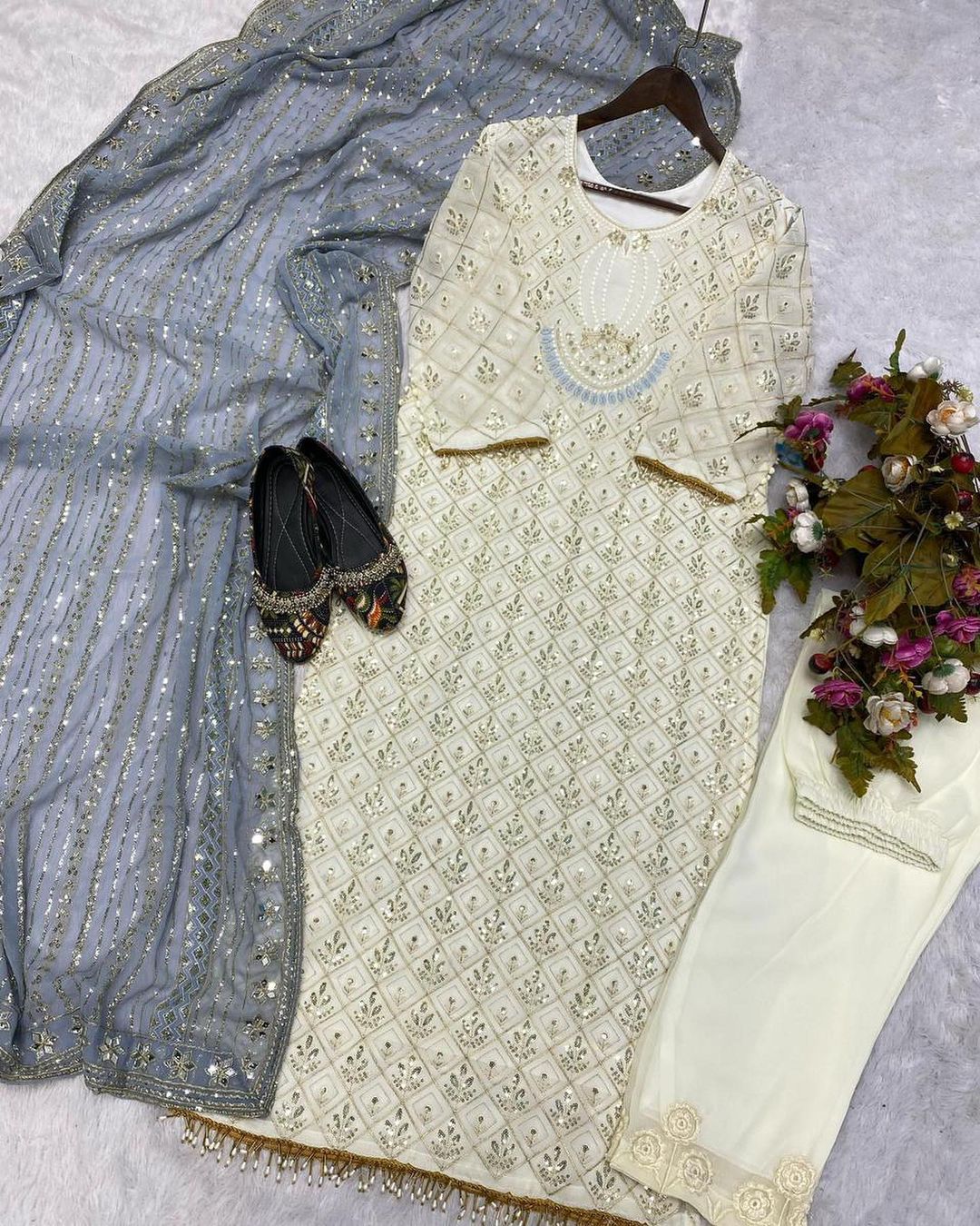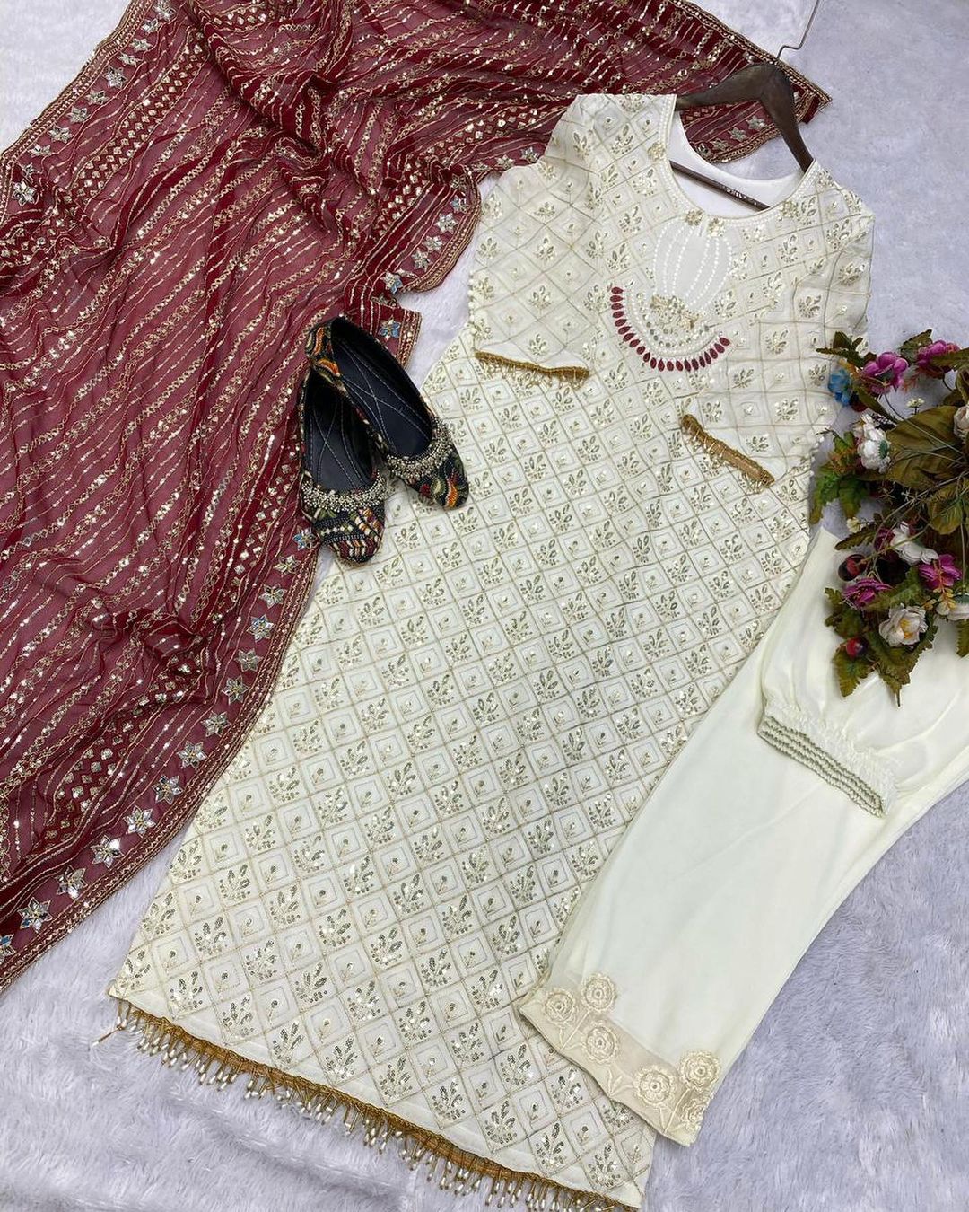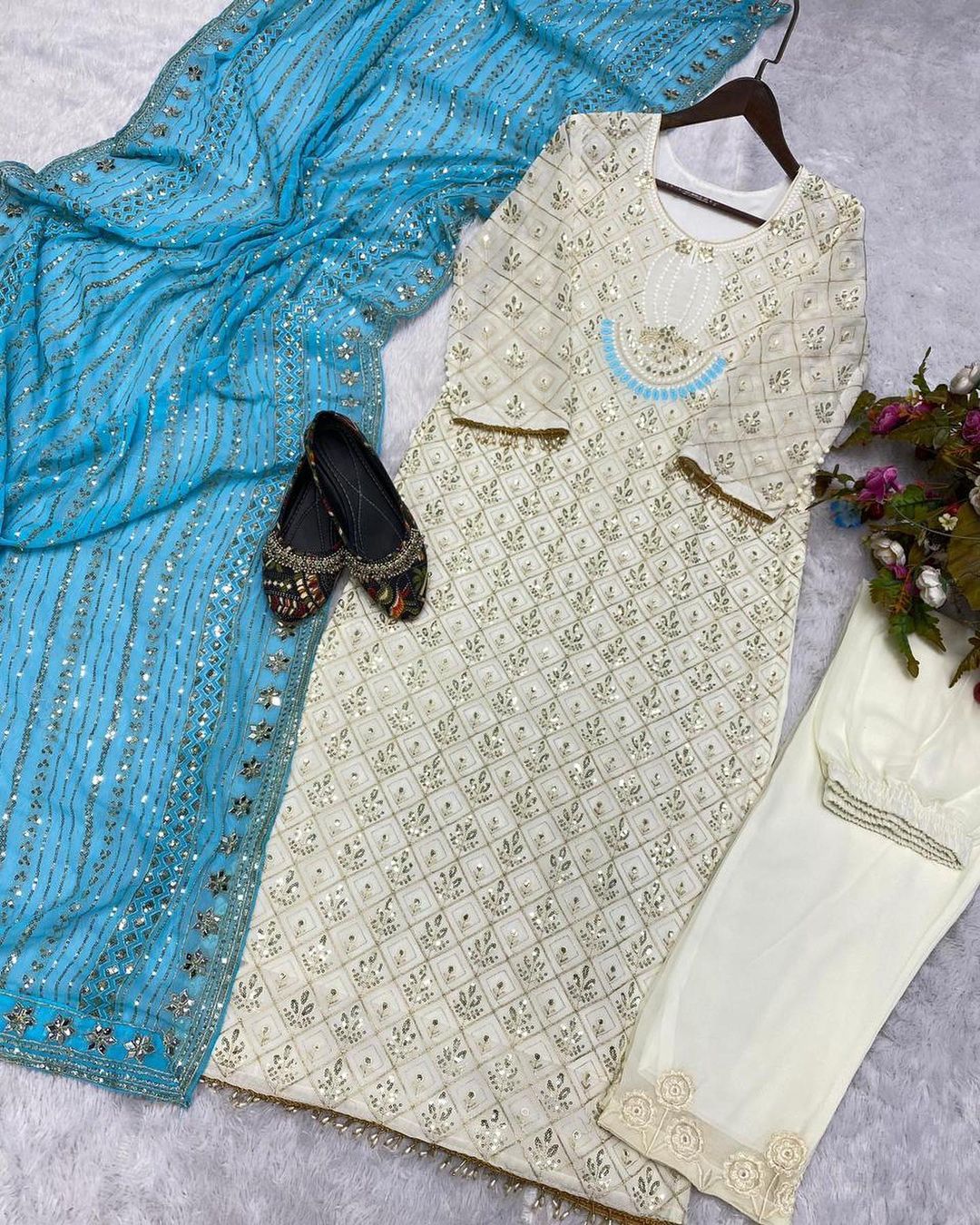 DESIRABLE FANCY GEORGETTE SEQUENCE EMBROIDERED WORK TOP AND PENT WITH DUPATTA