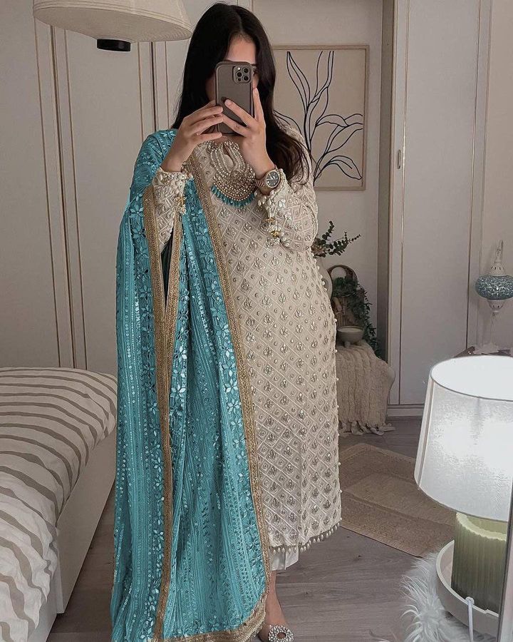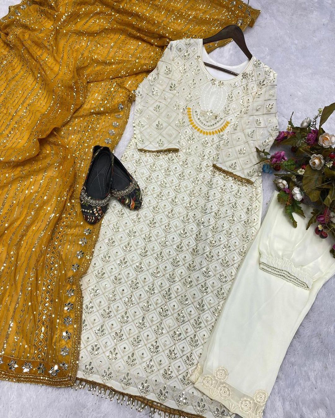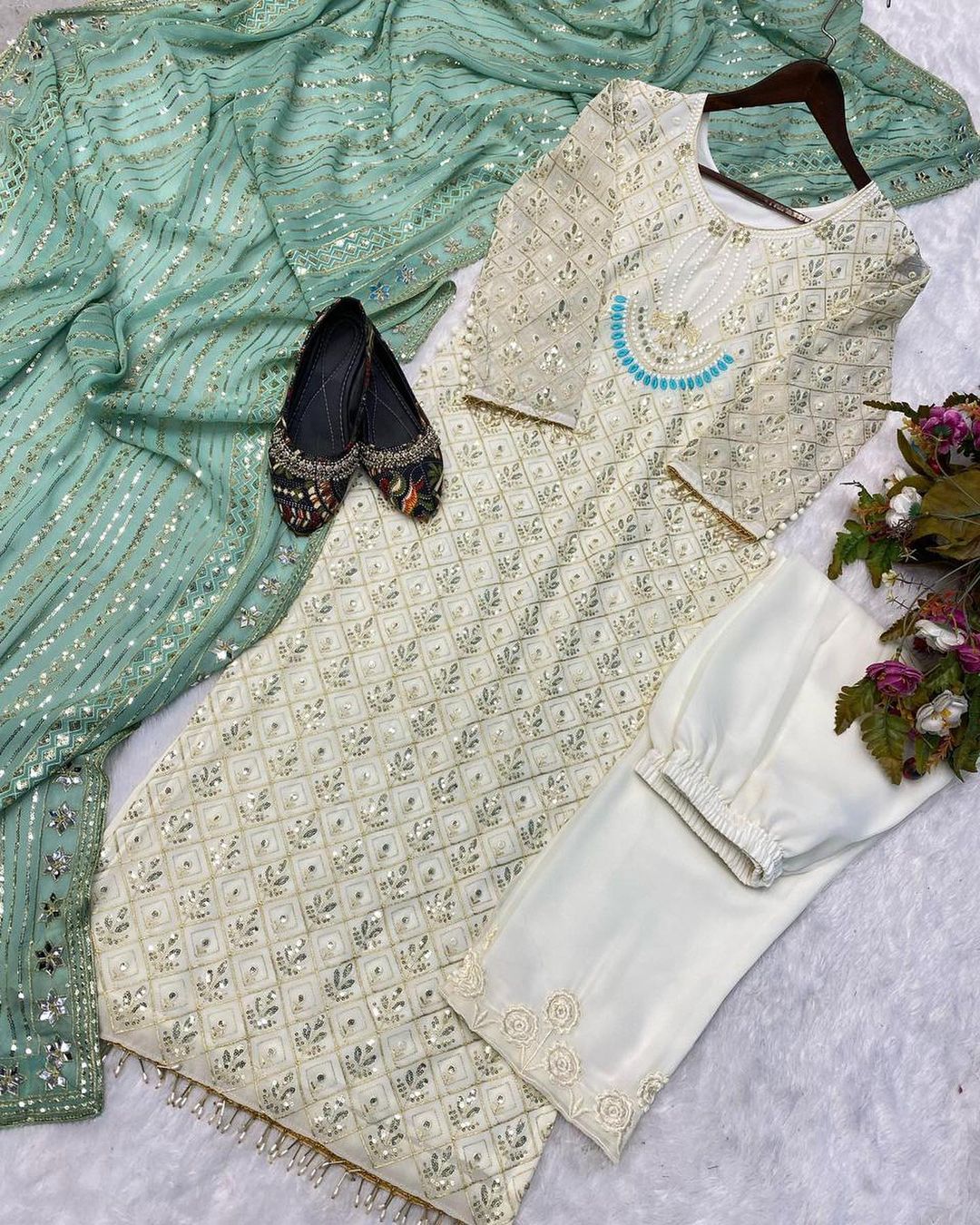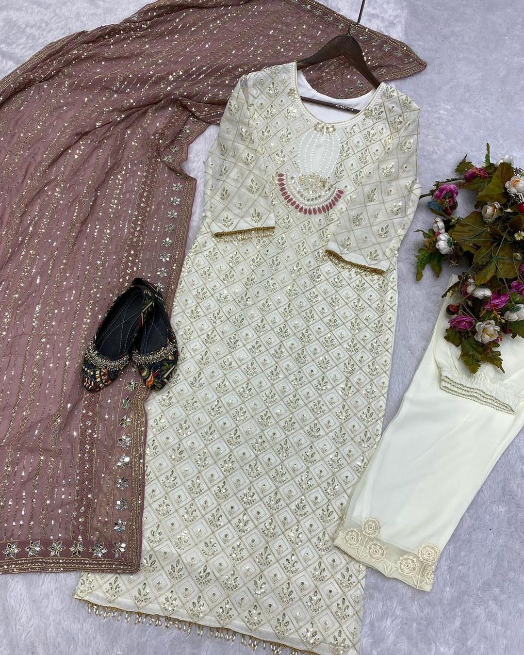 DESIRABLE FANCY GEORGETTE SEQUENCE EMBROIDERED WORK TOP AND PENT WITH DUPATTA