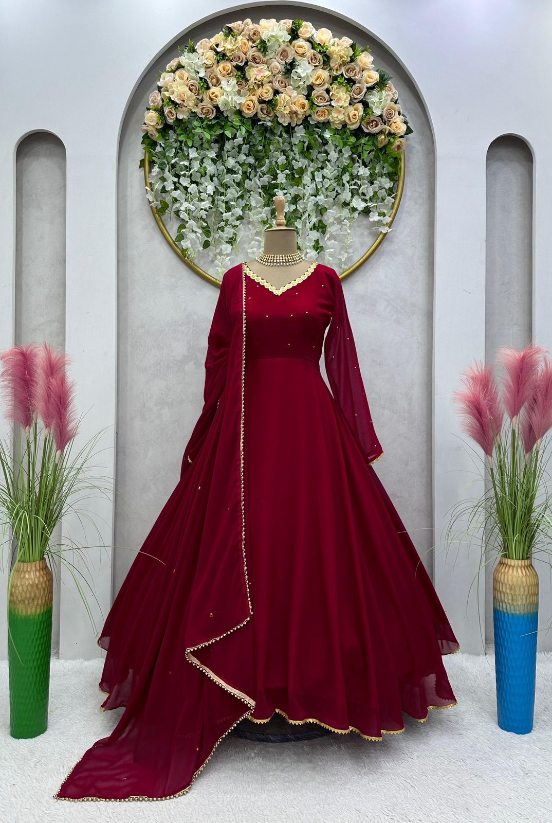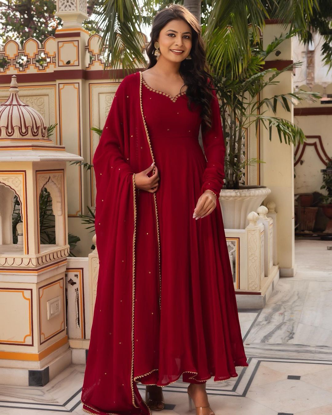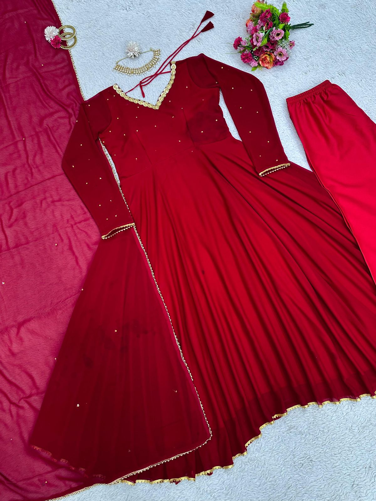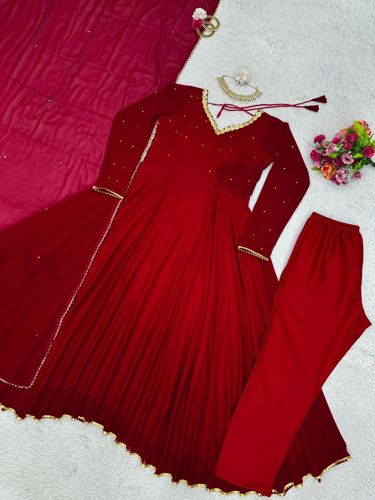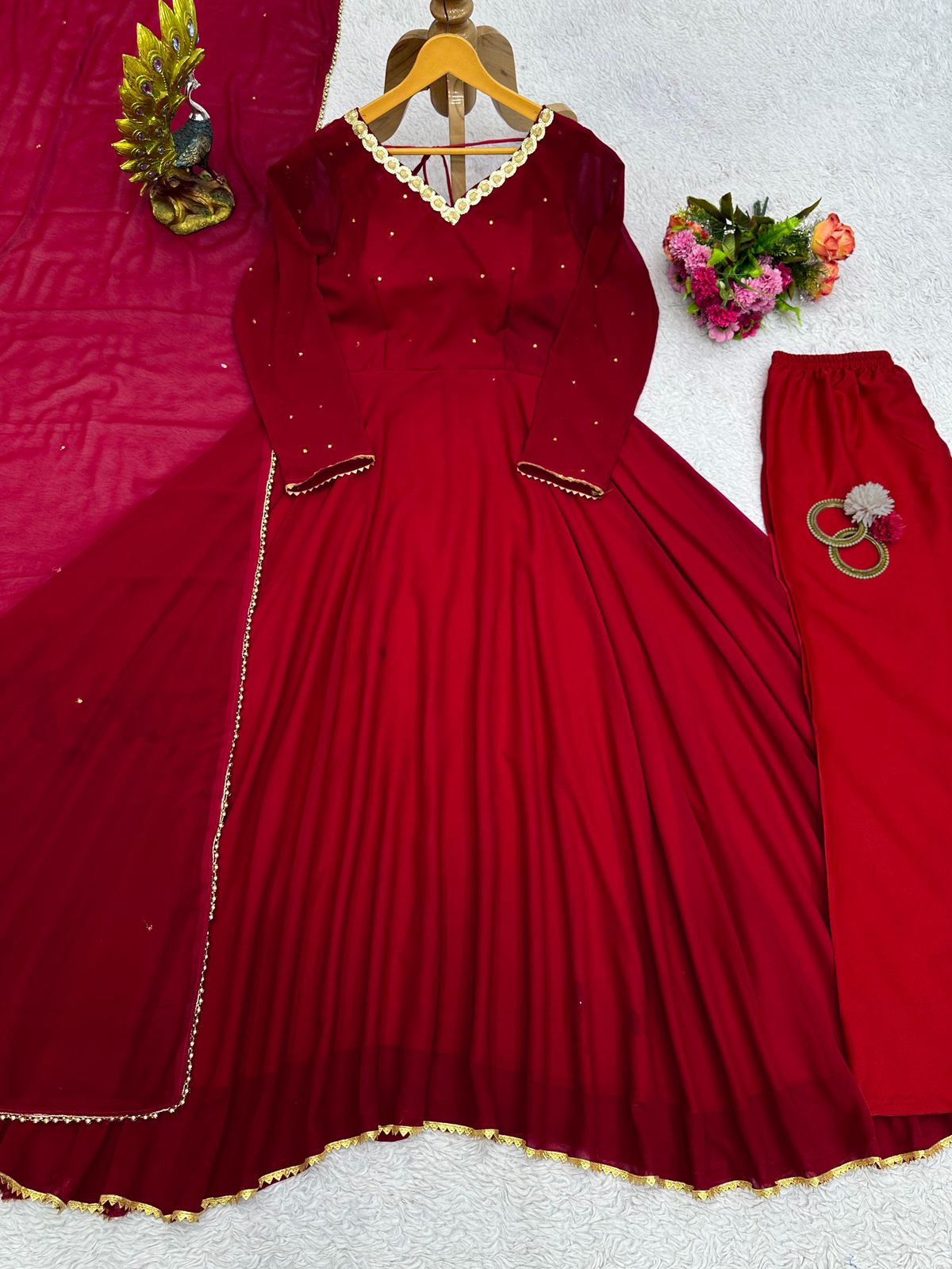 Looking for this same colour beautiful Designer Suit on Georgette fabric with Inner and Sequnce With Ston work and Pent on also Crep Febric and Dupatta on also Faux Georgette Frbeic With Moti Lace work with Stone work.