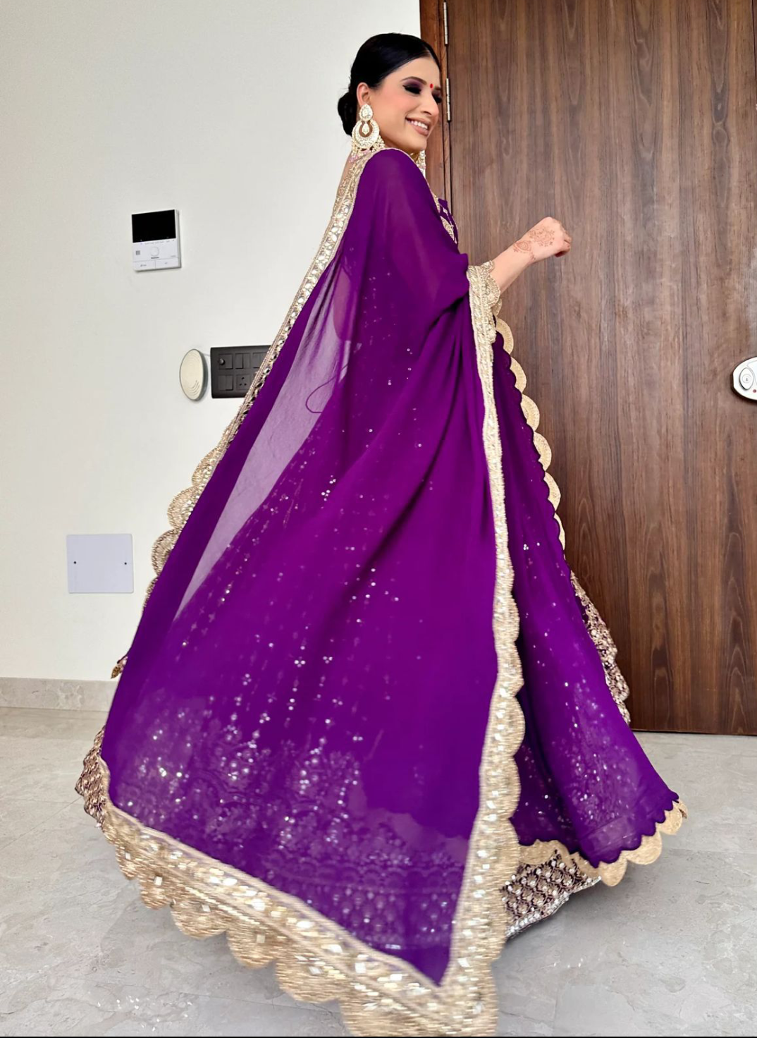 And if not anything, then to do justice to this beautiful, georgette, embroidered with sequence suit. It's something that just HAS to be in your closet! The border details are just wow