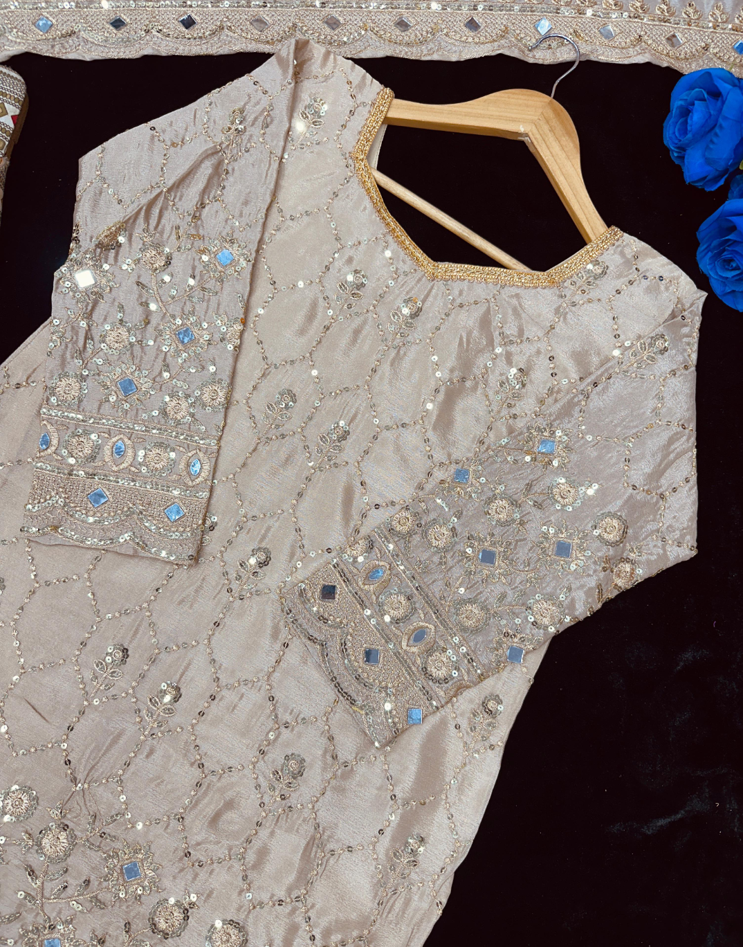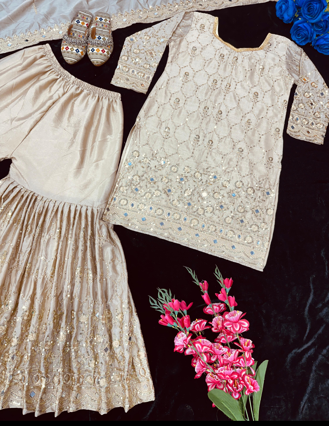 TOP FABRIC : HEAVY CHINON SILK WITH HAVY EMBROIDERY WORK AND REAL MIRROR WORK