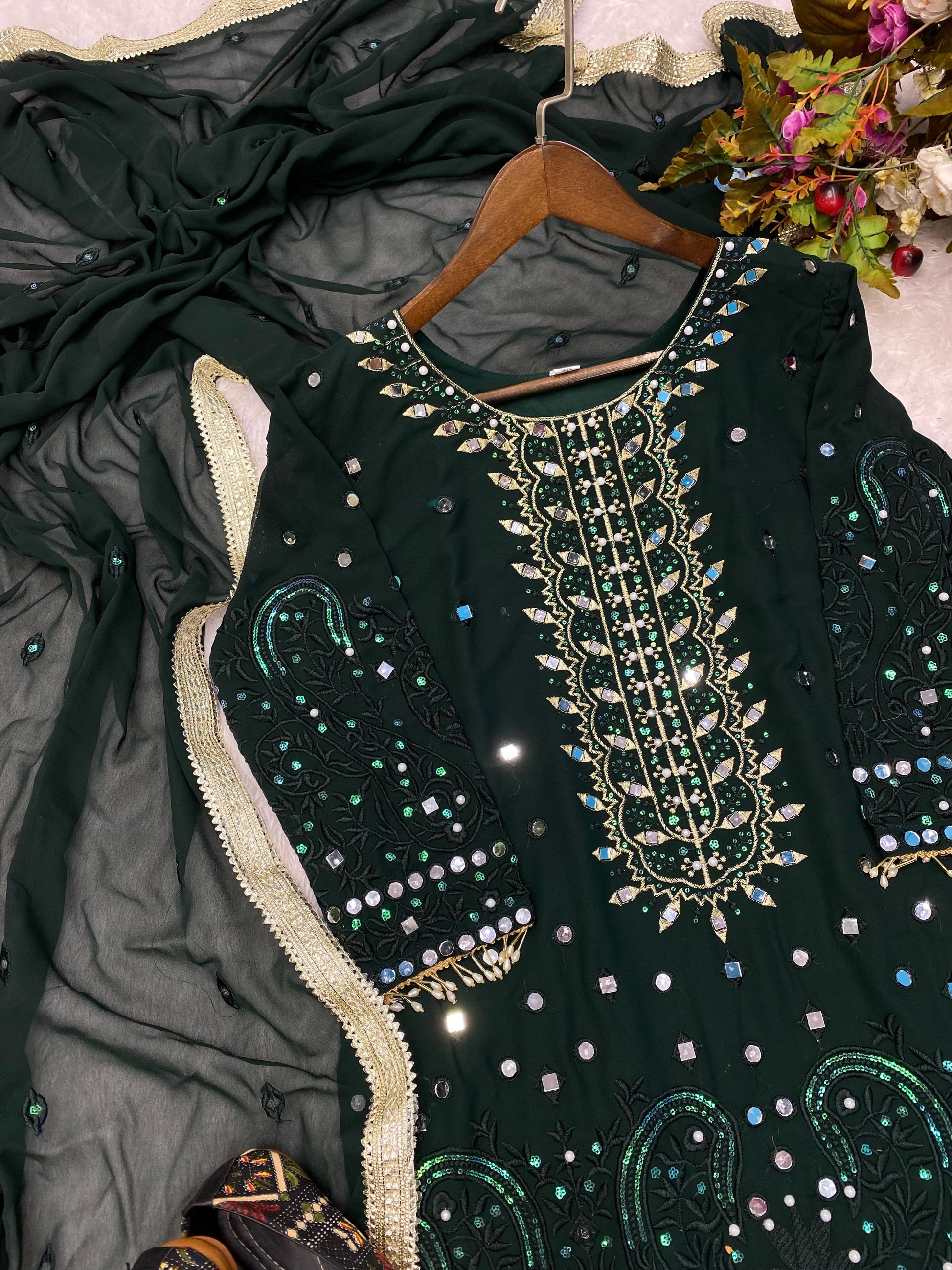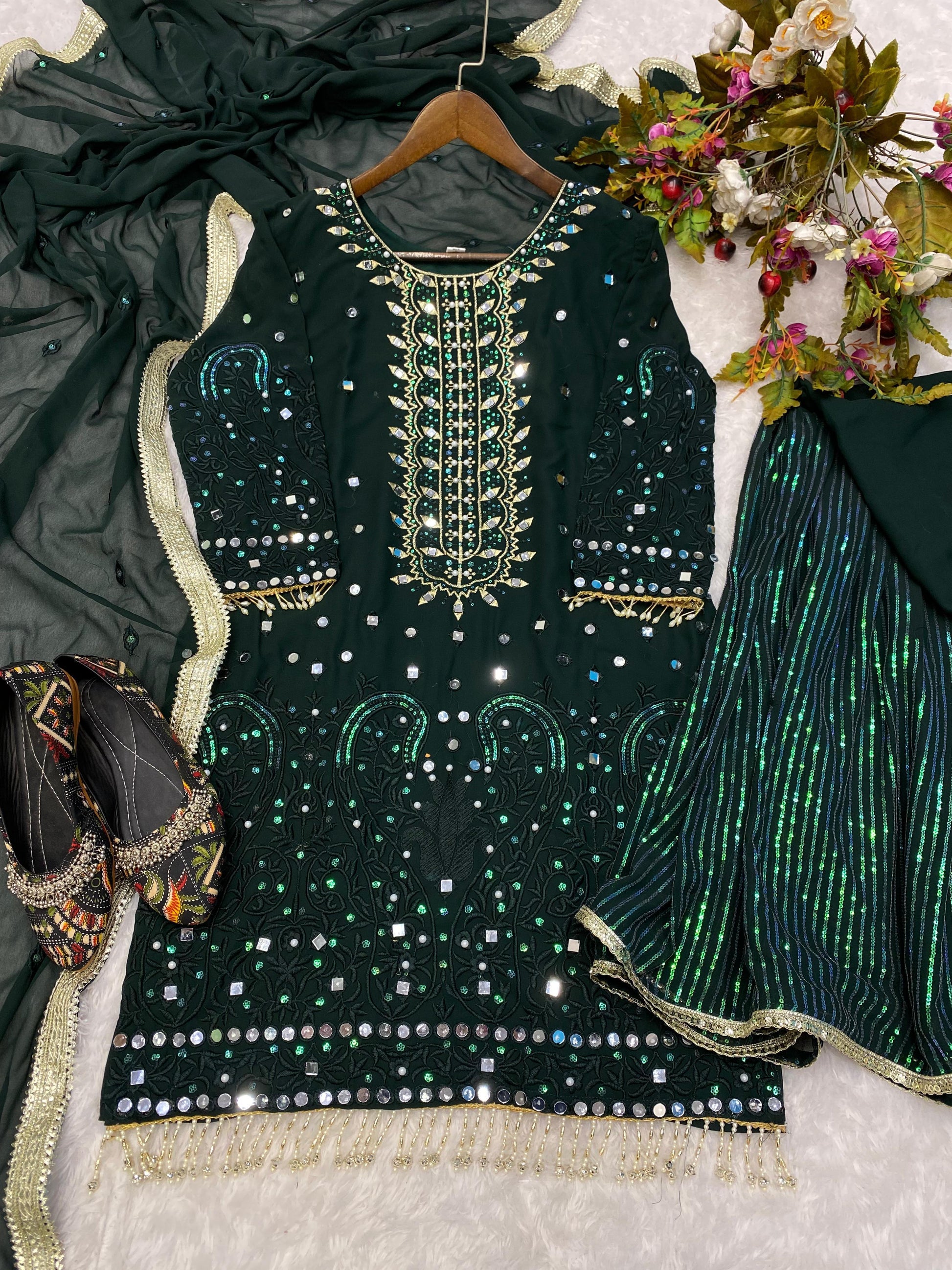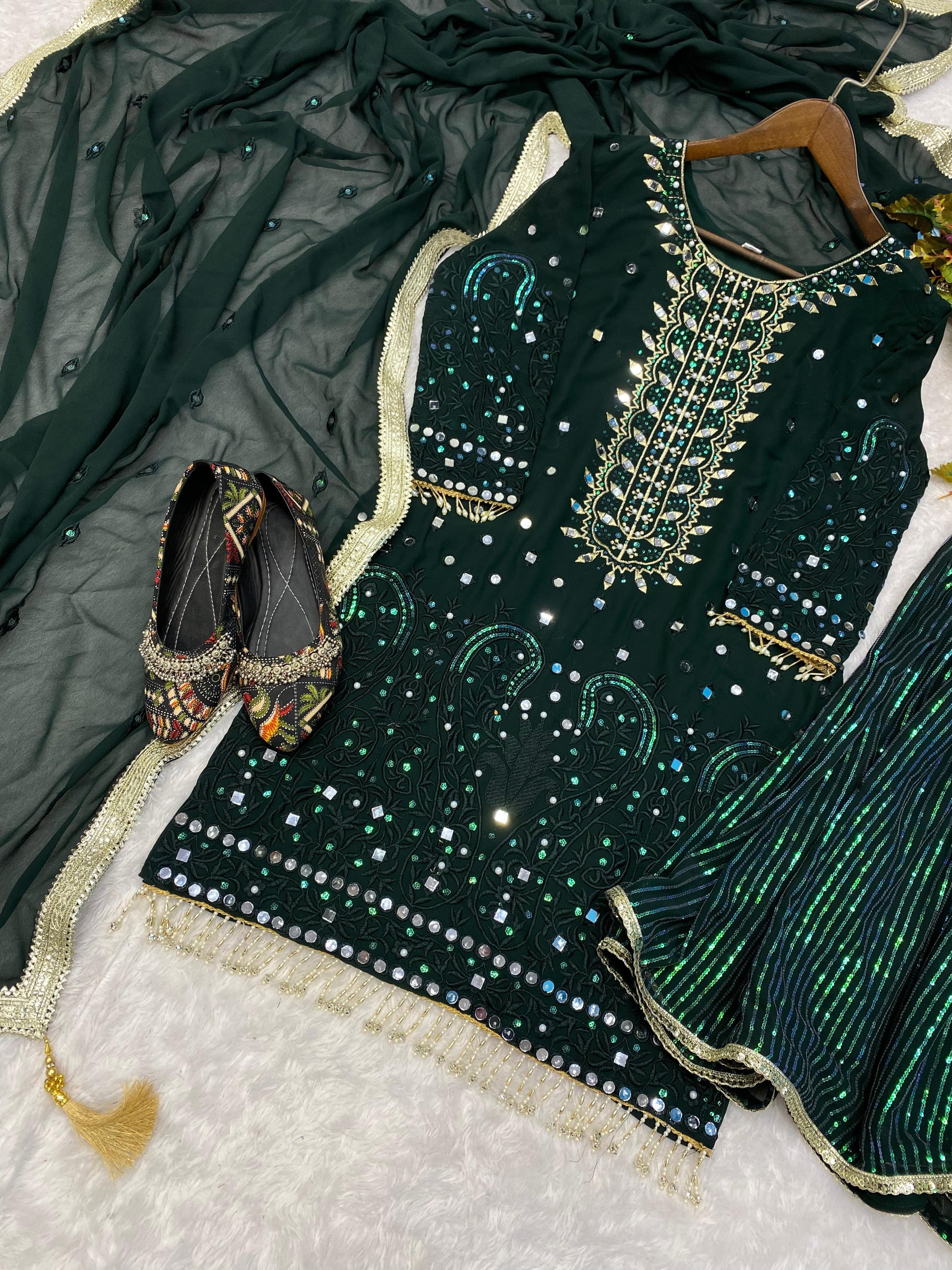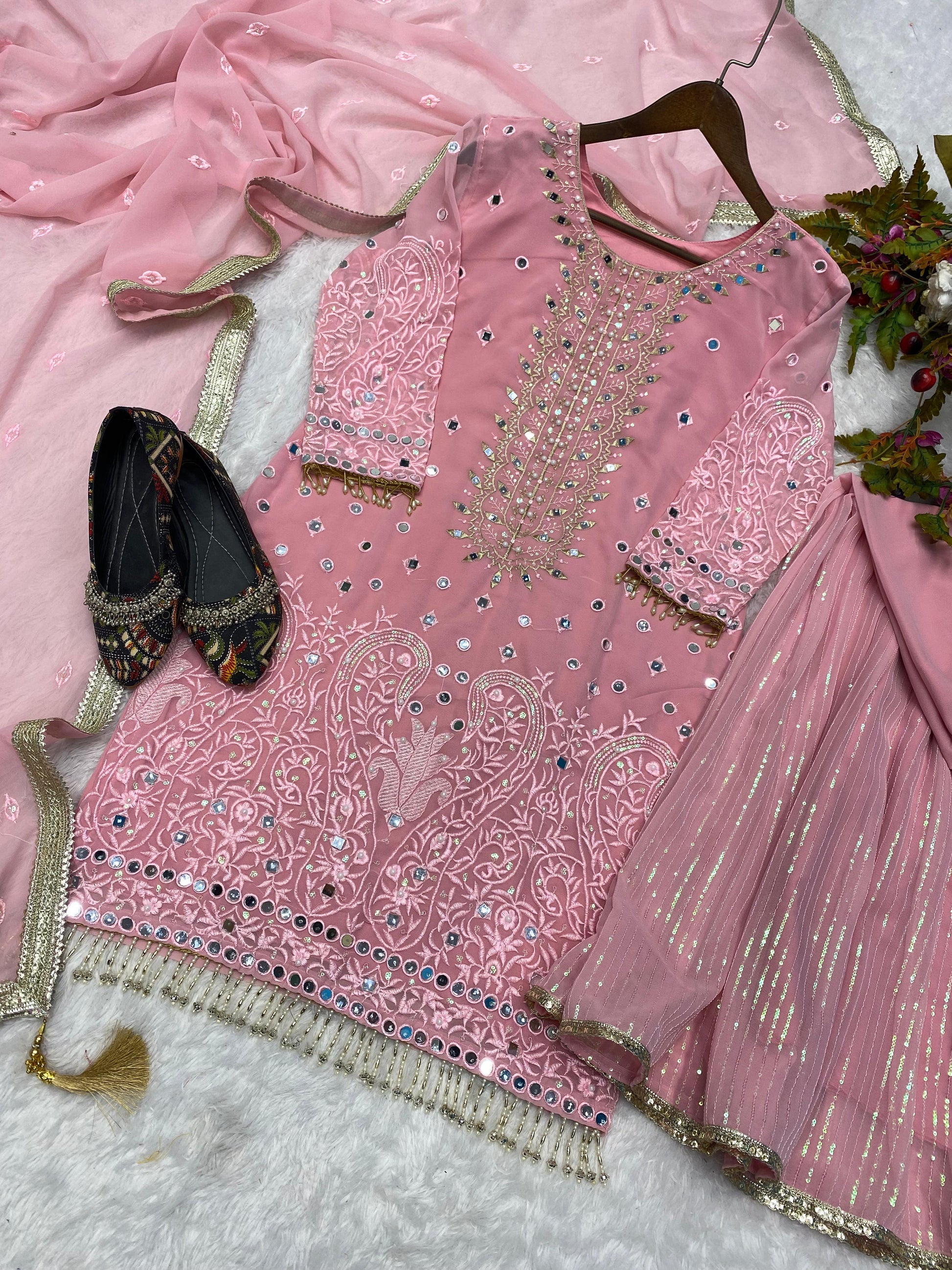 EXCLUSIVE DESIGNER HEAVY GEORGETTE SEQUENCE WORK SUIT WITH FULL FLAIR WORK GHARARA