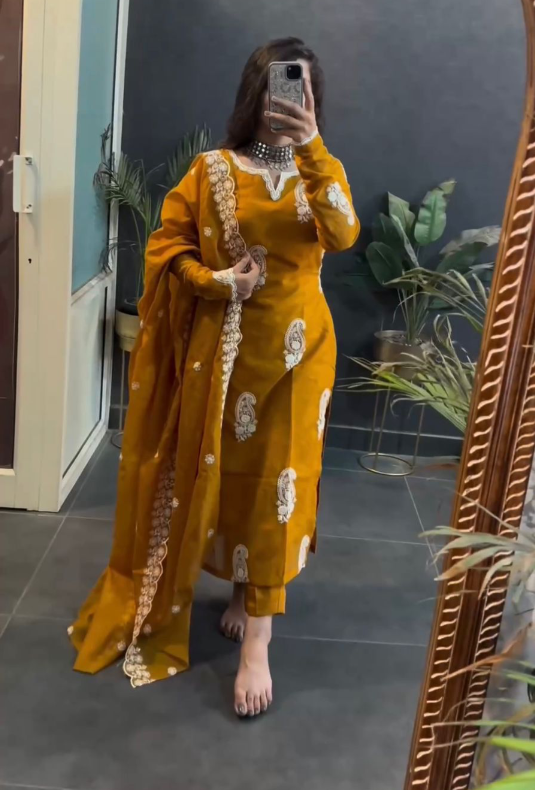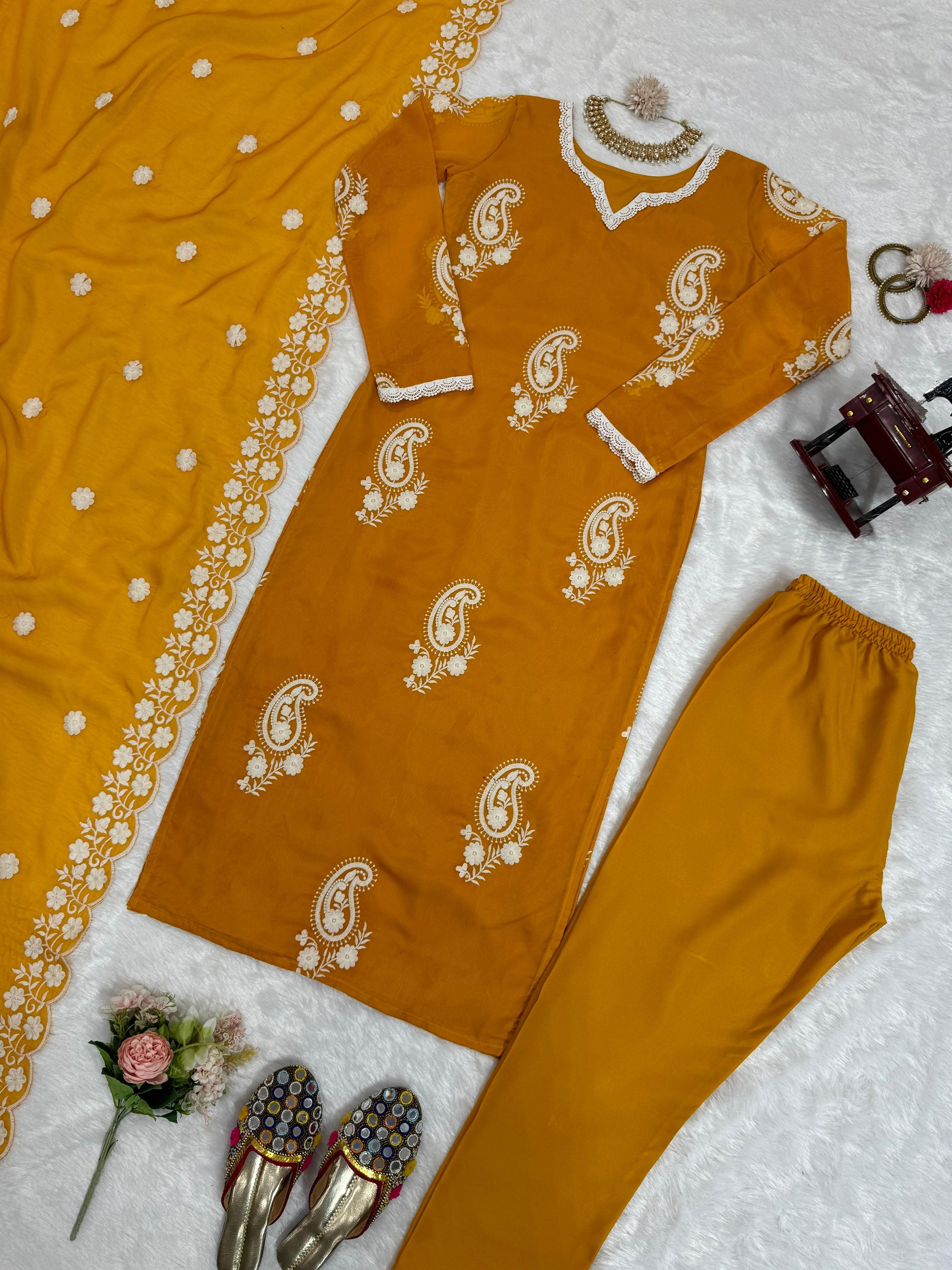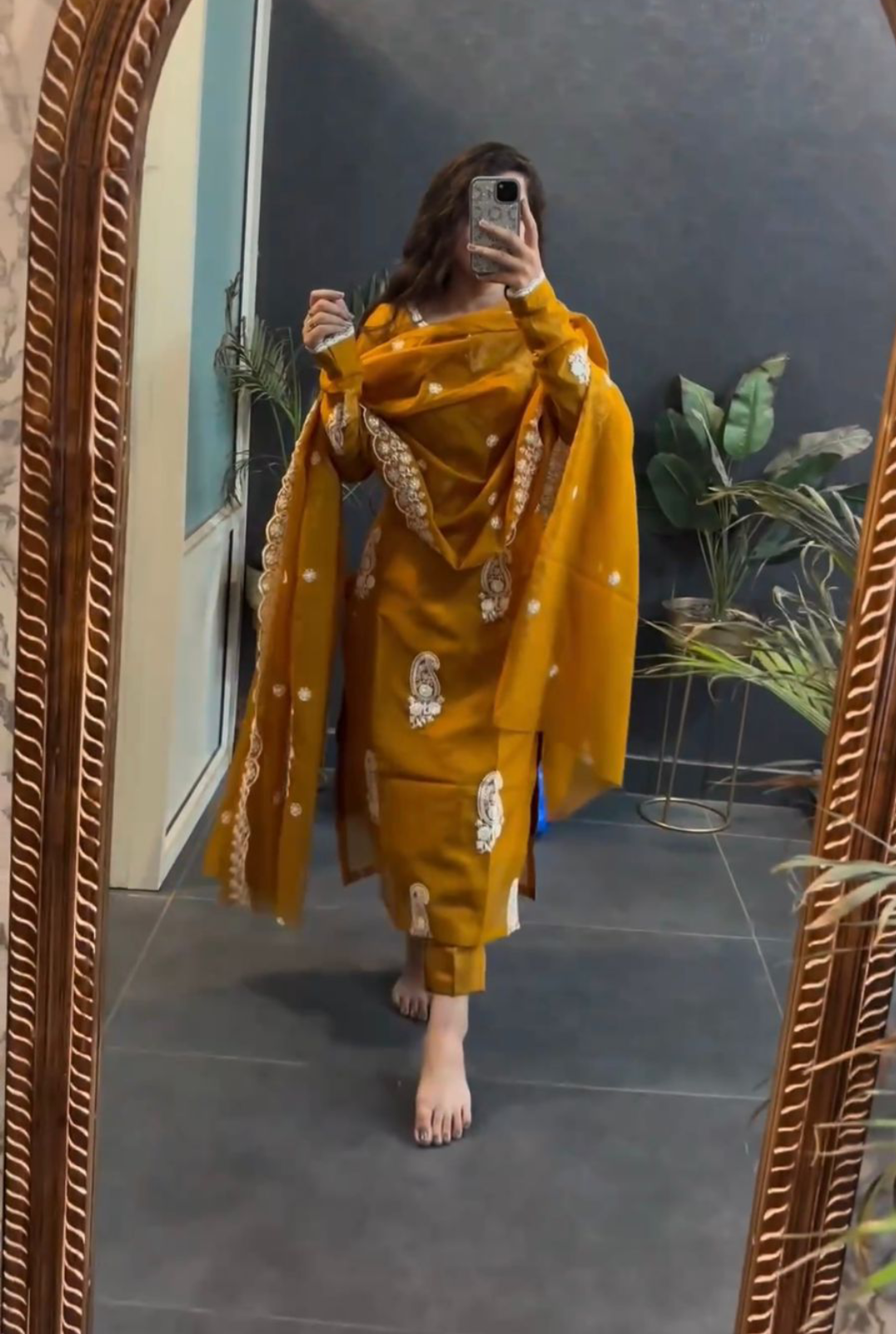 Looking for this same colour beautiful Designer Suit On Tibby Silk febric with inner and Thred work and Pent on Crep Febric and Dupatta on also Tibby Silk Febric with Thred work.