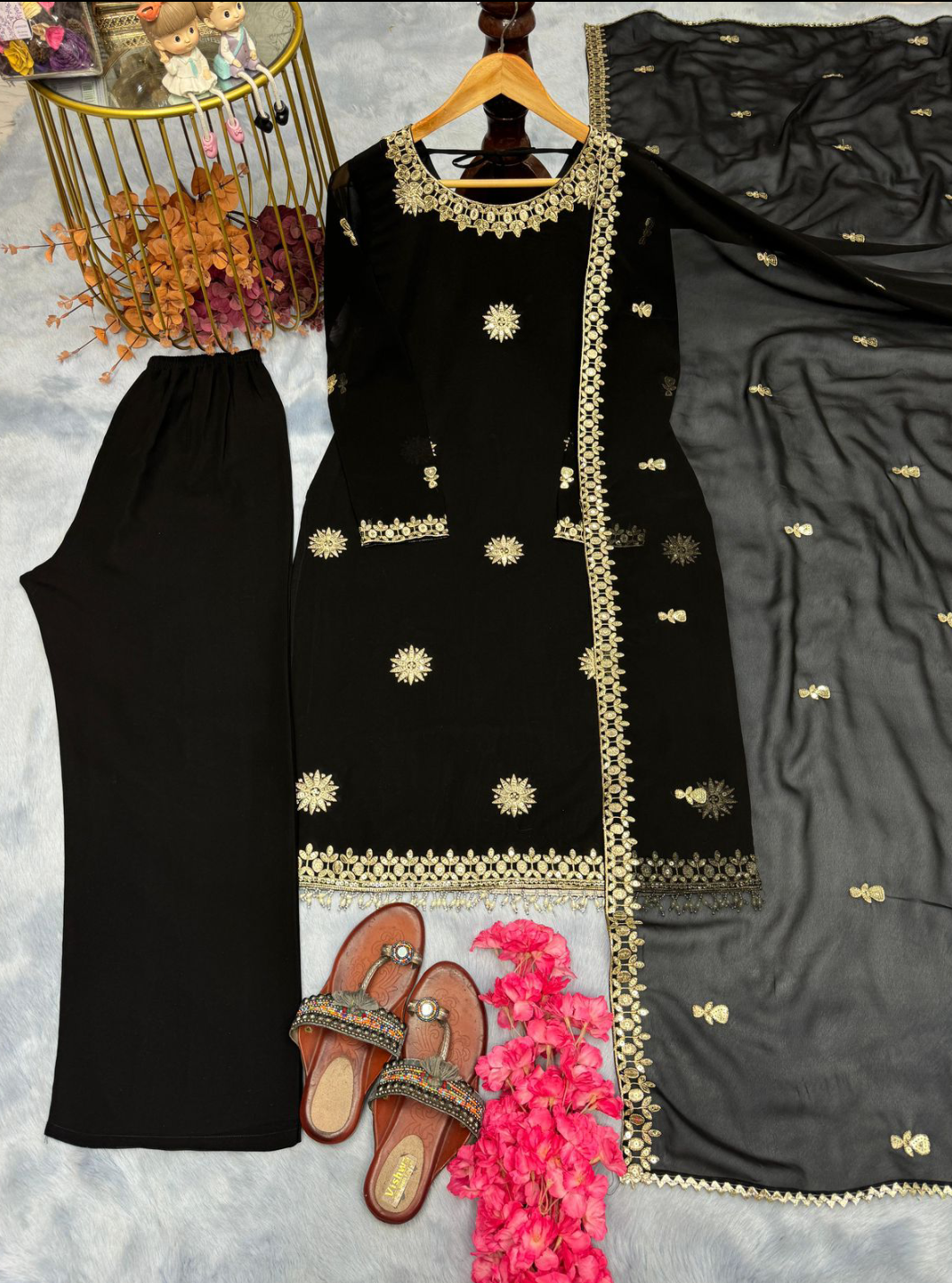 Launching New Designer Party Wear Look Blooming Georgette Top Plazzo & Dupatta Set