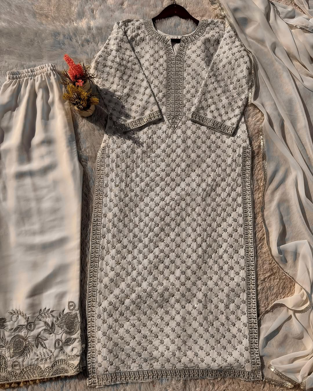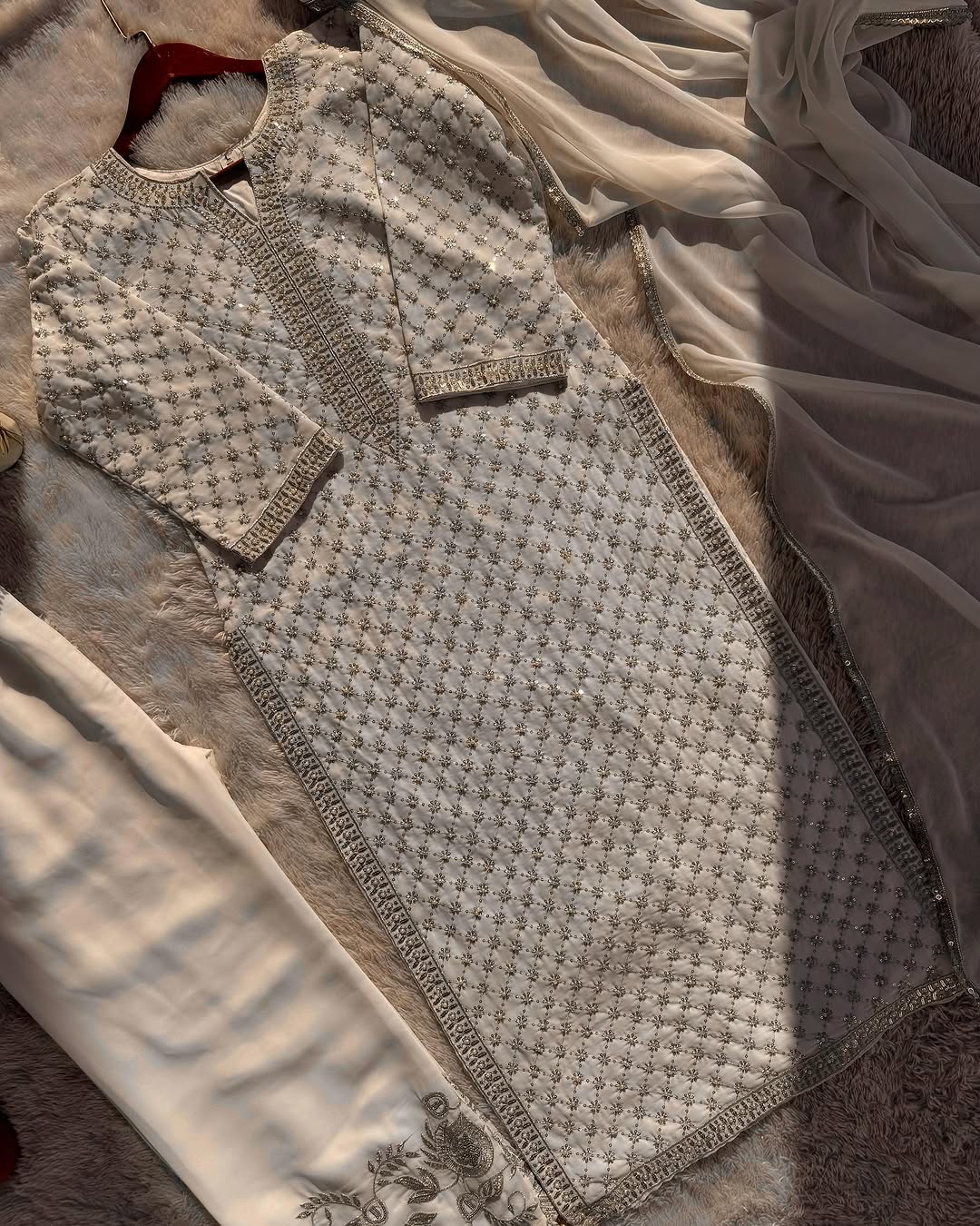 DESIRABLE FANCY GEORGETTE WITH SEQUENCE EMBROIDERED AND MOTI HANDMADE WORK TOP AND PANT WITH DUPATTA