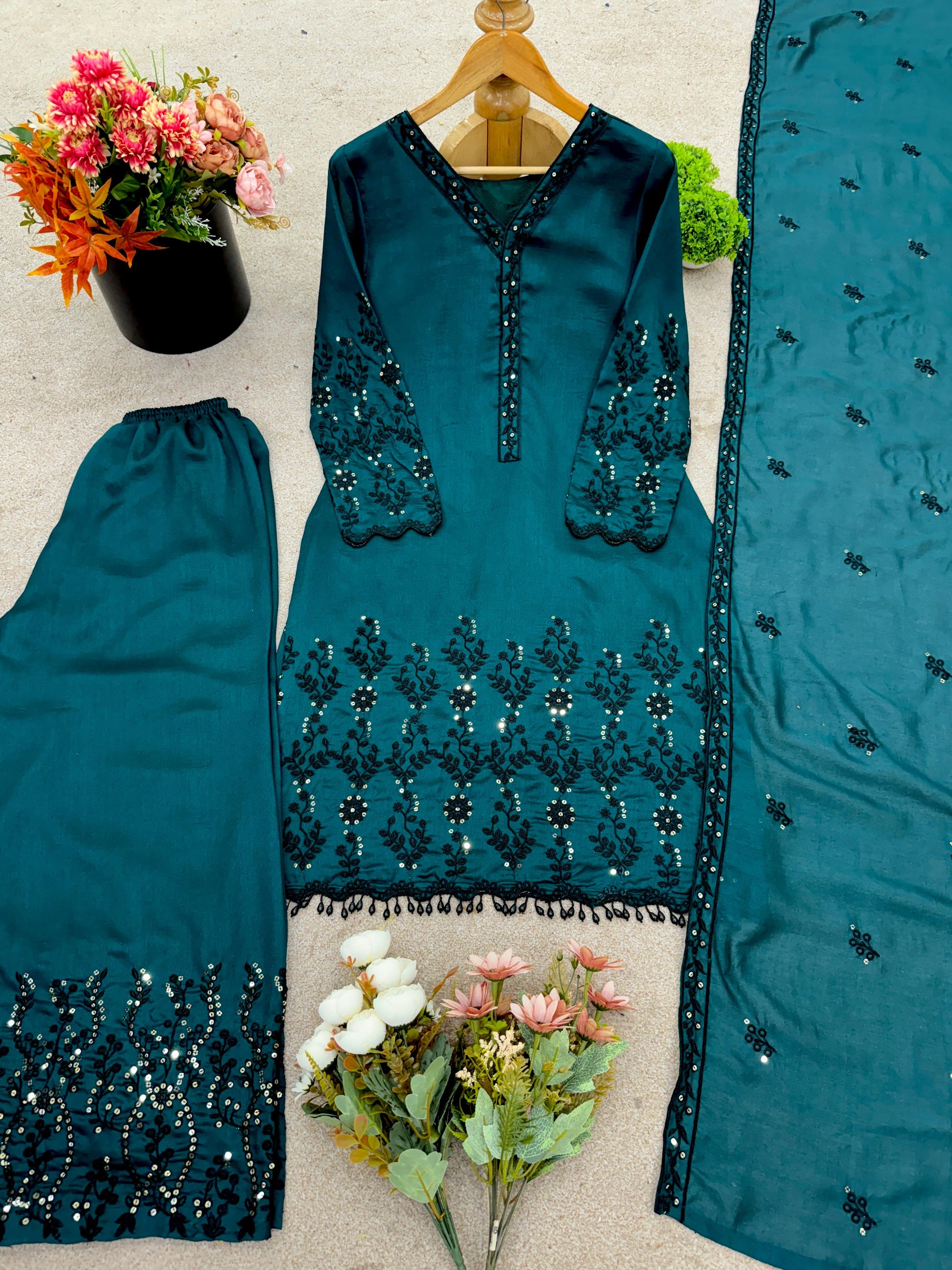 Bottom (Plazzo): Made from matching Vichitra Silk with embroidery and sequin detailing.