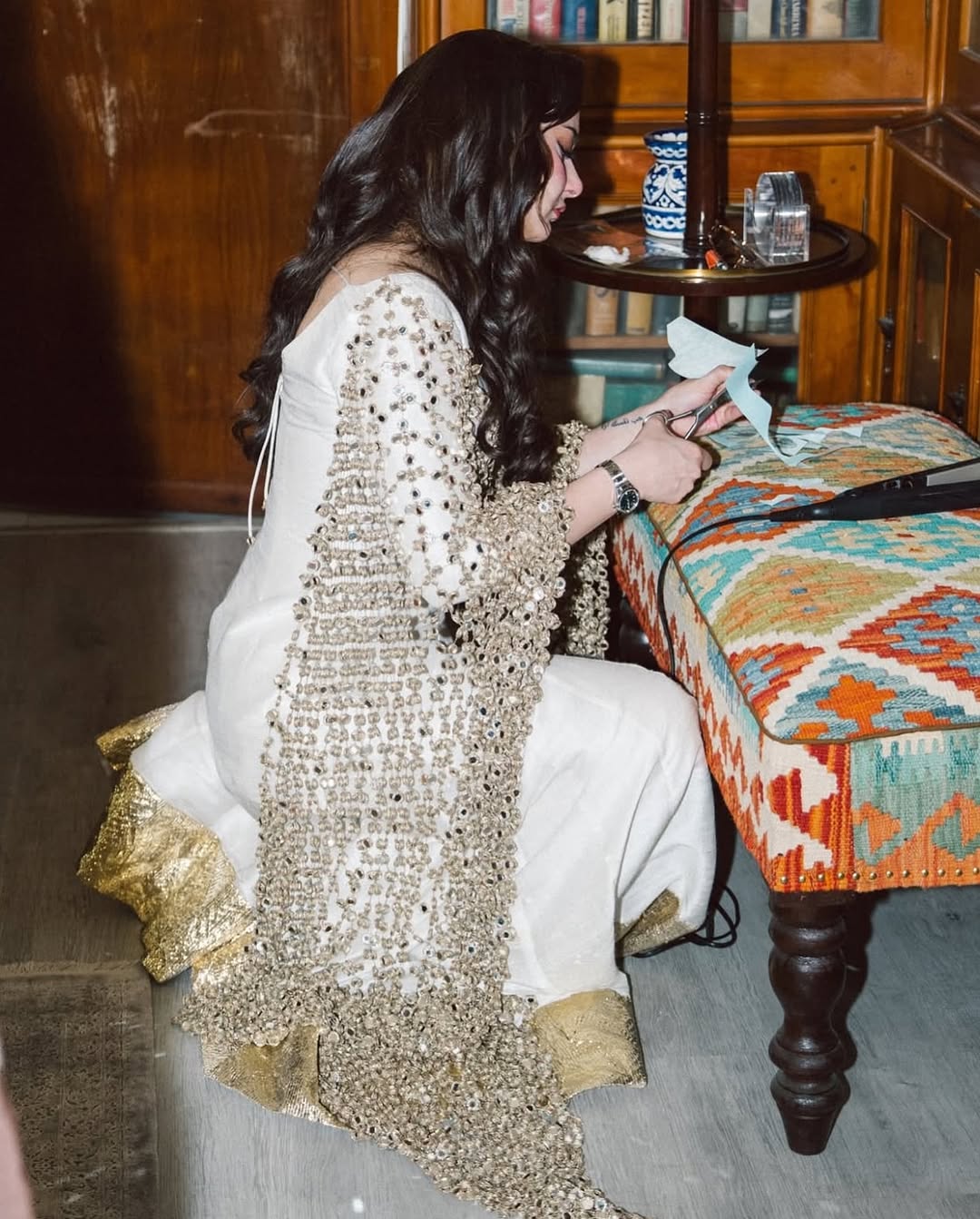 Unveil the elegance of tradition with this 2.7 yards long mirror dupatta, intricately adorned with pure handcrafted mirror work (sheesh) — a timeless art form passed down through generations. Every mirror is hand-stitched with finesse, reflecting unmatched craftsmanship and royal charm.