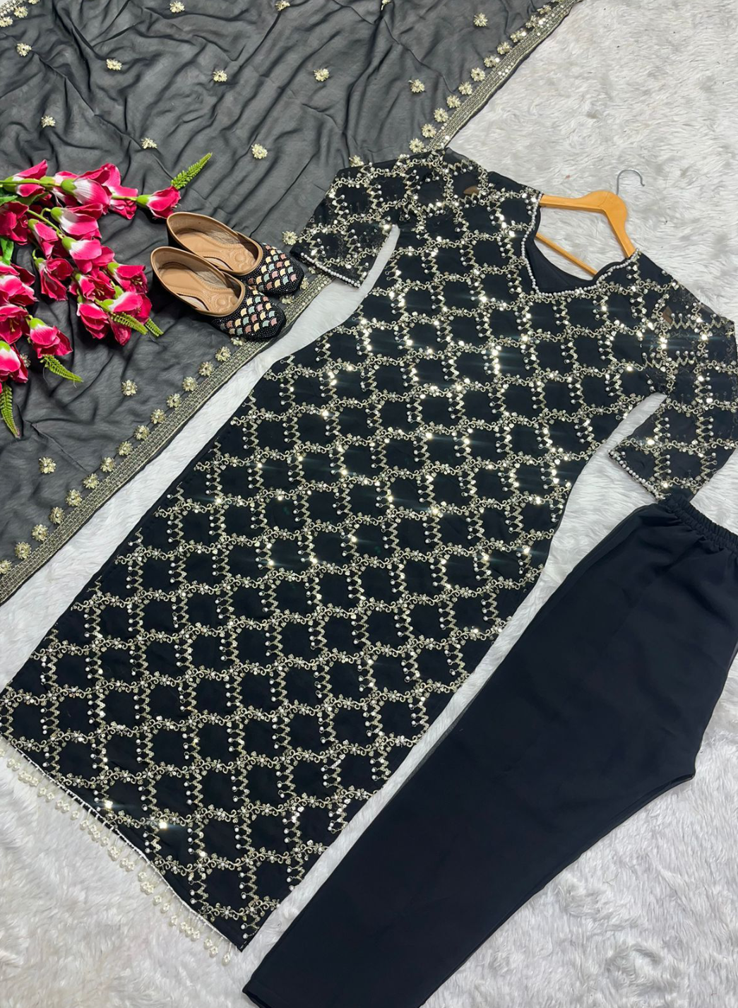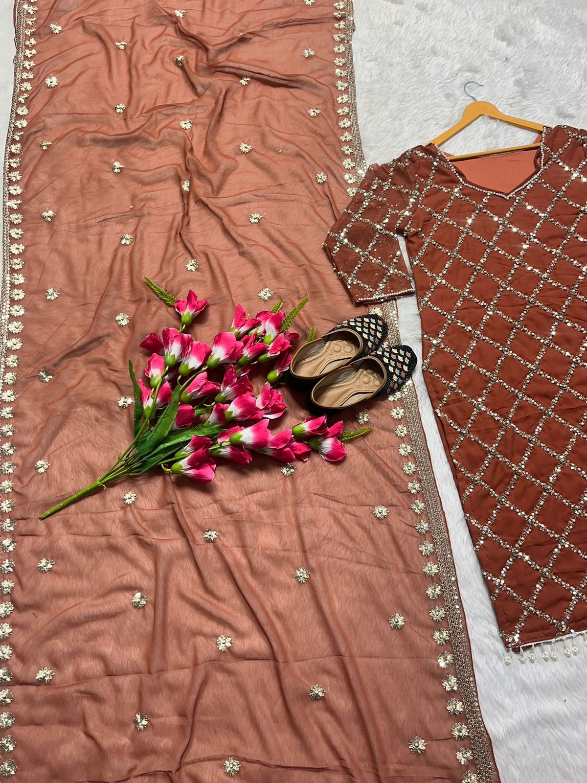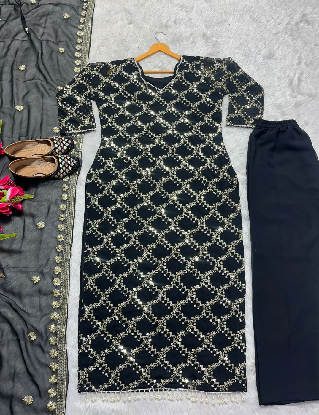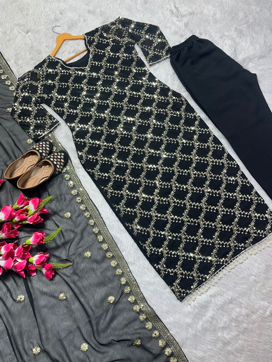 DESIRABLE FANCY GEORGETTE SEQUENCE EMBROIDERED WORK TOP AND PENT WITH DUPATTA