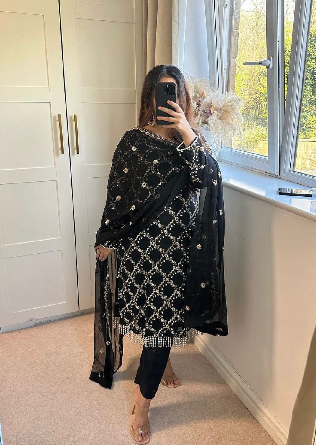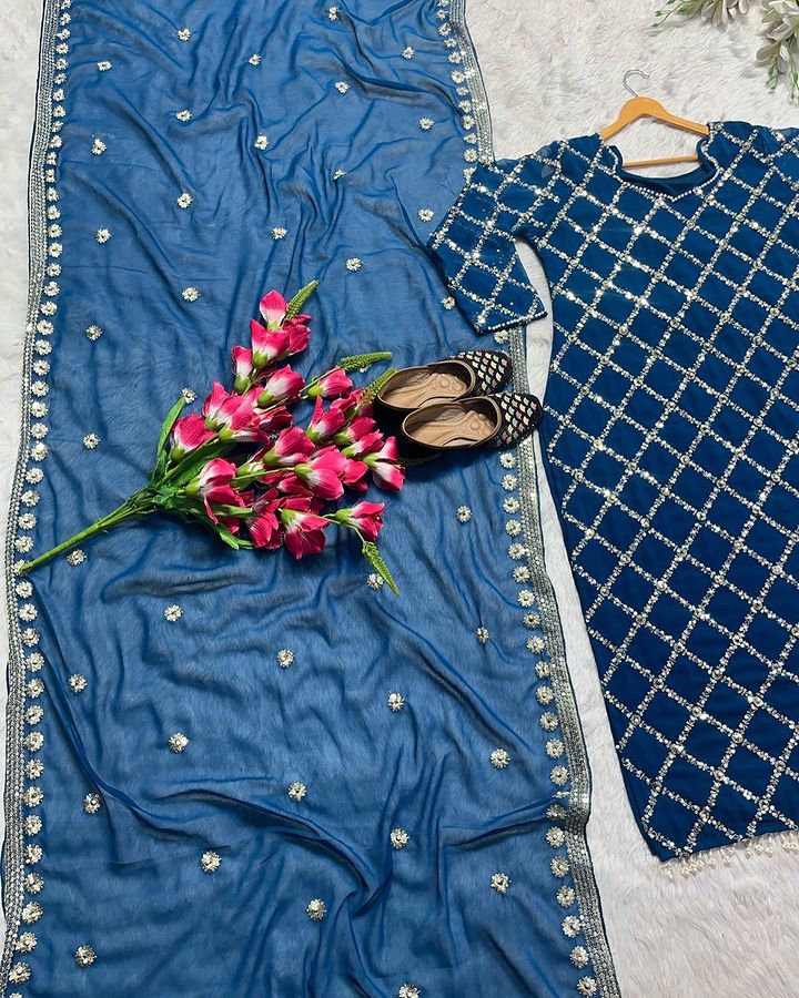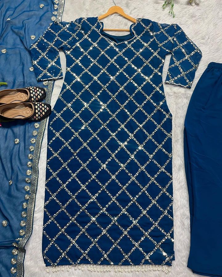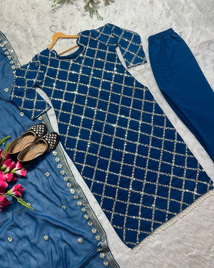 DESIRABLE FANCY GEORGETTE SEQUENCE EMBROIDERED WORK TOP AND PENT WITH DUPATTA