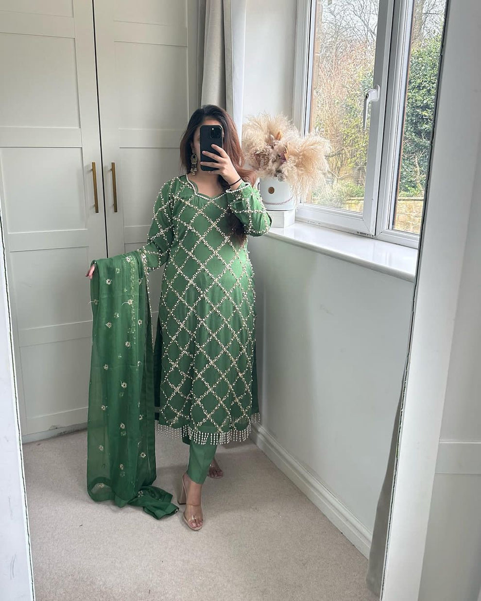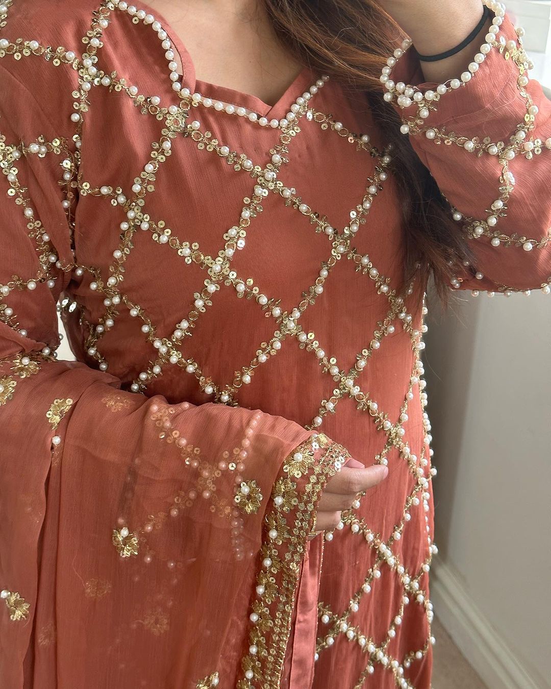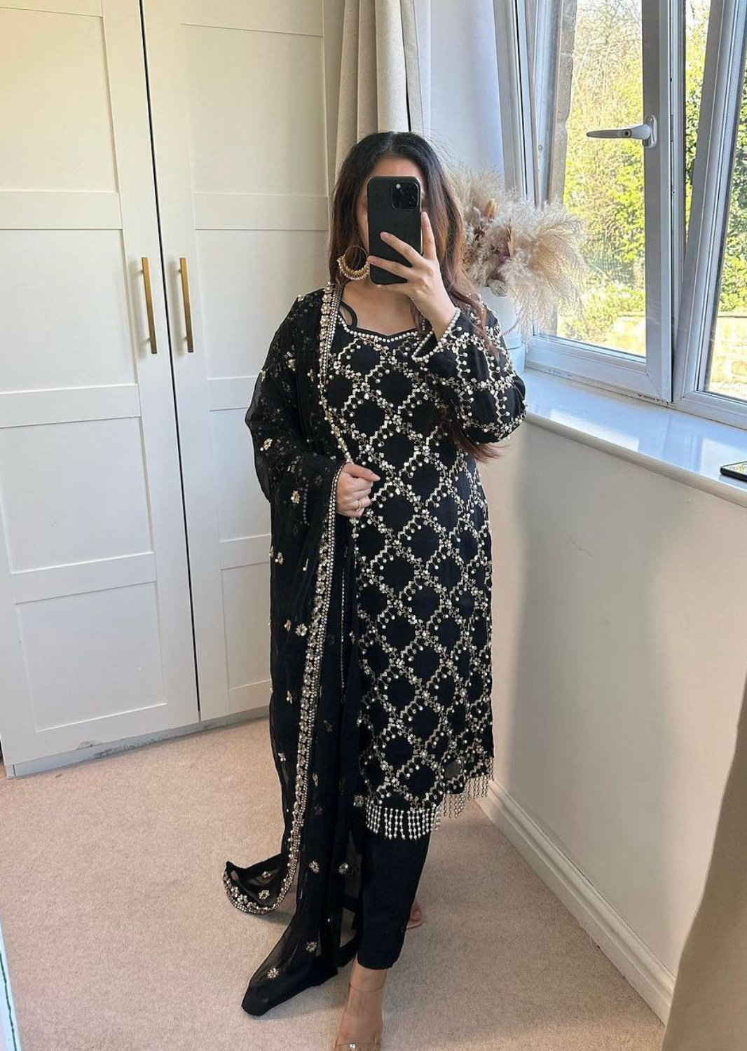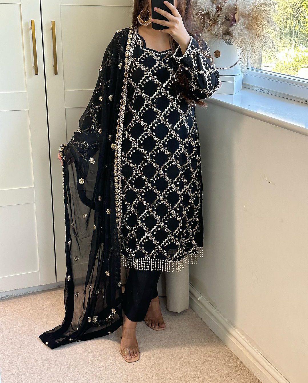 DESIRABLE FANCY GEORGETTE SEQUENCE EMBROIDERED WORK TOP AND PENT WITH DUPATTA
