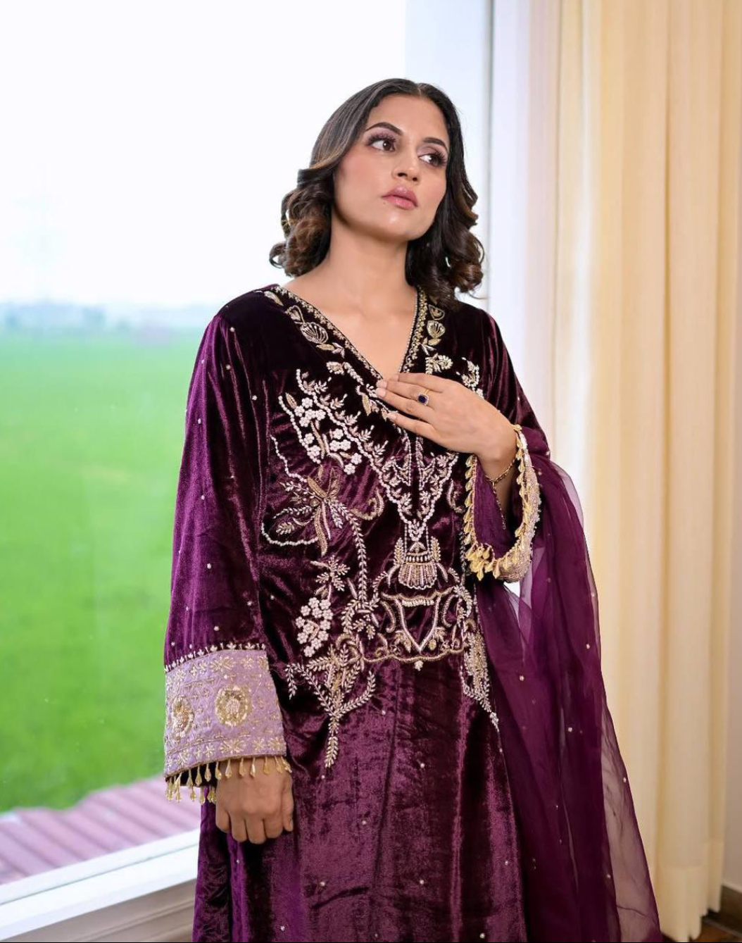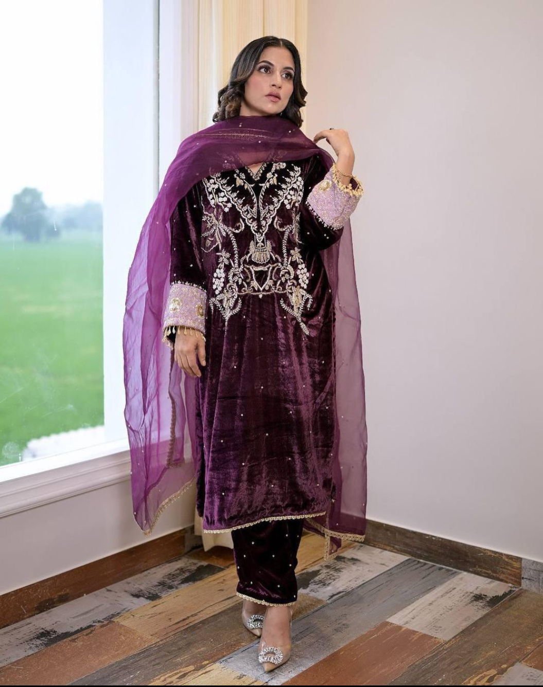 FOR THIS WINTER SEASON WEAR DESIGNER STYLE VELVET SEQUENCE EMBROIDERY WORK SUIT WITH DUPATTA
