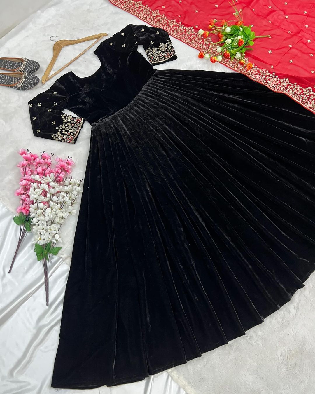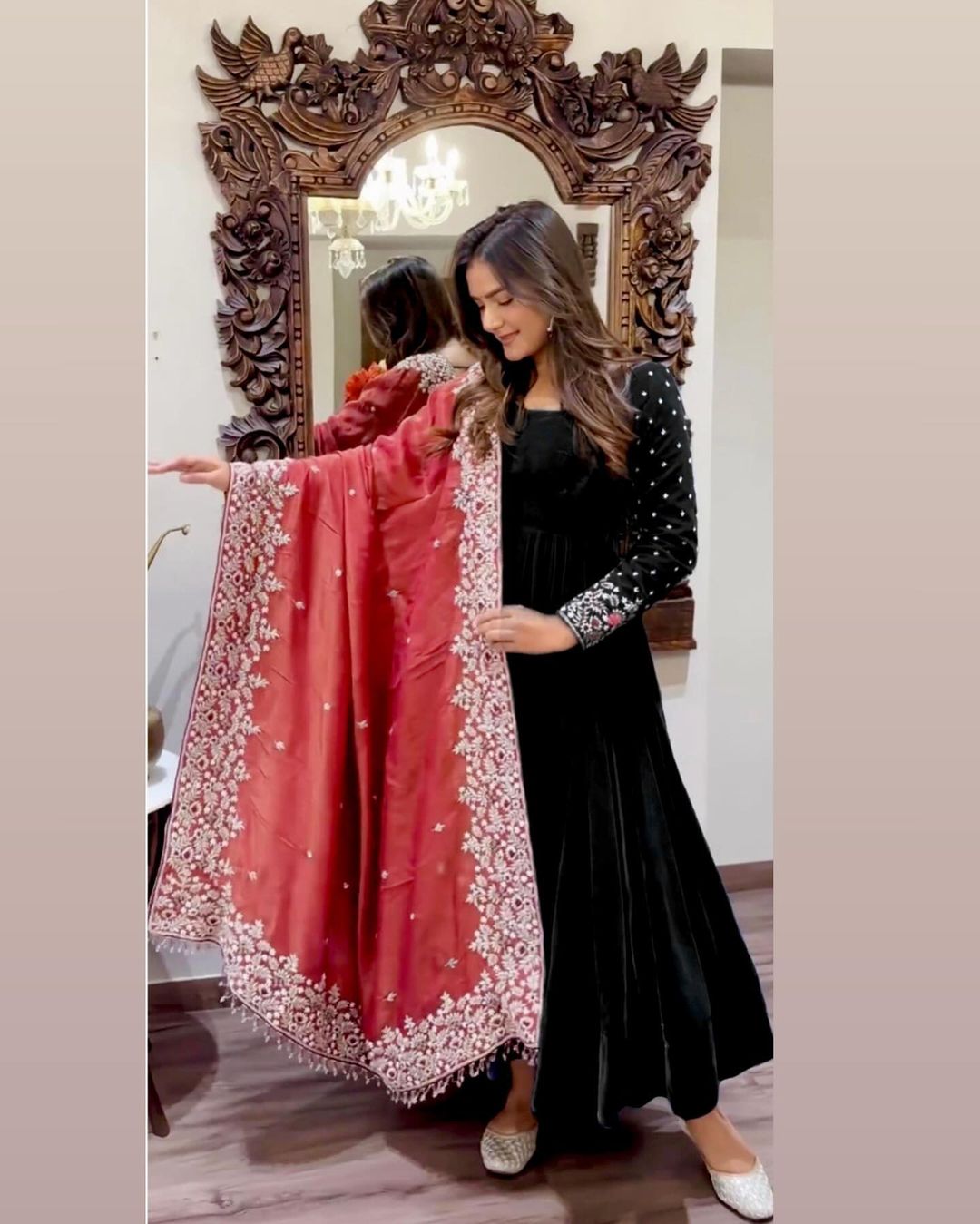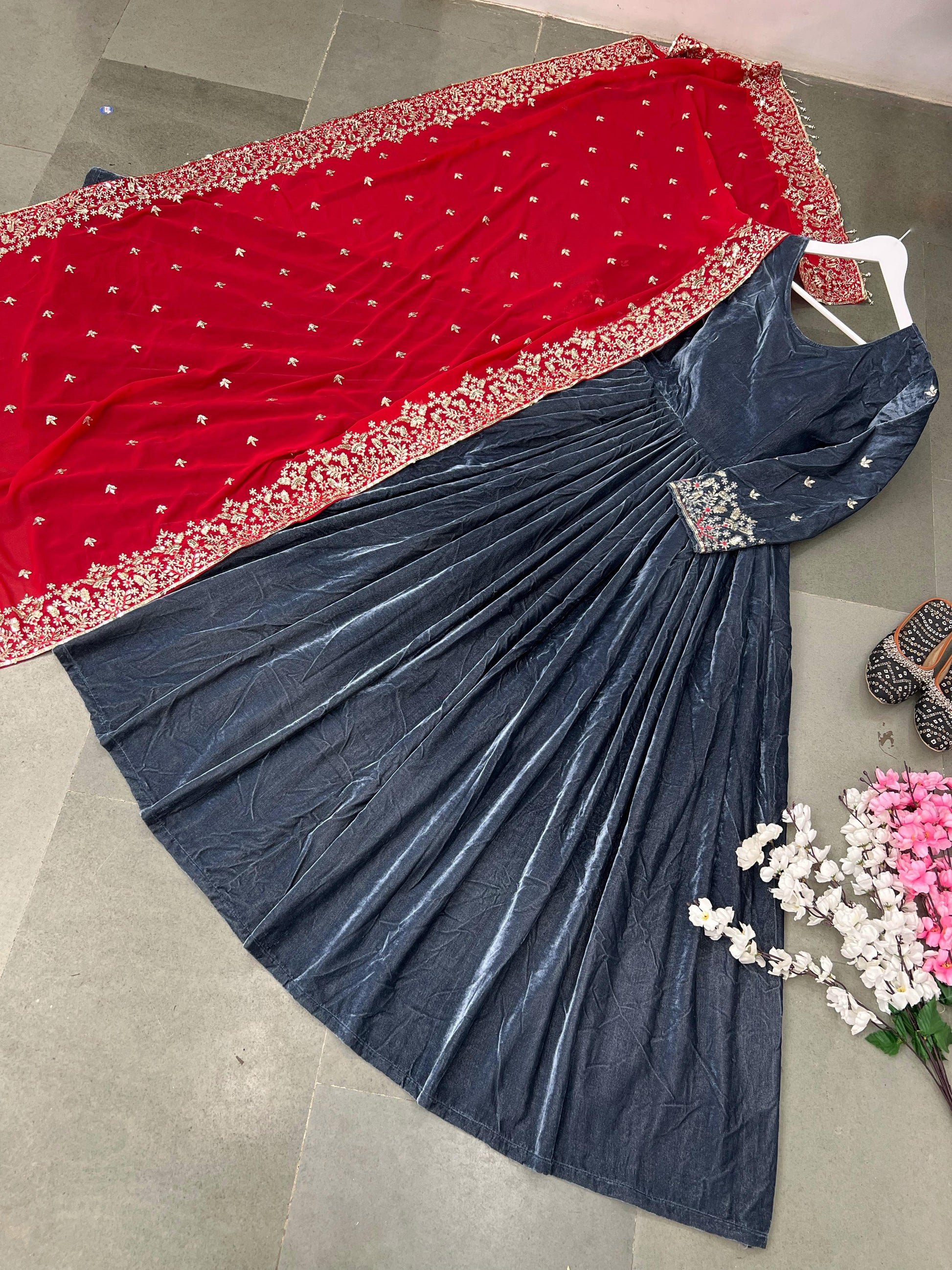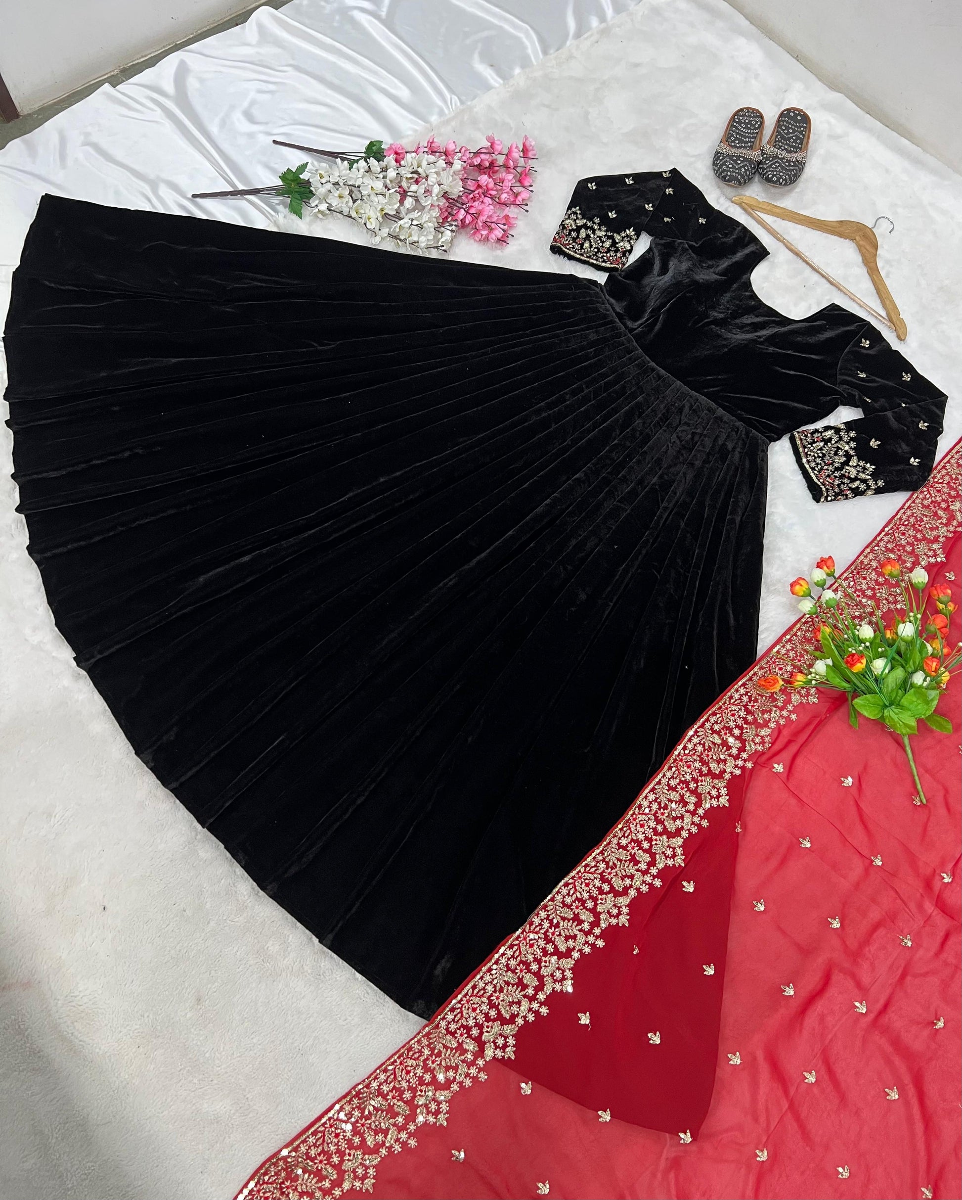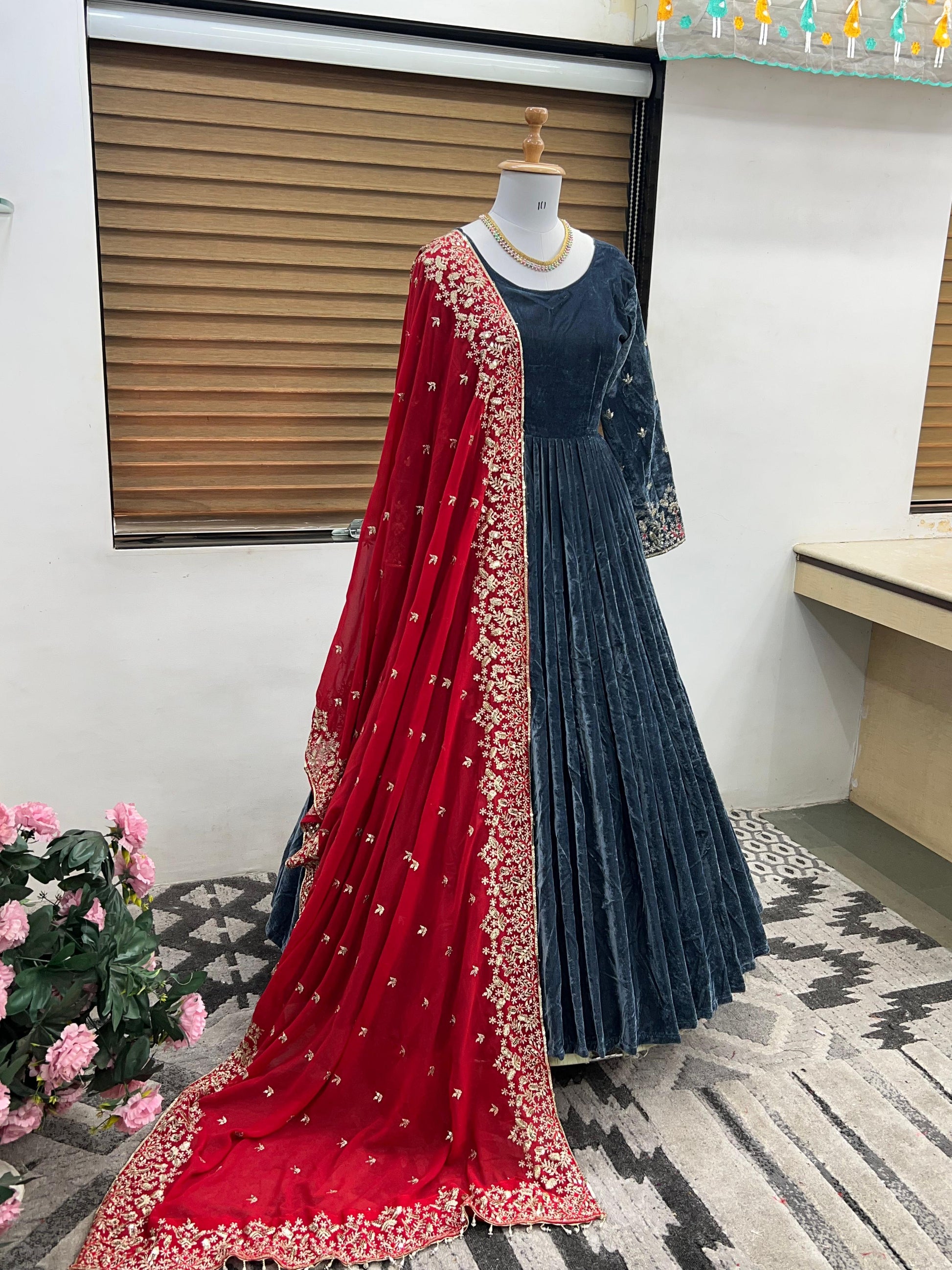 Launching New Designer Party Wear Look Velvet Gown With Dupatta Ready To Wear Collection