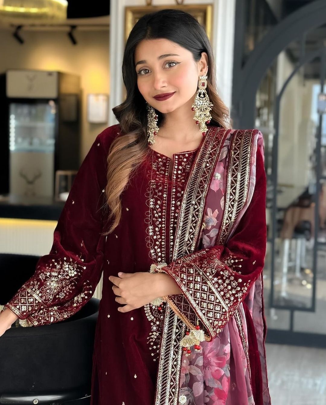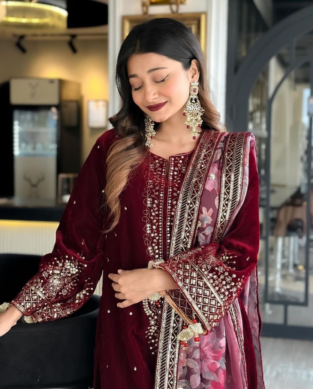 Top Fabric : Heavy Viscose Velvet, featuring intricate 5 mm sequin embroidery, stylish latkan, and fancy bell sleeves.